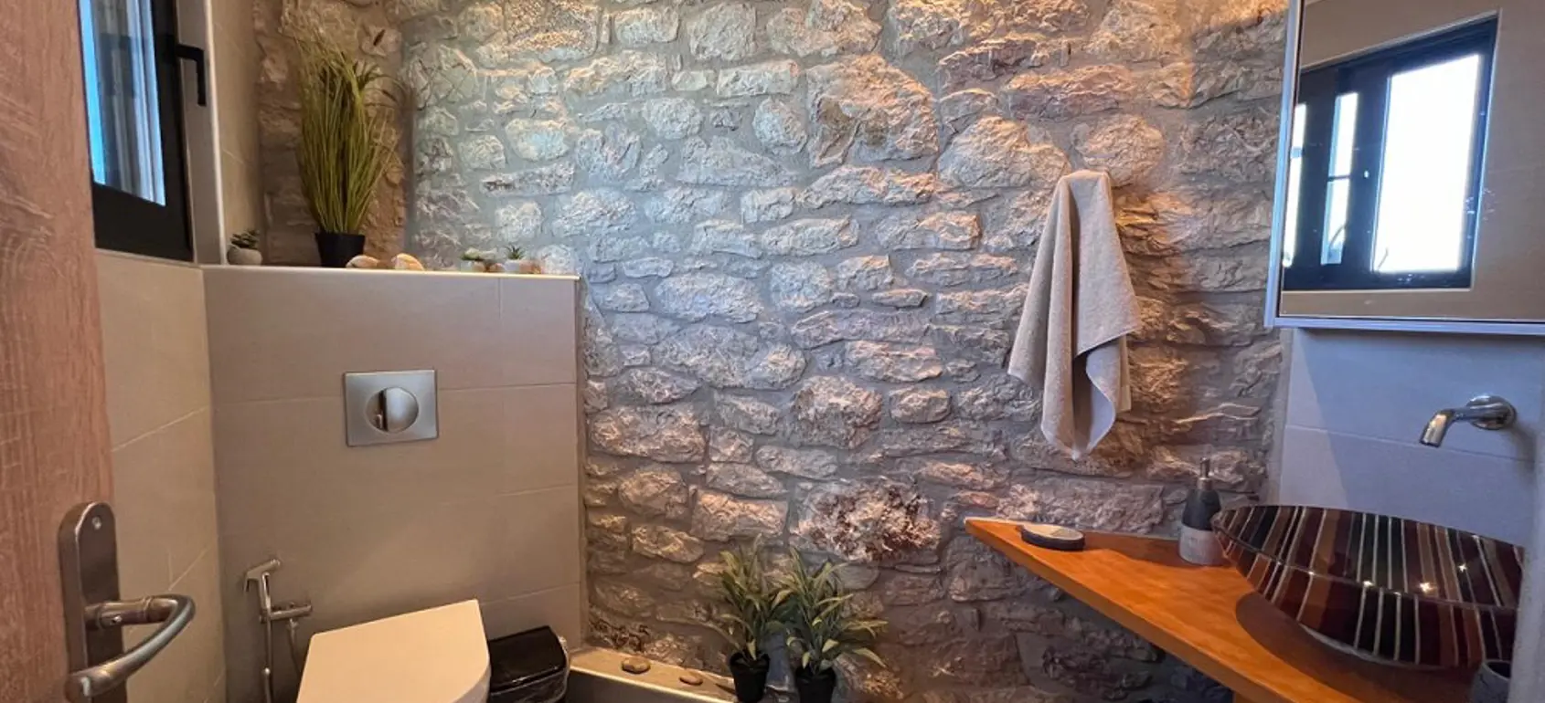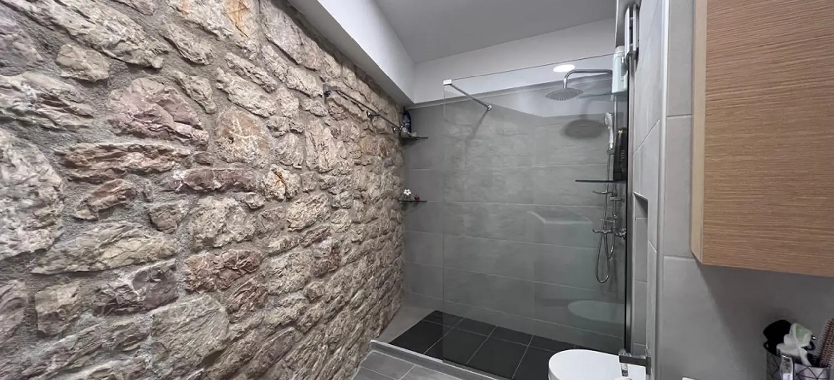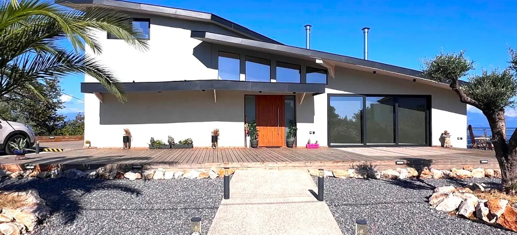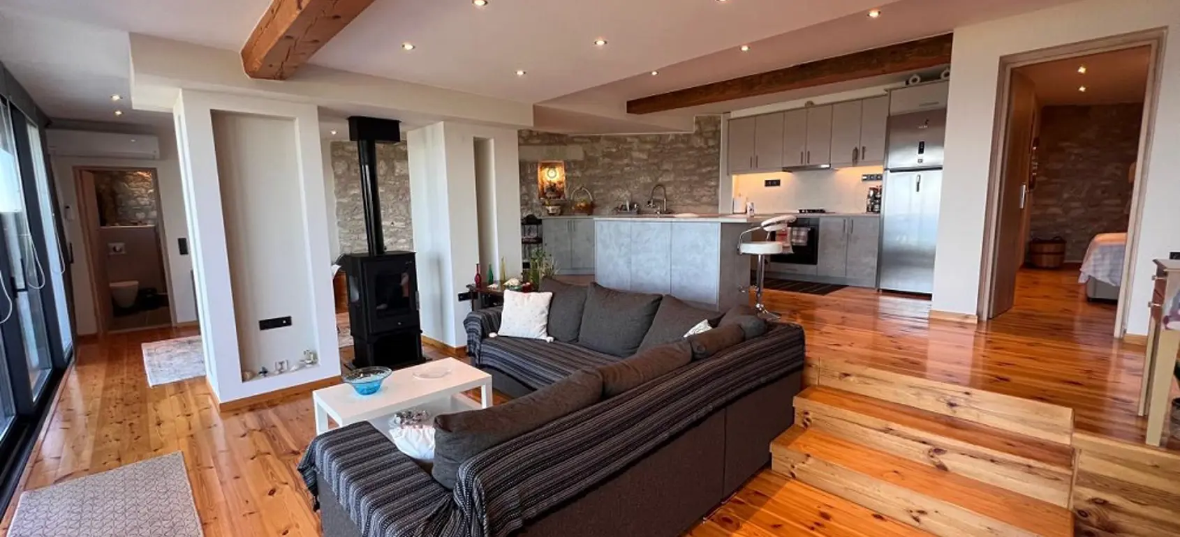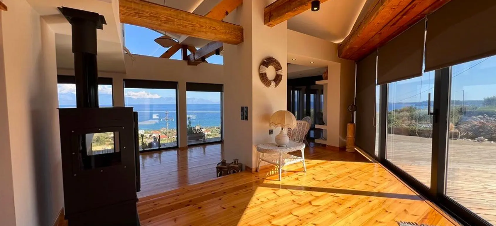 Set within a 1,000 sqm plot of lush Mediterranean terrain, this elegant villa offers a harmonious blend of natural materials and contemporary design. The open-plan living, dining, and kitchen area is adorned with white and stone walls, complemented by warm natural wood finishes, creating a refined yet inviting atmosphere. Expansive windows bathe the interiors in sunlight and frame captivating views of the sea, while the impressive ceiling height and architectural details lend a distinctive character to the space. Designed with versatility in mind, the property can function as a spacious single maisonette or be divided into two independent apartments. Each apartment features a bright open-plan living/dining/kitchen area, two comfortable bedrooms with en-suite bathrooms and separate guest wc.