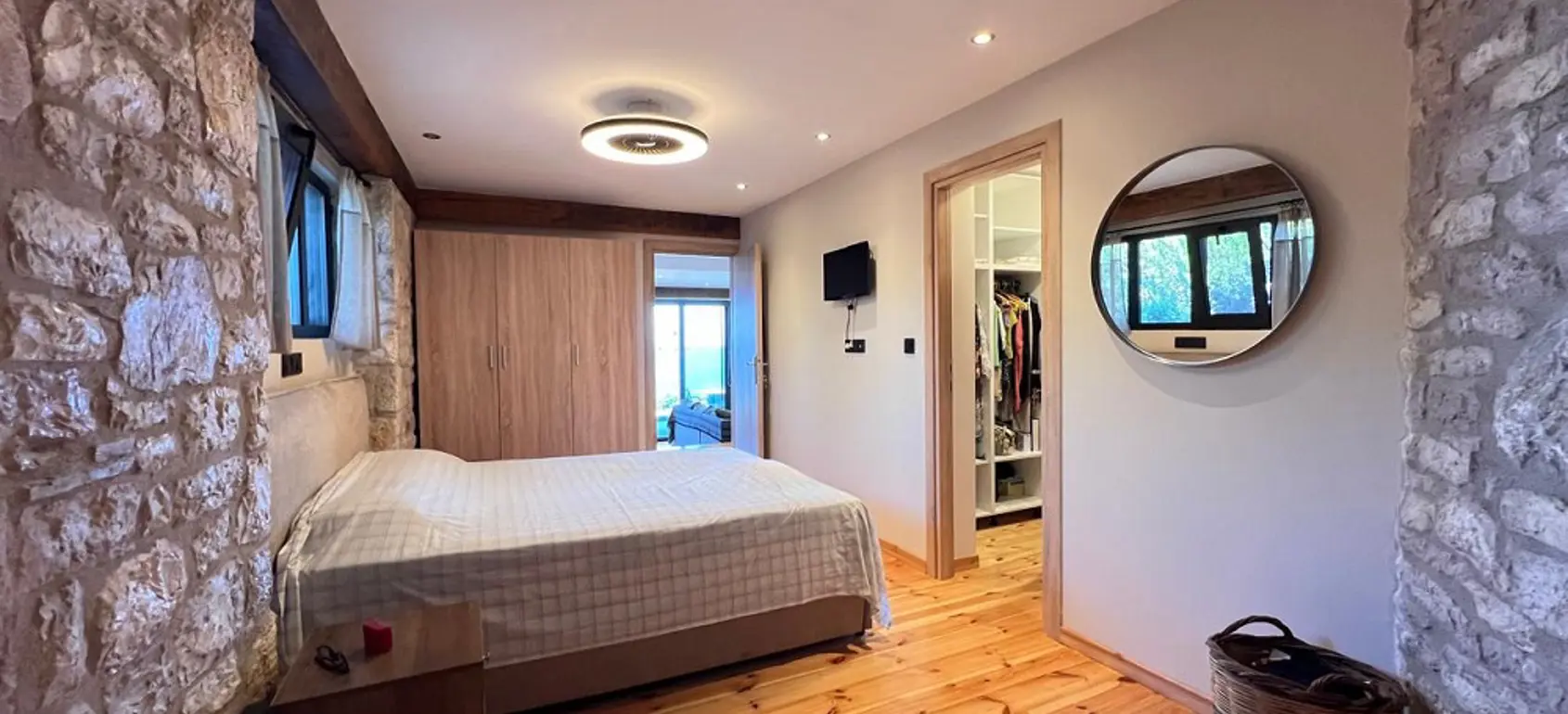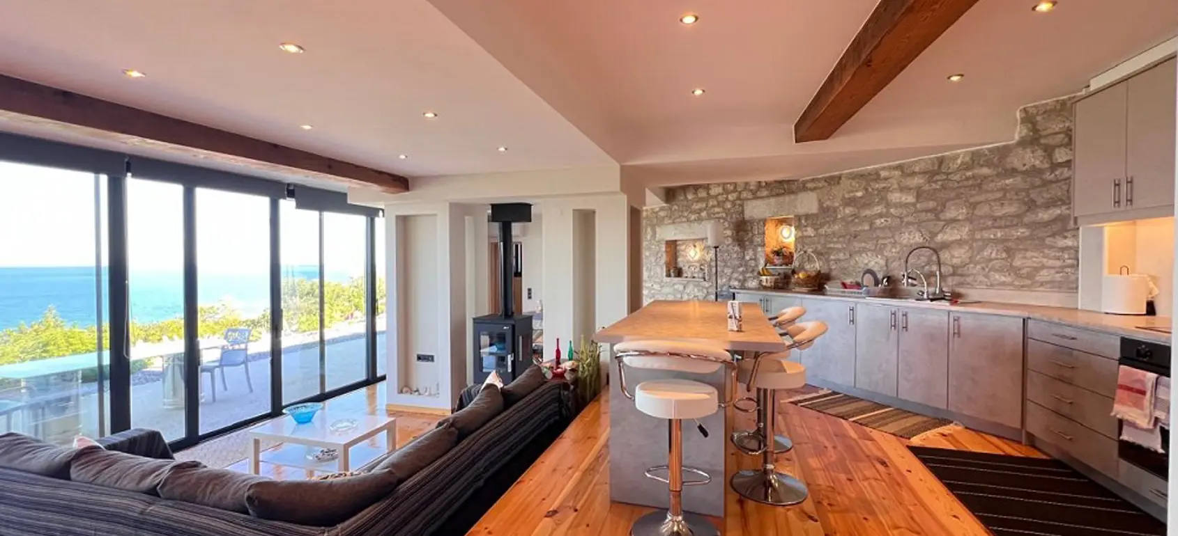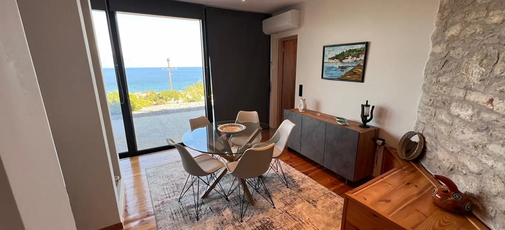 Set within a 1,000 sqm plot of lush Mediterranean terrain, this elegant villa offers a harmonious blend of natural materials and contemporary design. The open-plan living, dining, and kitchen area is adorned with white and stone walls, complemented by warm natural wood finishes, creating a refined yet inviting atmosphere. Expansive windows bathe the interiors in sunlight and frame captivating views of the sea, while the impressive ceiling height and architectural details lend a distinctive character to the space.