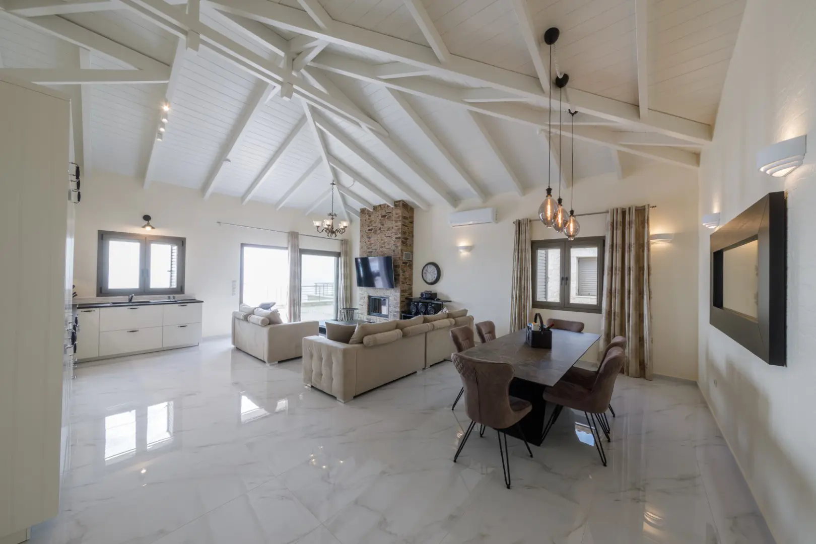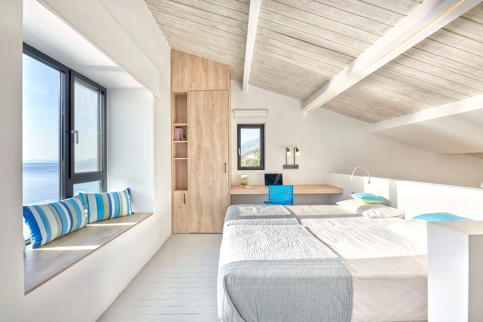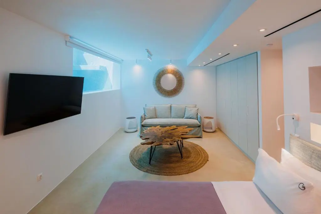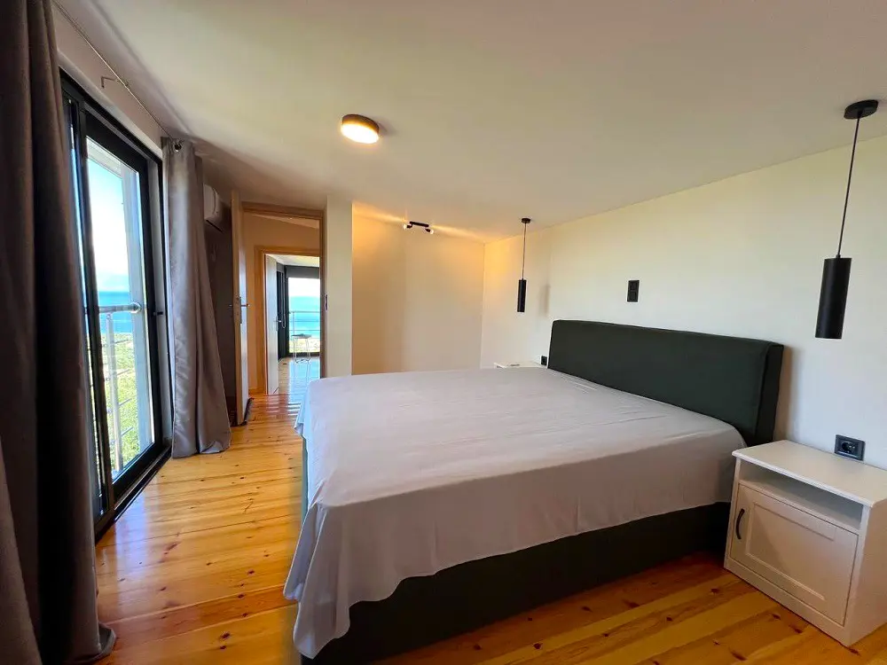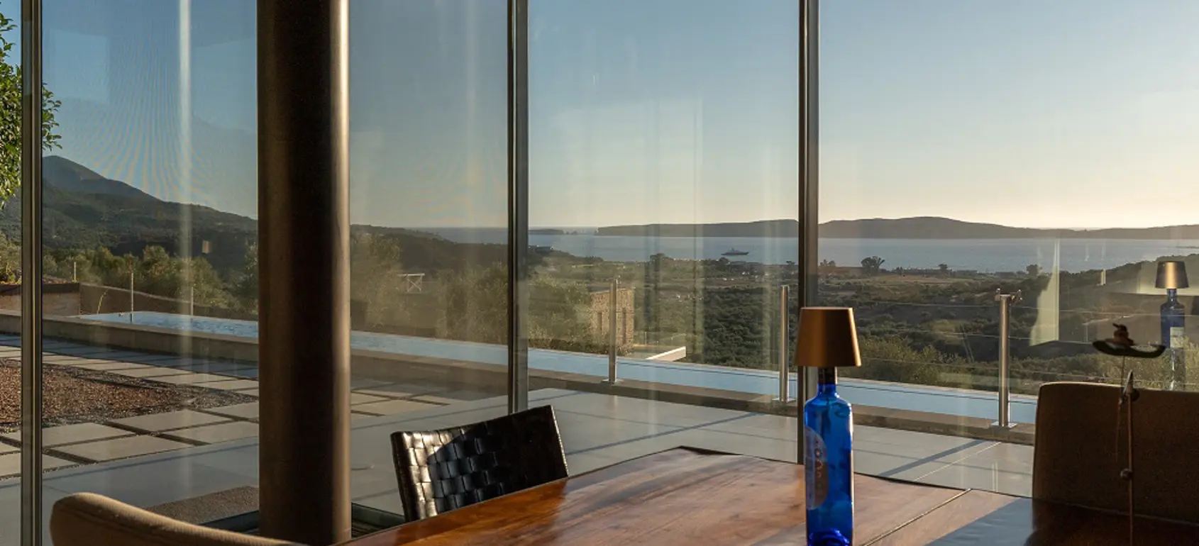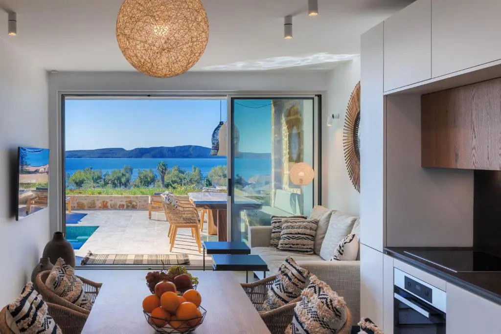 Built in 2020, the villa spans over 180 sqm and features three well-appointed bedrooms and two stylish bathrooms. Every room is bathed in natural light, thanks to expansive windows that frame breathtaking views of the sea. The interiors are thoughtfully curated with natural wood finishes, soft lighting, and earthy tones, with an industrial style touch, cultivating a serene and sophisticated ambiance throughout.