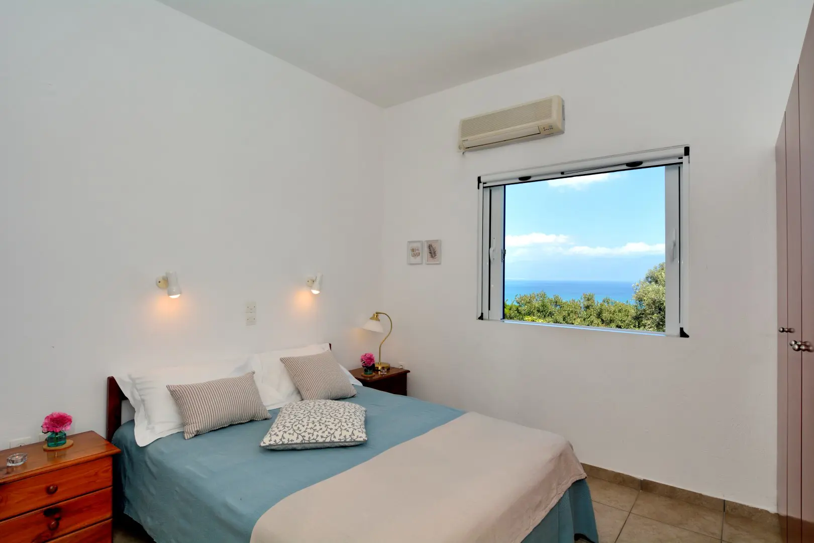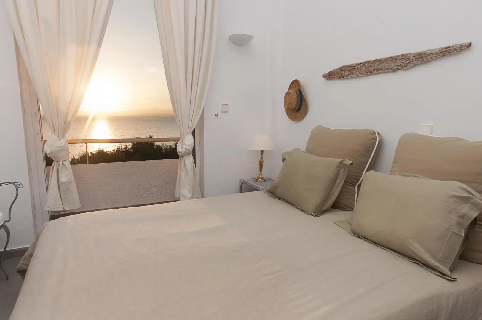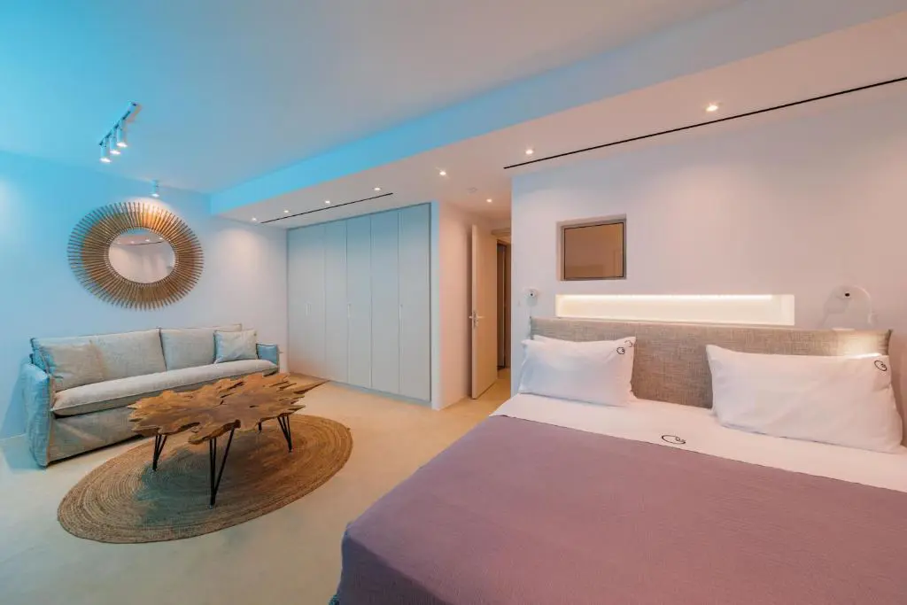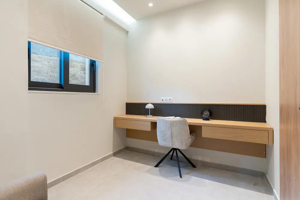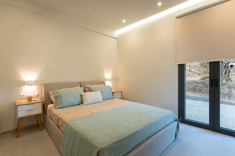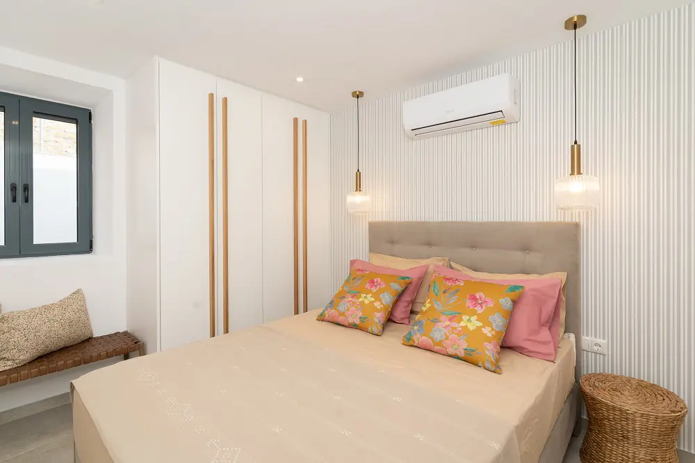 Built in 2020, the villa spans over 180 sqm and features three well-appointed bedrooms and two stylish bathrooms. Every room is bathed in natural light, thanks to expansive windows that frame breathtaking views of the sea. The interiors are thoughtfully curated with natural wood finishes, soft lighting, and earthy tones, with an industrial style touch, cultivating a serene and sophisticated ambiance throughout.