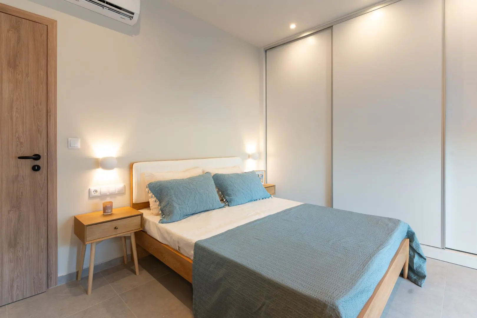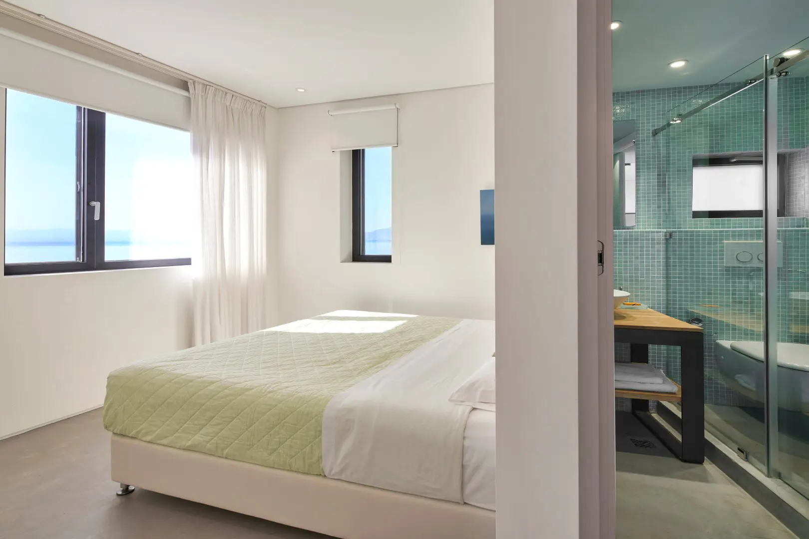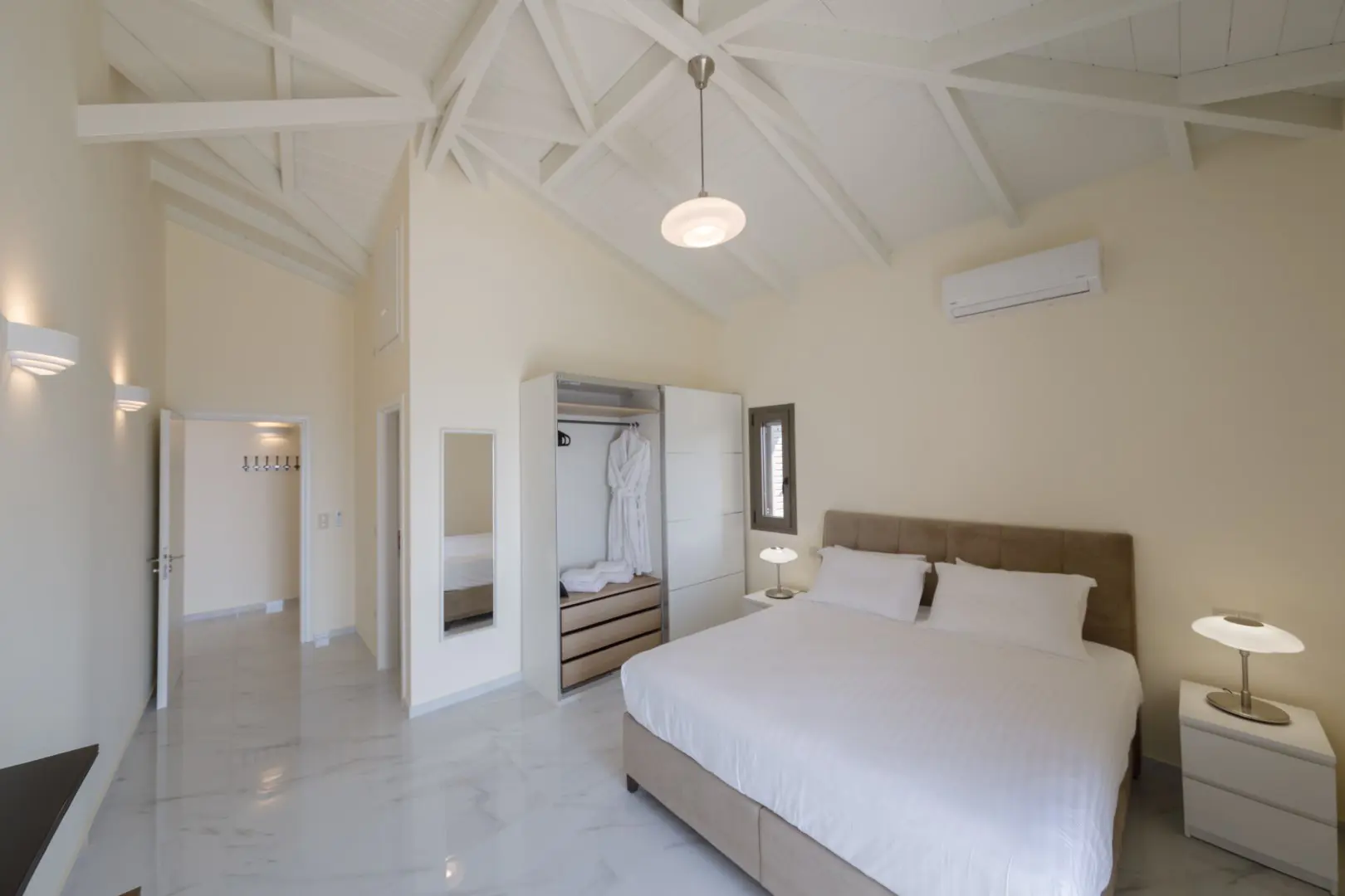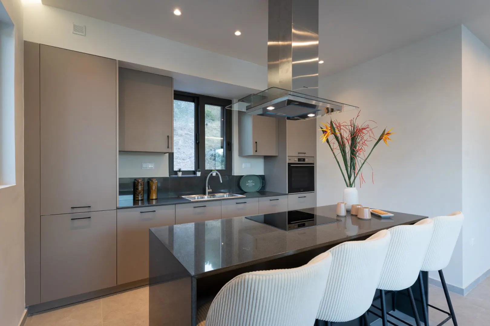 Built in 2020, the villa spans over 180 sqm and features three well-appointed bedrooms and two stylish bathrooms. Every room is bathed in natural light, thanks to expansive windows that frame breathtaking views of the sea. The interiors are thoughtfully curated with natural wood finishes, soft lighting, and earthy tones, with an industrial style touch, cultivating a serene and sophisticated ambiance throughout.
