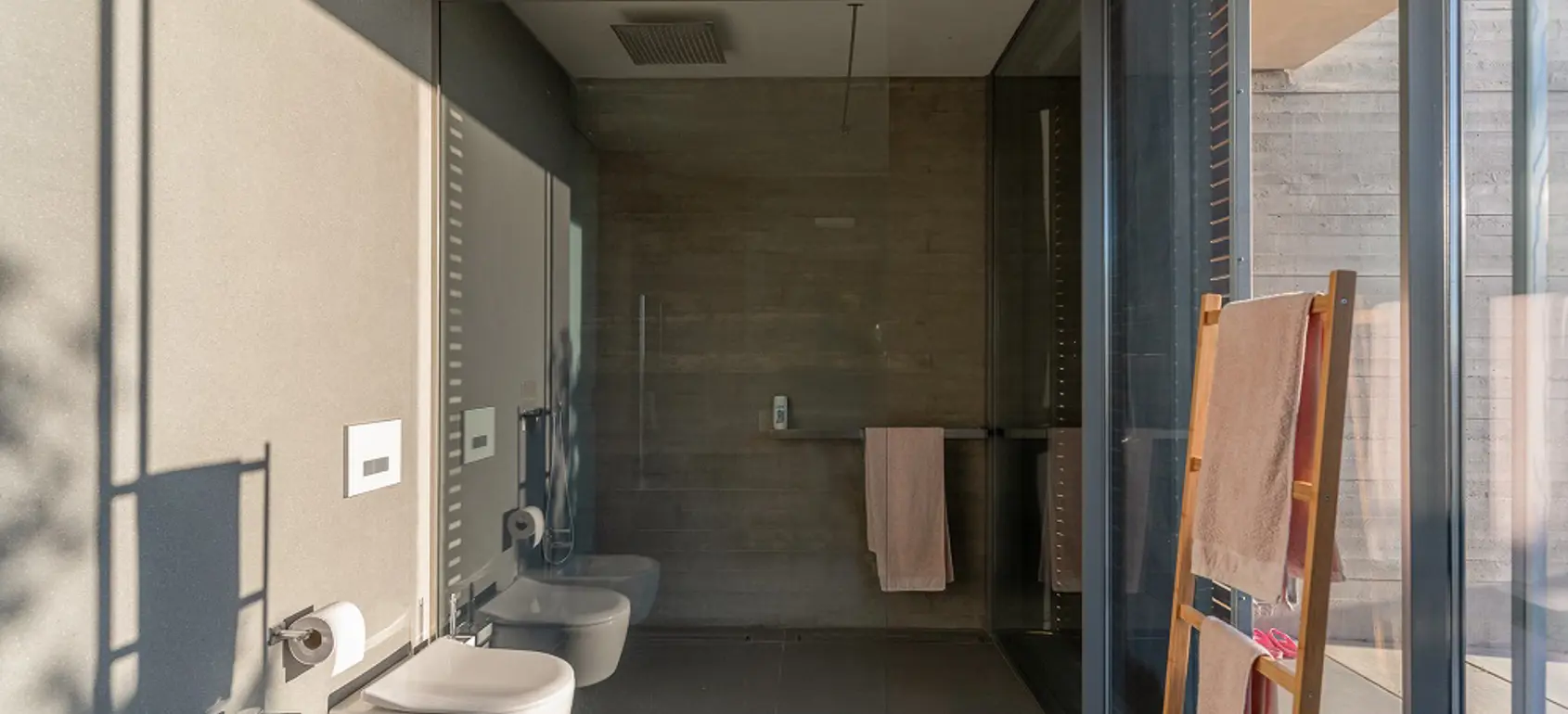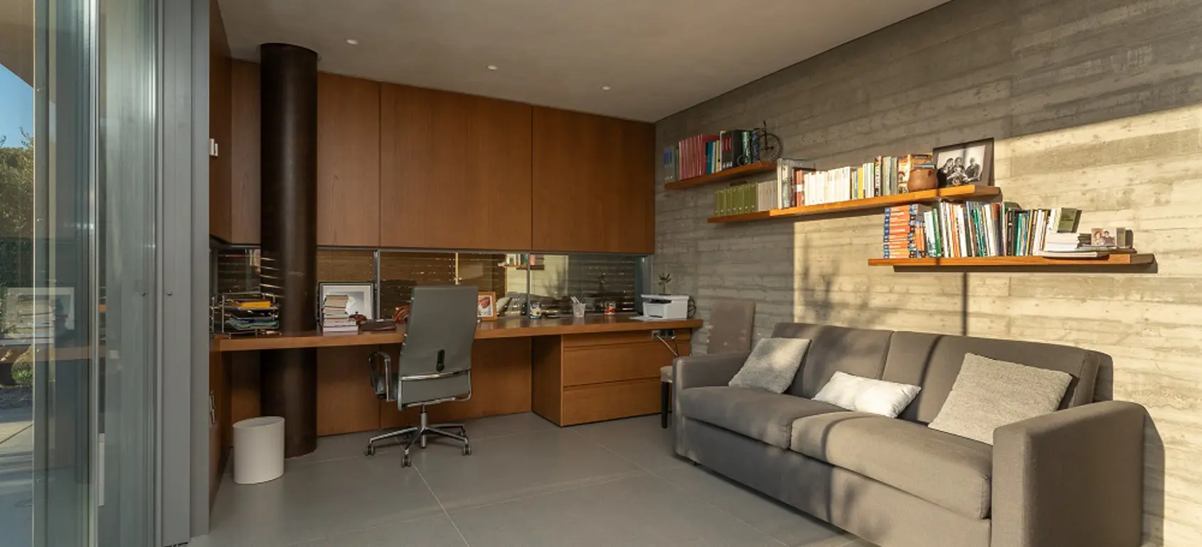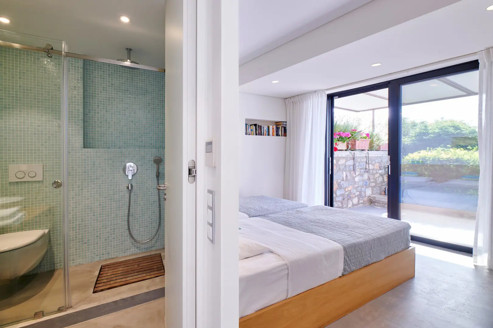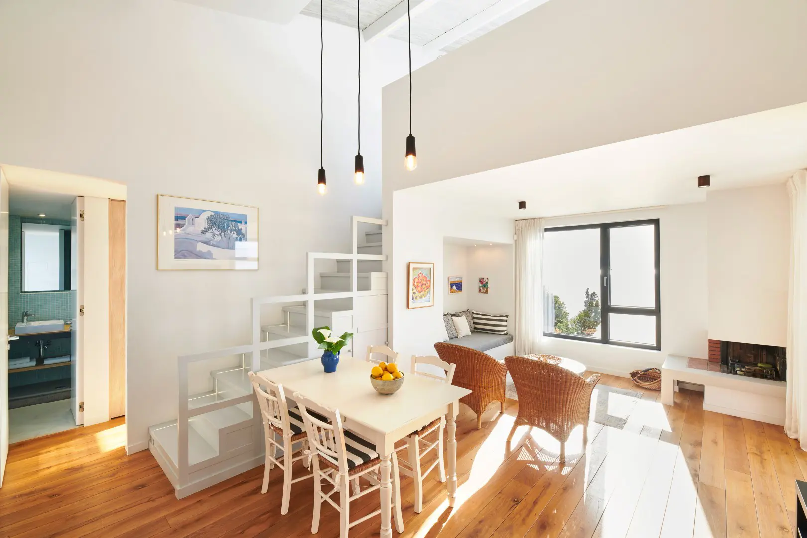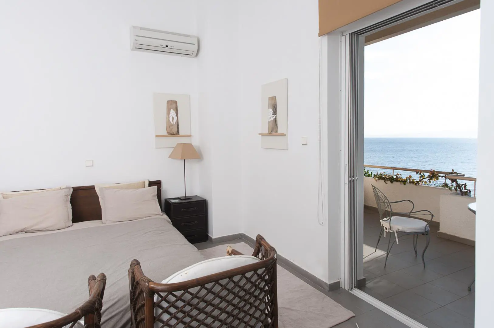 Built in 2020, the villa spans over 180 sqm and features three well-appointed bedrooms and two stylish bathrooms. Every room is bathed in natural light, thanks to expansive windows that frame breathtaking views of the sea. The interiors are thoughtfully curated with natural wood finishes, soft lighting, and earthy tones, with an industrial style touch, cultivating a serene and sophisticated ambiance throughout.