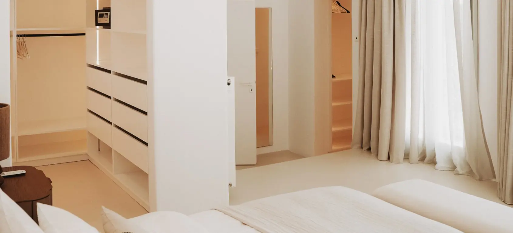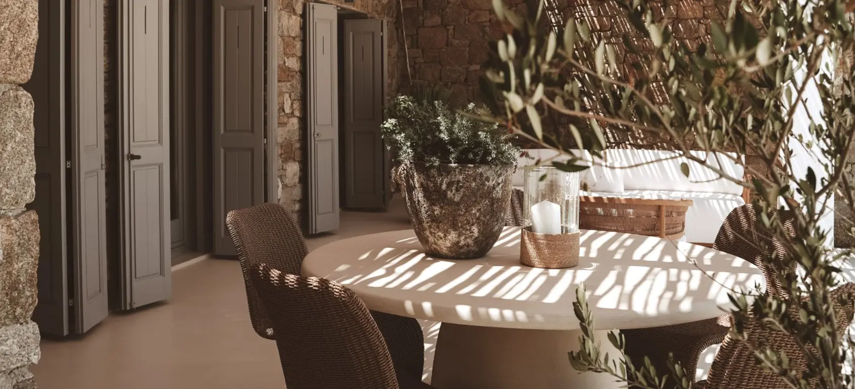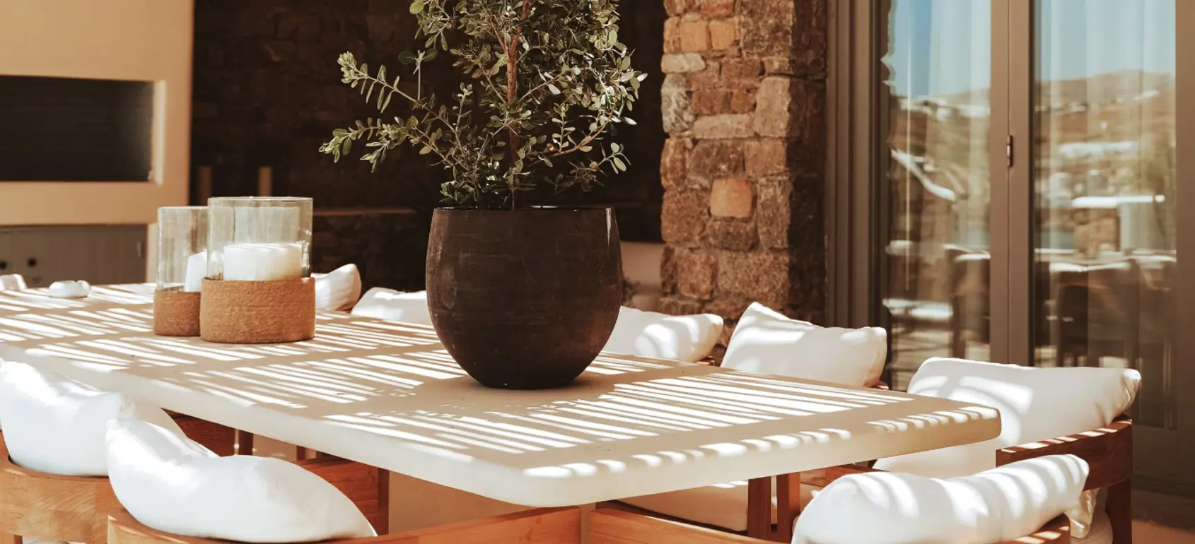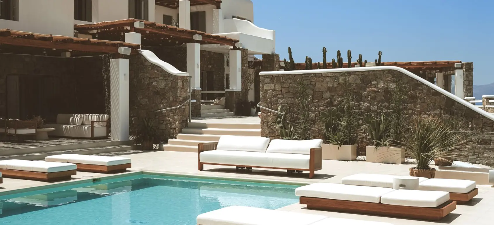 Outdoors, guests can unwind across 260 sqm of shaded pergolas, sunbathe on elegant loungers, or enjoy al fresco dining in one of the many seating areas. The villa’s elevated position provides breathtaking views of the Aegean Sea and Mykonos town, while its peaceful surroundings ensure relaxation. All essential amenities are conveniently close by.