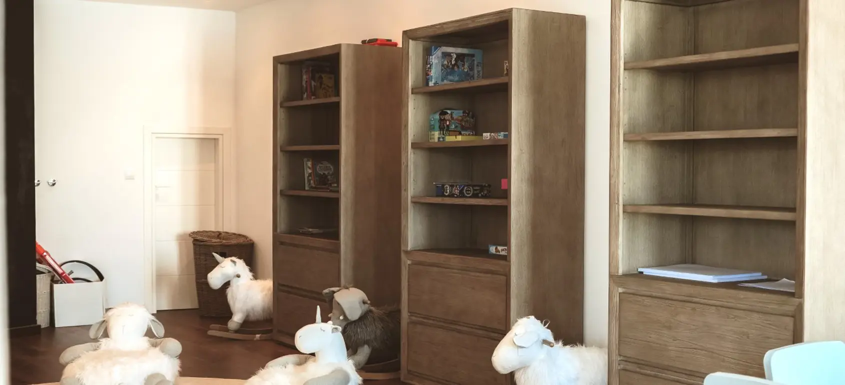 The residence is composed of two distinct buildings, each featuring its own living and dining areas, fully equipped kitchens, and guest wc on the ground level. This configuration ensures both communal enjoyment and personal privacy. If you wander inside the villa, you will find whitewashed tones and a neutral color palette. The ground floor also hosts two guest, ensuite bedrooms, and a range of auxiliary spaces including a laundry room and ample storage. Multiple access points lead directly to expansive terraces and inviting pool areas. Upstairs, the villa boasts eight beautifully appointed ensuite bedrooms, offering comfort and privacy for every guest. A spacious basement level enhances the experience with a dedicated playroom, gym, bathroom, and a music club - perfect for entertainment and leisure.