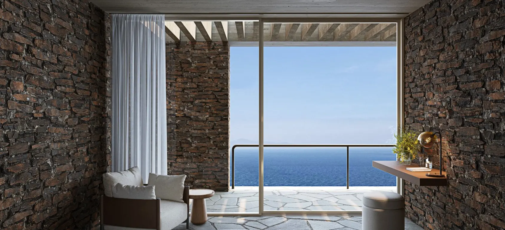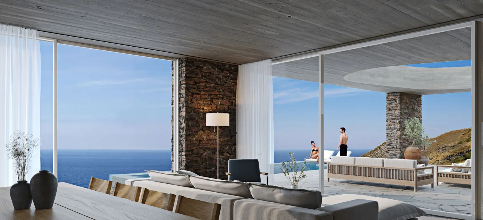 Outdoors, the experience is equally captivating. A terrace invites you to unwind and soak in panoramic sea vistas, offering the perfect setting for alfresco dining and entertaining.