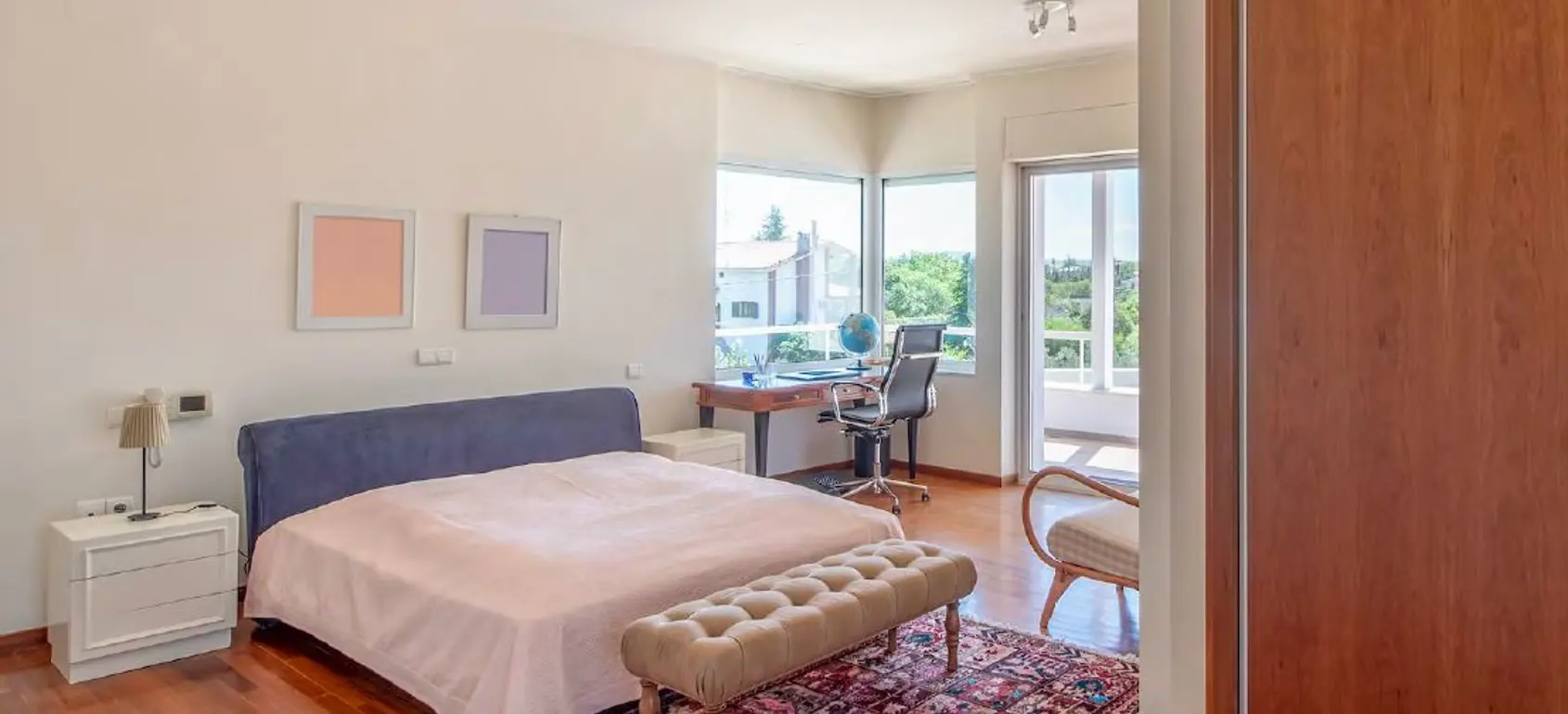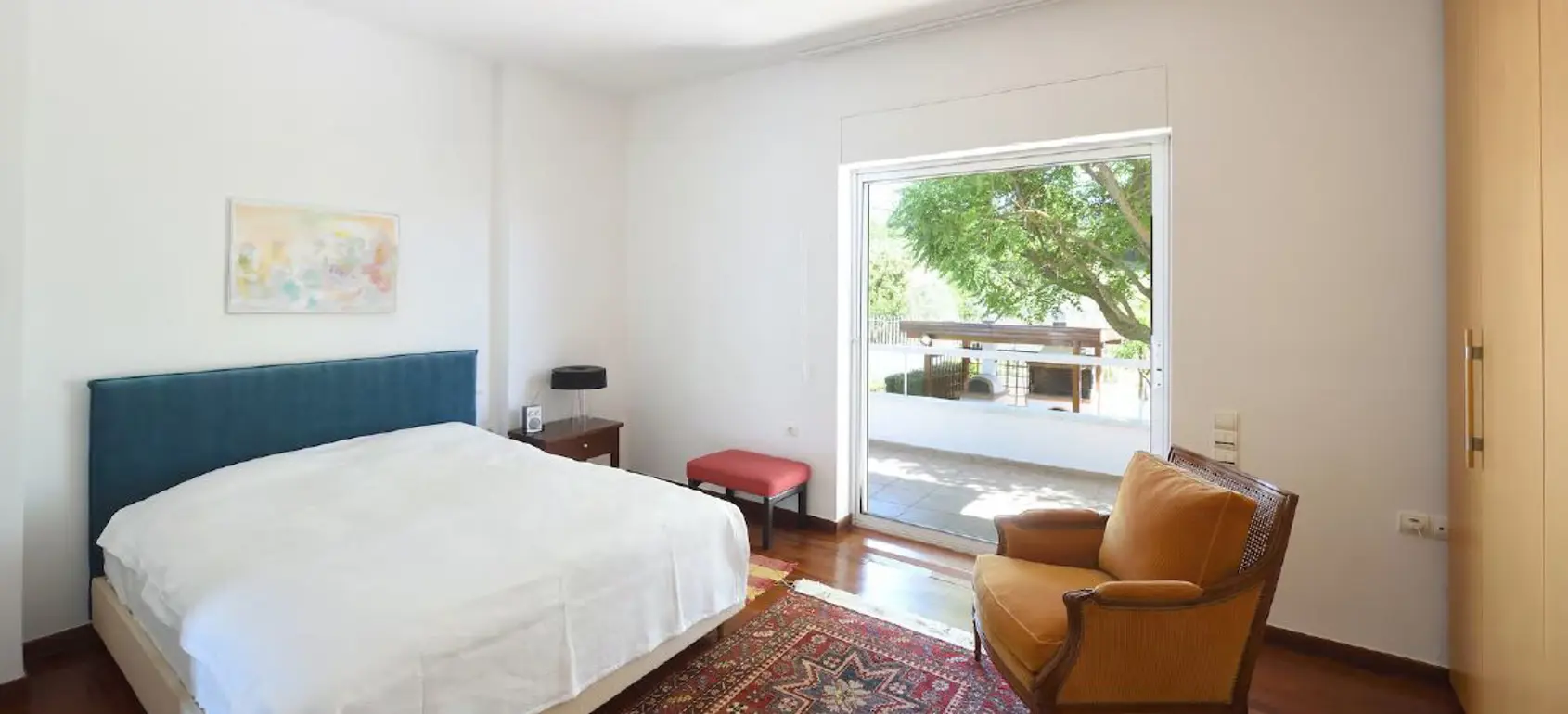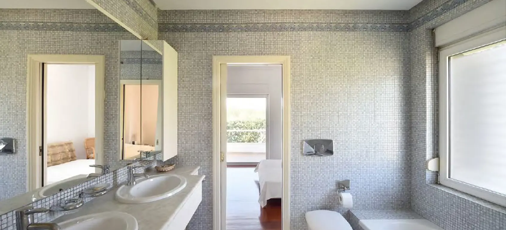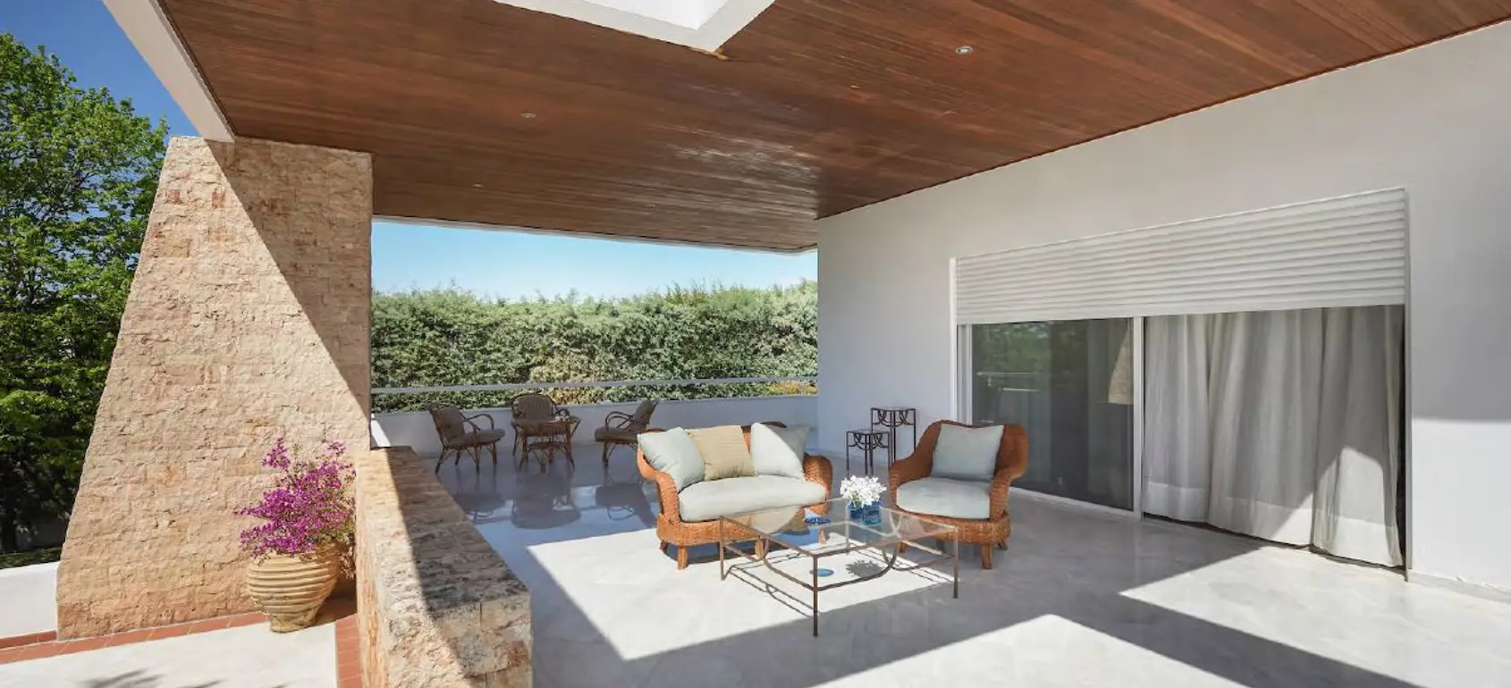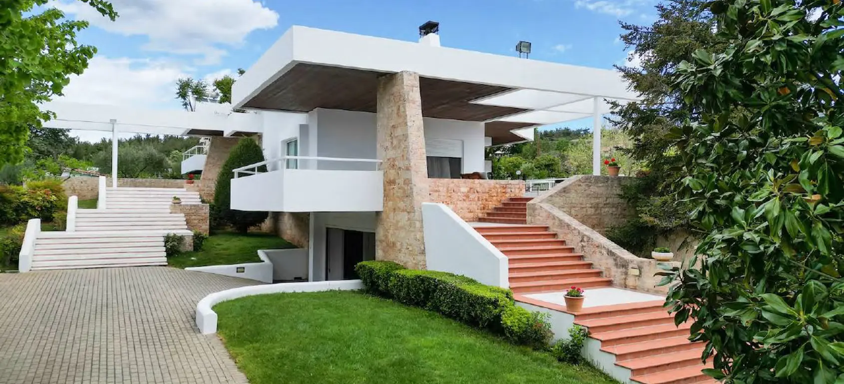 The villa’s elegant interior features parquet floors in the main living area and upper-level bedrooms, while the entrance, kitchen, and stairs are clad in striking white Kozani marble. Travertine stone with a light salmon hue enhances the walls of the living spaces and portions of the exterior, lending a sophisticated, natural finish. Outdoors, Italian cotto tiles cover the surrounding terraces and pathways, seamlessly connecting the villa to its serene garden.