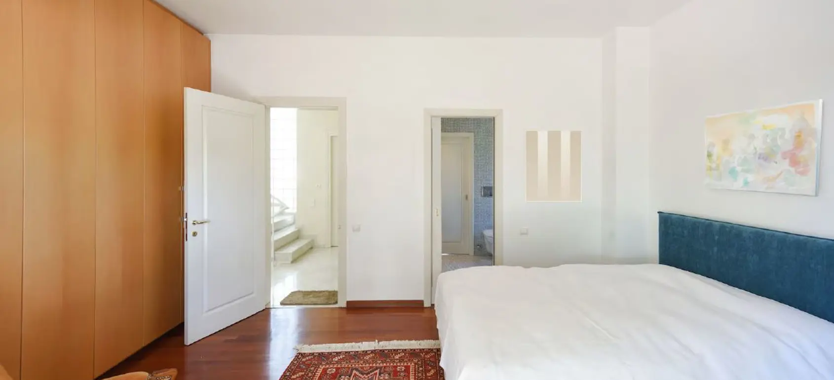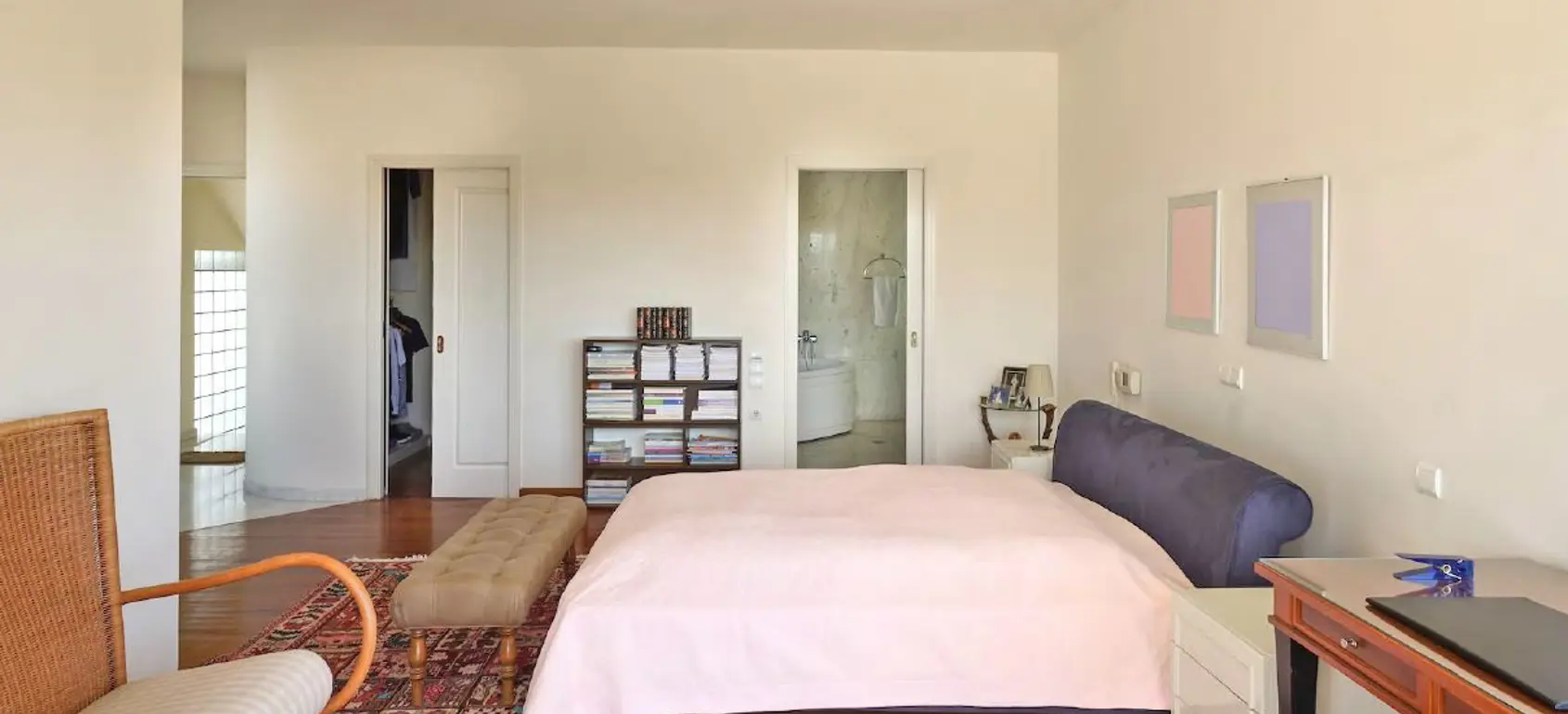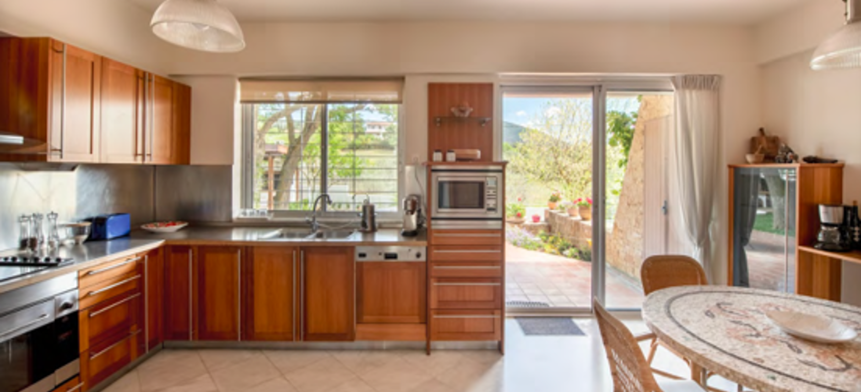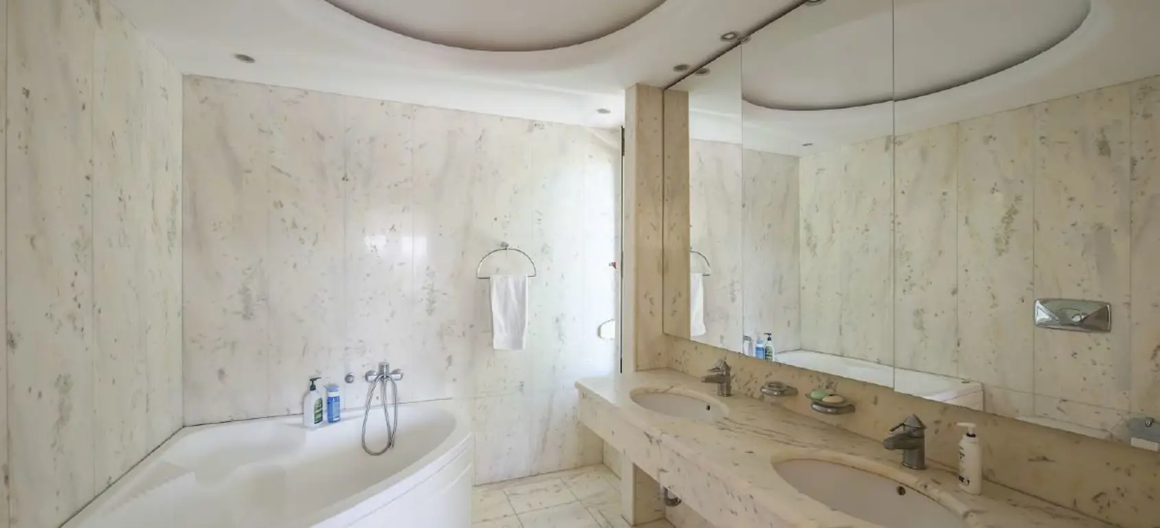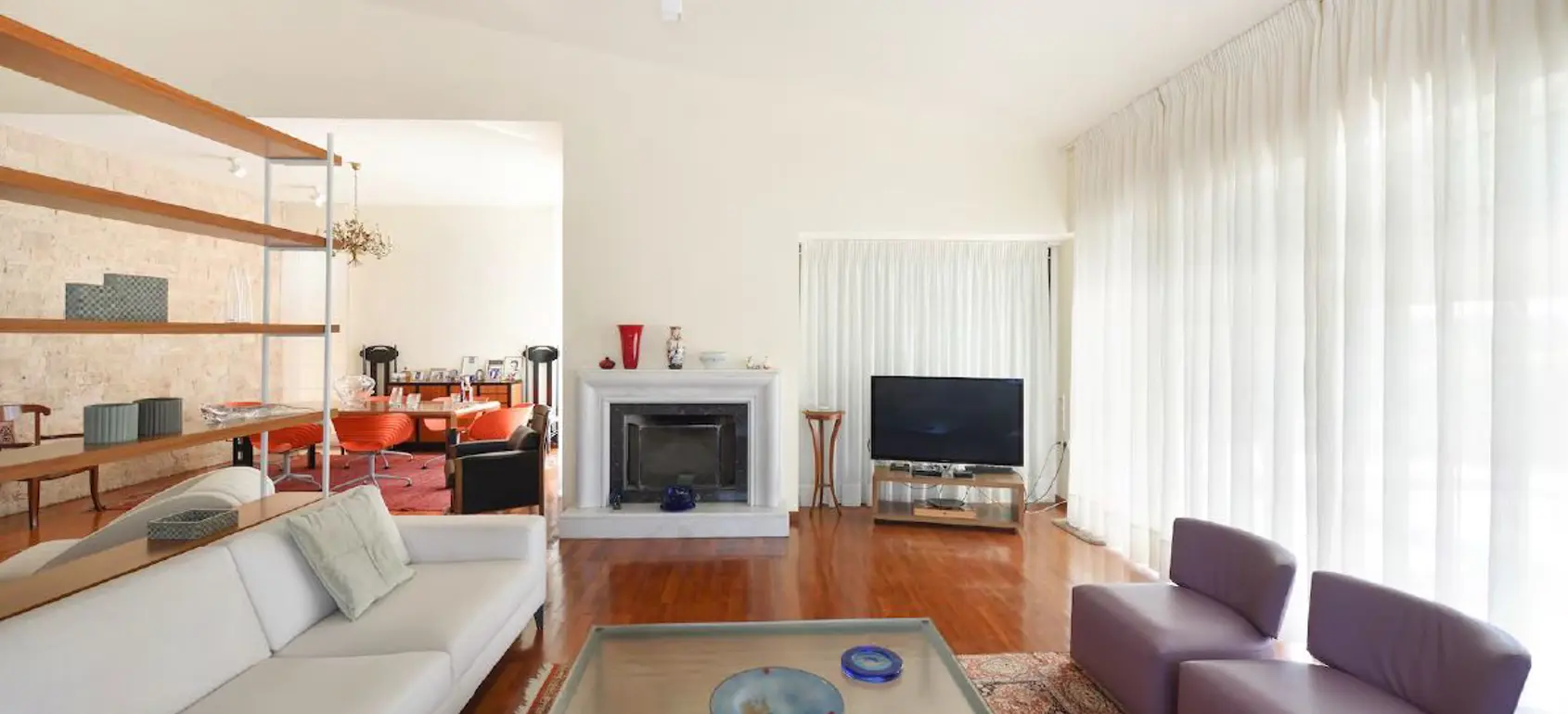 The villa’s elegant interior features parquet floors in the main living area and upper-level bedrooms, while the entrance, kitchen, and stairs are clad in striking white Kozani marble. Travertine stone with a light salmon hue enhances the walls of the living spaces and portions of the exterior, lending a sophisticated, natural finish. Outdoors, Italian cotto tiles cover the surrounding terraces and pathways, seamlessly connecting the villa to its serene garden.