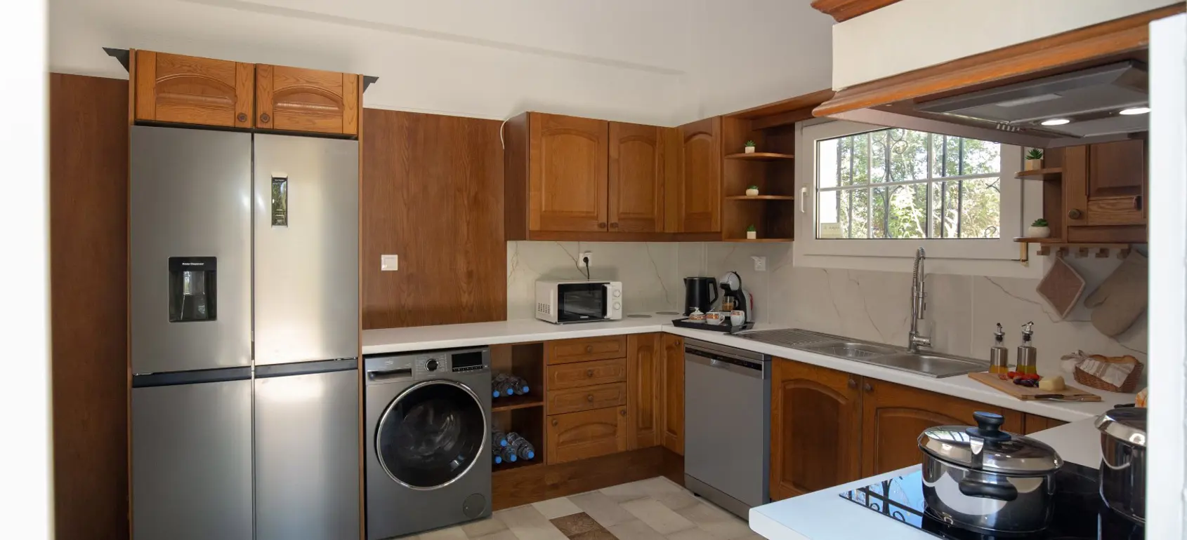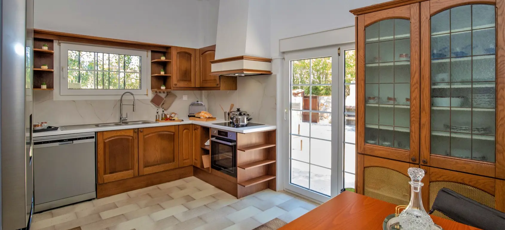 The house covers a total built areas of 163sqm arranged in two levels in a land plot of 3,000 sqm. Additionally, there is a basement, an external stone garden house and an external BBQ with a large dining area. On the ground level there is a spacious living area with a fireplace as well as the kitchen and the dining area. Also on the ground floor, there is a spacious bedroom, a warehouse and a bathroom. On the upper floor there is a spacious bedroom with a walk-in closet and a bathroom.
