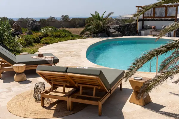 Panoramic views properties of the azure Aegean Sea and the world-famous Santorini sunset