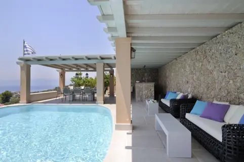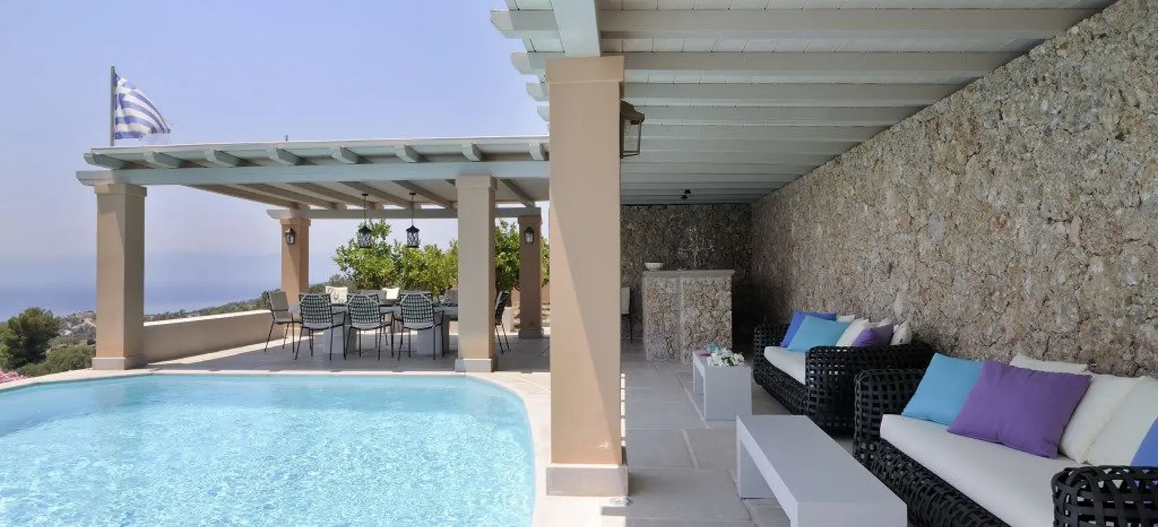This luxurious Greek villa is located in an unparalleled privileged position uphill of the south-west side of the town enjoying extensive sea views over Porto Heli bay and the island of Spetses. The villa combines serenity, tranquillity and a peaceful setting with unique provincial interiors and luxurious facilities. Earthy colours, handpicked neoclassical furniture and attention to detail (handmade Turkish tiles at entrance level) provide a remarkable setting. The residence covers a total area of 280 sqm arranged in three levels. It includes 5 bedrooms, a spacious living room, a fully equipped kitchen and 7 bathrooms. At the outside space there is a pool, balcony’s and yards which covered with pergolas. The villa has excellent architectural design and has been constructed with the highest-quality materials.