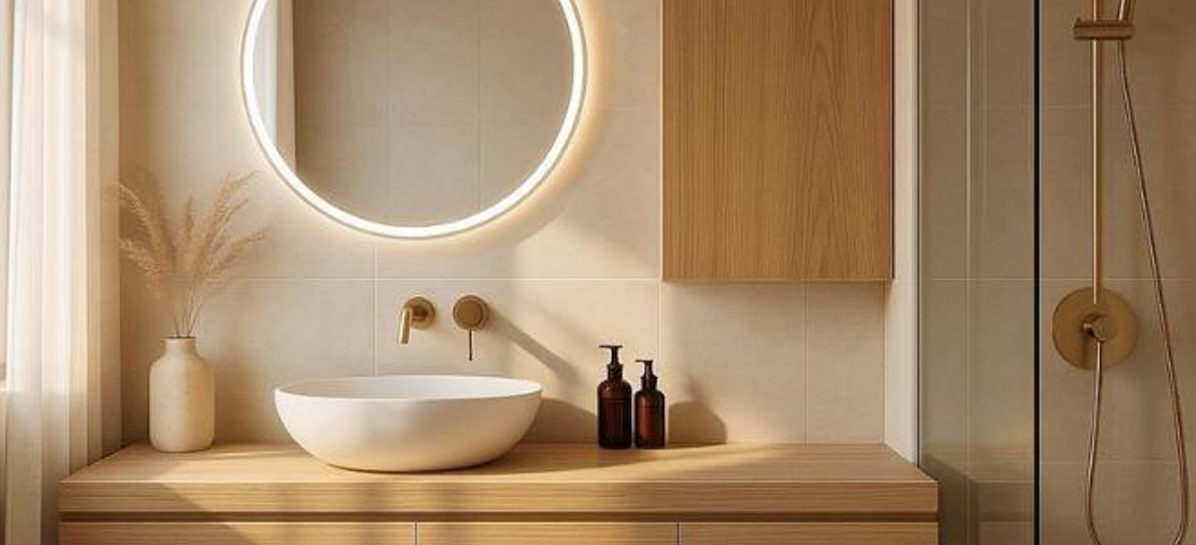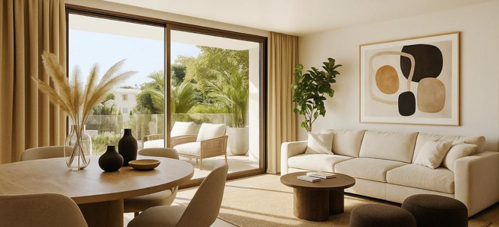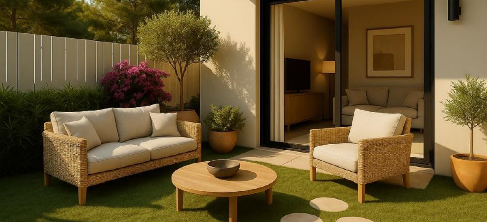 A refined composition of natural textures, soft organic forms, and understated minimalism, set within a landscape of lush greenery.