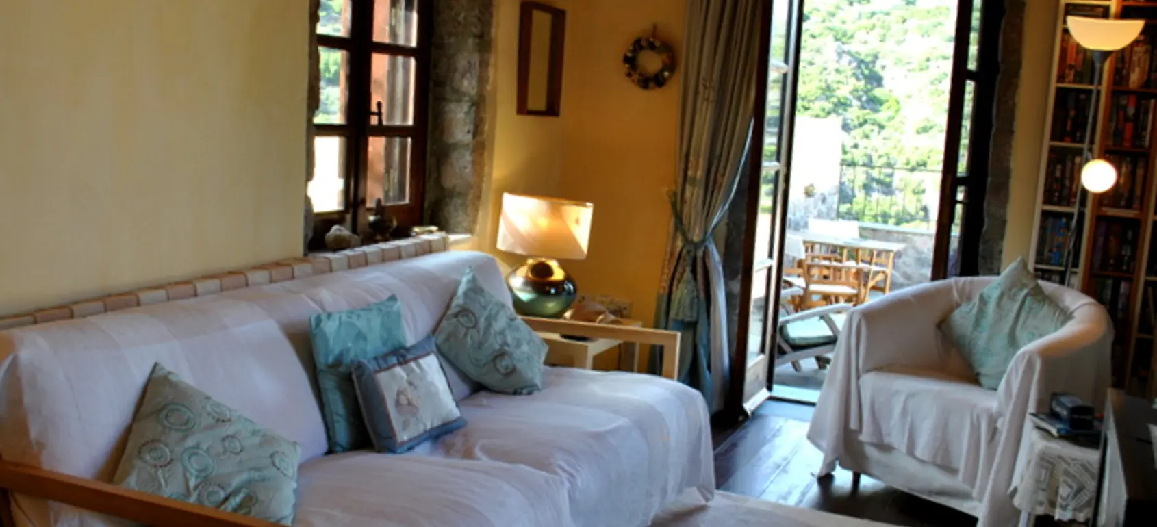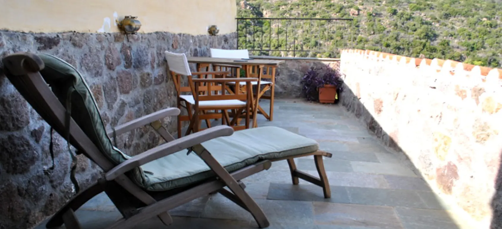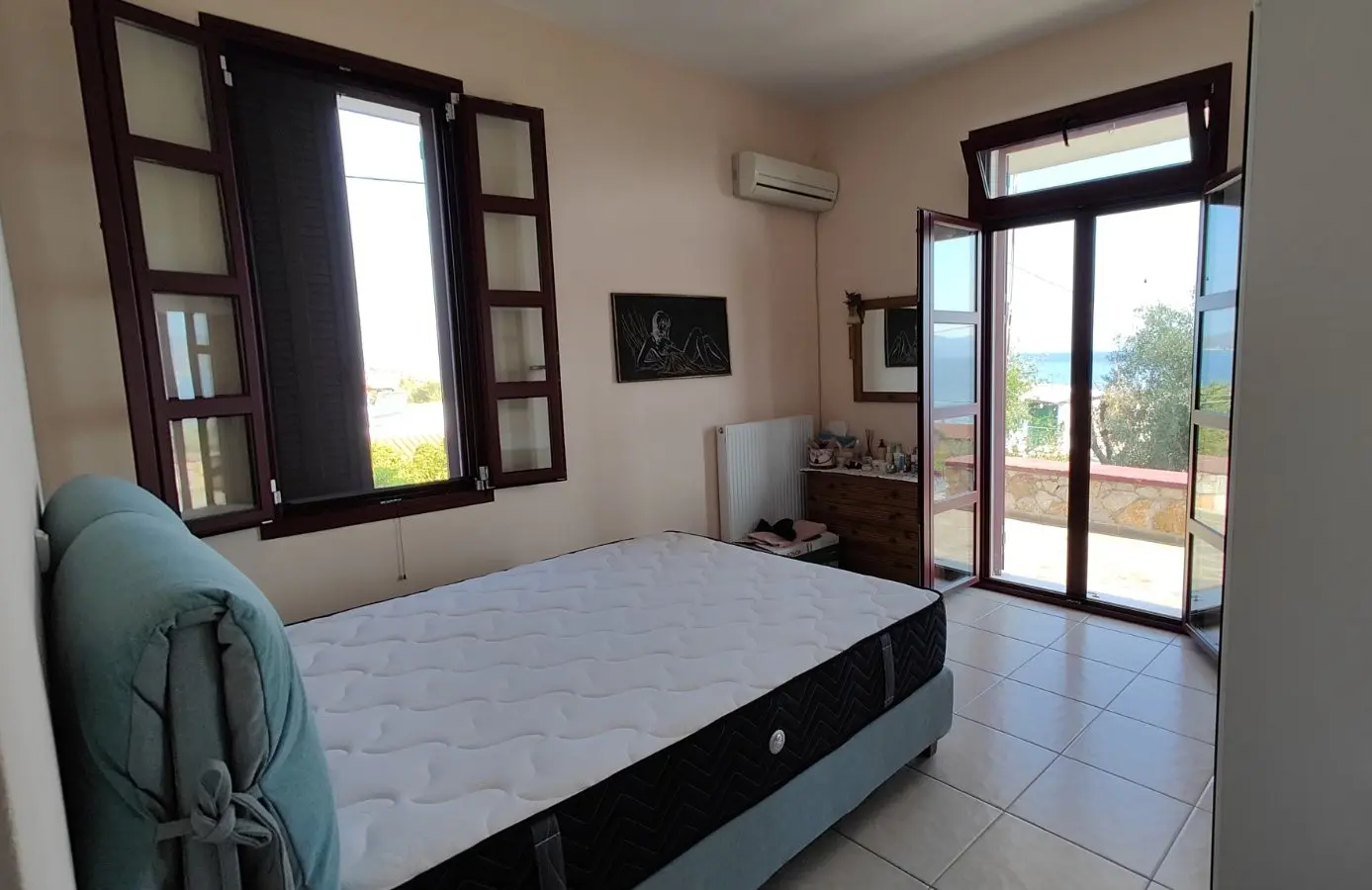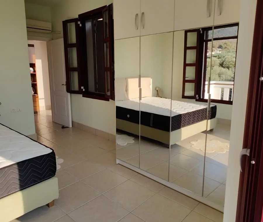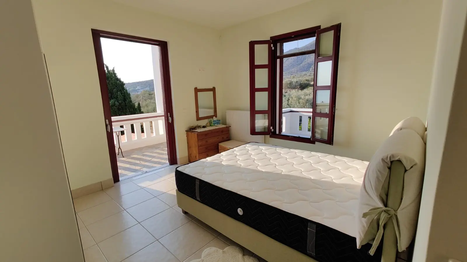 House 1, total areas of 134 sqm: Entered through garden the sitting room is 42sq.mts with high beamed ceiling and polished wood floor, having large raised corner fireplace, three down lit alcoves from original house and French windows opening onto a substantial terrace with breath-taking views across the sea to the Peloponnese and Corinth. From this terrace there is an external stair to the swimming pool terrace but as throughout the houses there are safety features for children. The sitting room has a double bed/settee and the possibility of another double or two single beds with the existing furniture.