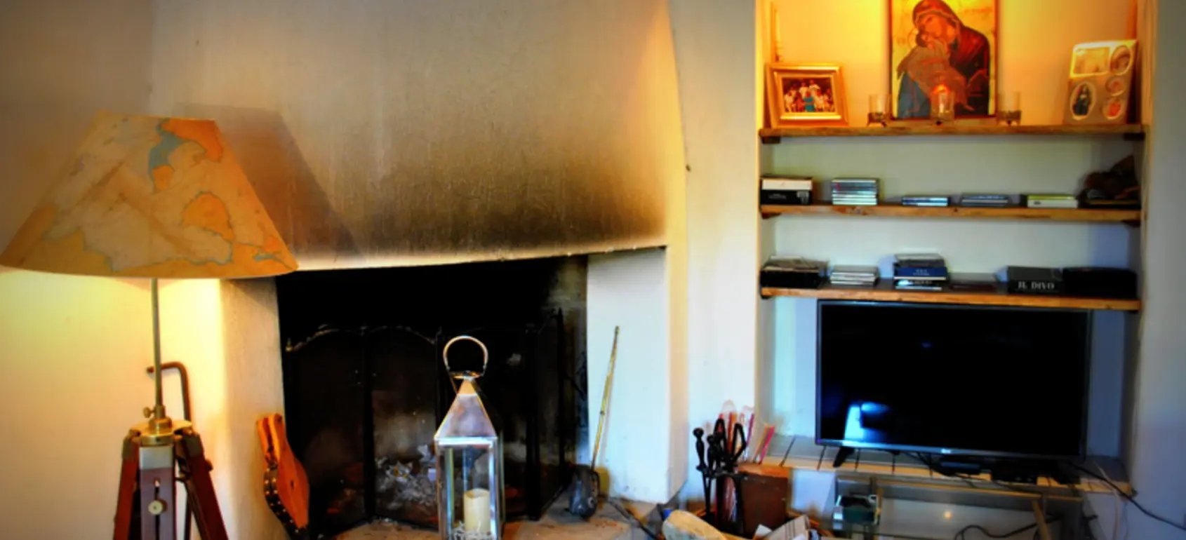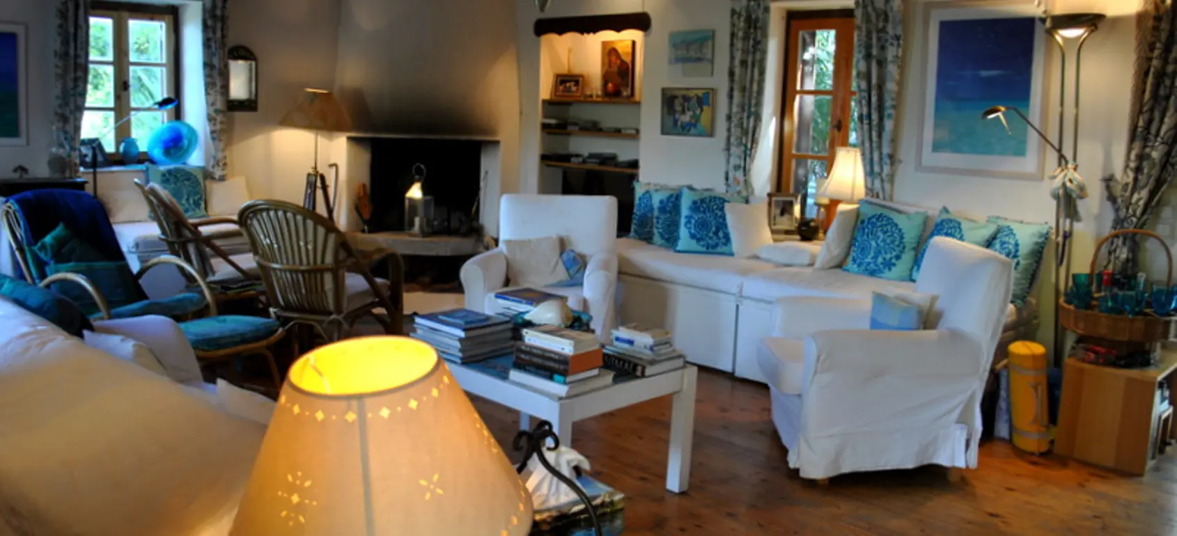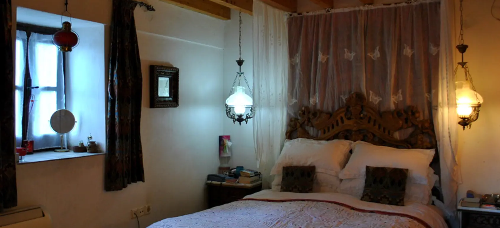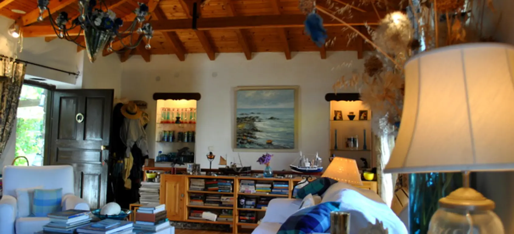 House 1, total areas of 134 sqm: Entered through garden the sitting room is 42sq.mts with high beamed ceiling and polished wood floor, having large raised corner fireplace, three down lit alcoves from original house and French windows opening onto a substantial terrace with breath-taking views across the sea to the Peloponnese and Corinth. From this terrace there is an external stair to the swimming pool terrace but as throughout the houses there are safety features for children. The sitting room has a double bed/settee and the possibility of another double or two single beds with the existing furniture.