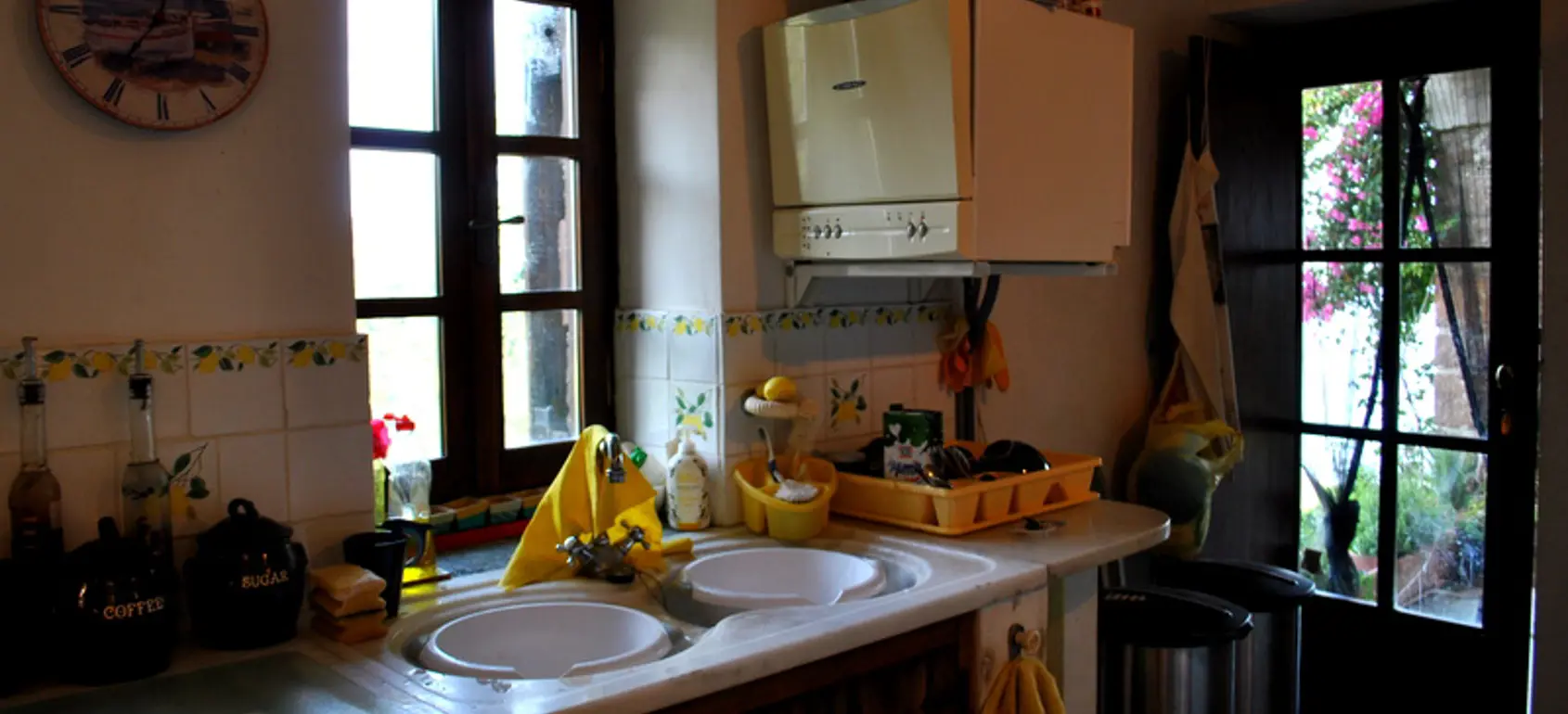 “Winter Room” Stairs from the sitting room with newel post of the original olive beams gives access to this room used as a dining room. It has storage or a child’s bed under the stairs, a wood burning stove and full height dresser. All of the ground floor is tiled. There is access from the winter room to a double shower room and the kitchen and main bedroom. Shower room/Toilet This a double shower, double sinks and extra-large double mirror. The walls and floor are completely tiled.