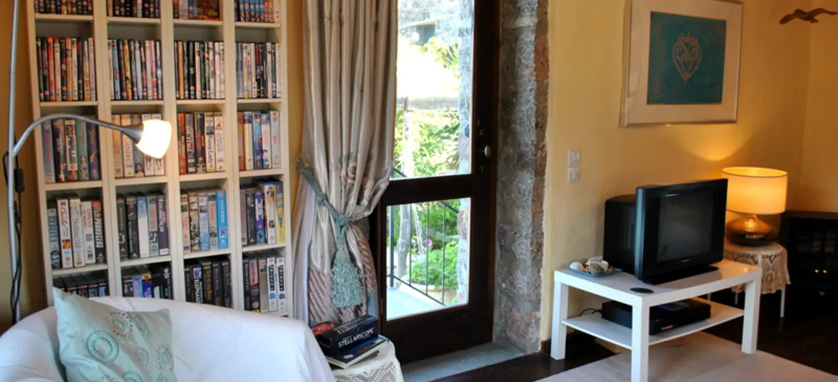 Sitting room/double bedroom Accessed from upper hall by four steps. Window to rear. Glazed door to outside stair to swimming pool terrace and French doors to secluded upper terrace with spectacular views over the Saronic Gulf. Double bed/settee, two armchairs, occasional tables, book cases, TV and DVD/video points. Polished wood floor, faux wood burning stove – electric.