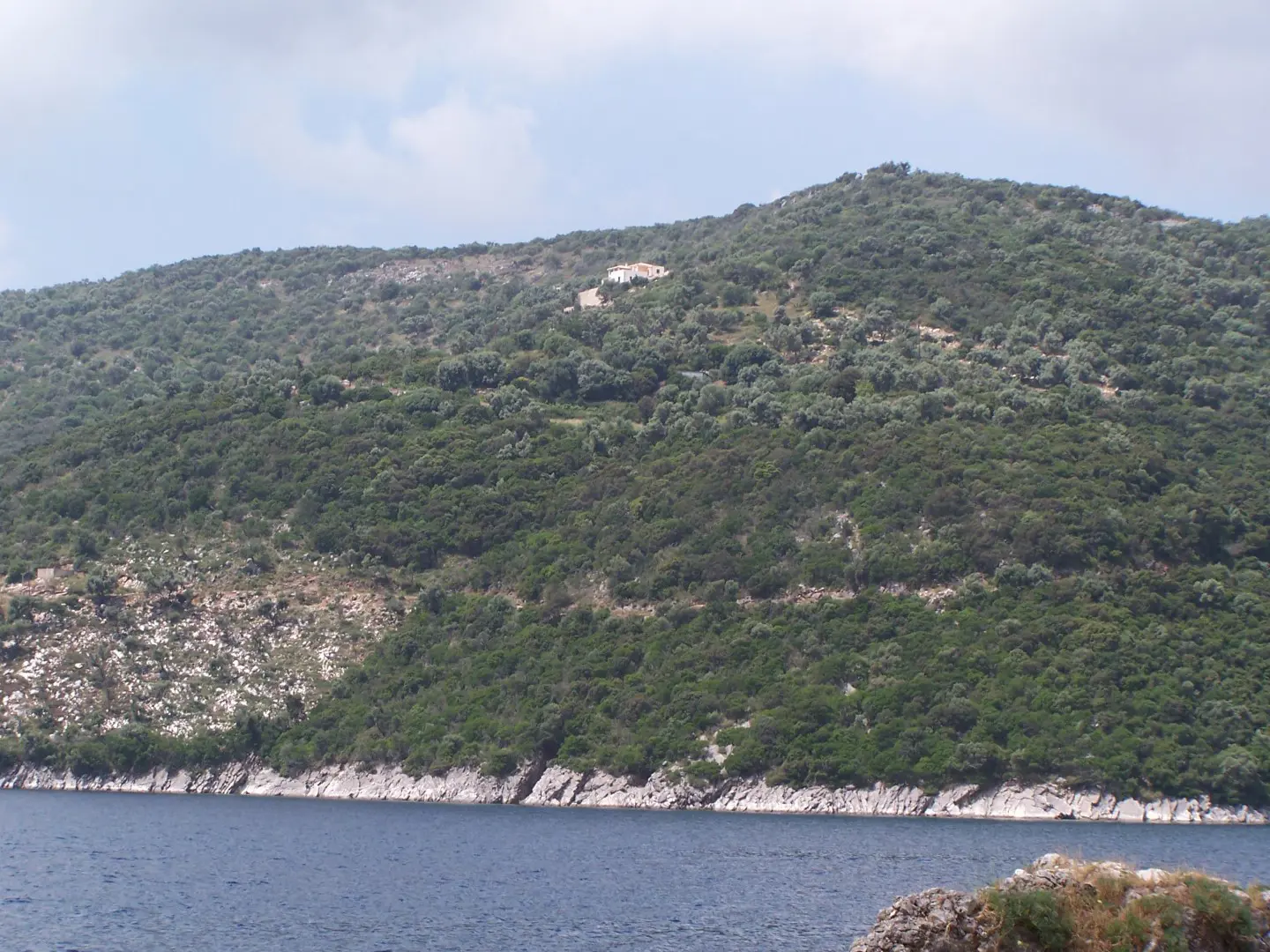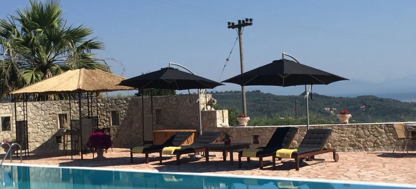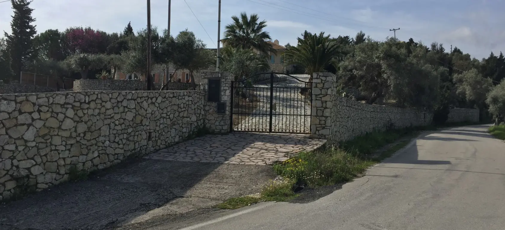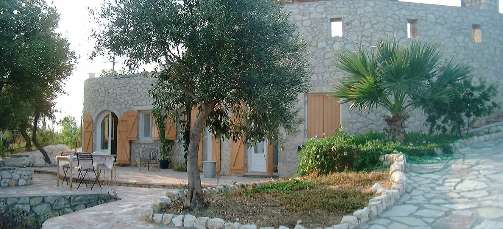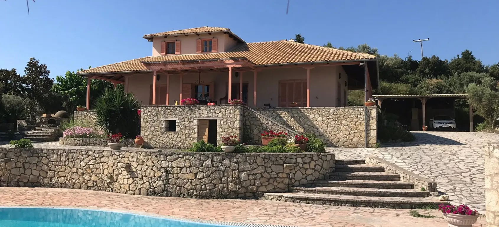 Last summer UK-celebrity LES DENNIS rented the villa for his family and friends. He told us "This is a unique property and the pool is amazing!" It offers complete privacy.... there is only one (invisible) top-exclusive villa next to you. A tropical style gallery is integrated to the main house and keeps the house cool in the summer and dry in the winter. The main house has four bedrooms, two bathrooms and a fully equipped kitchen. The master bedroom at the first floor has it's own bathroom and a working space with desk. The guesthouse has curved walls and is built from natural stones. It has it's own large terrace with olive trees for shadow. It has two big rooms, an open plan kitchen and bathroom and was used by the (Dutch) owner mainly for his creative work. The guesthouse sleeps four persons. The guesthouse is invisible from the main house. The pool is hundred square meter with a depth from 1.5 meter to 2,6 meter and is seen as the largest private pool of Lefkada. The maximum depth guarantees save diving from the diving board (which almost all pools don't offer). The pool is surrounded by large terraces and is only visible from the main house. The property has a wrought iron double swing gate giving entrance to the drive way to the buildings and the garage. The garage gives space to three cars and has a large storage loft. In total the property has 400 square meter natural stone terraces and at the entrance of the olive yard stands the original woodstove pizza oven with big barbeque. The property has an extra building capacity of 402 square meter. Lefkada is an island connected by a pontoon-bridge to the mainland. This means easy traveling to the nearby airport or visits to the many interesting historical and touristic places.