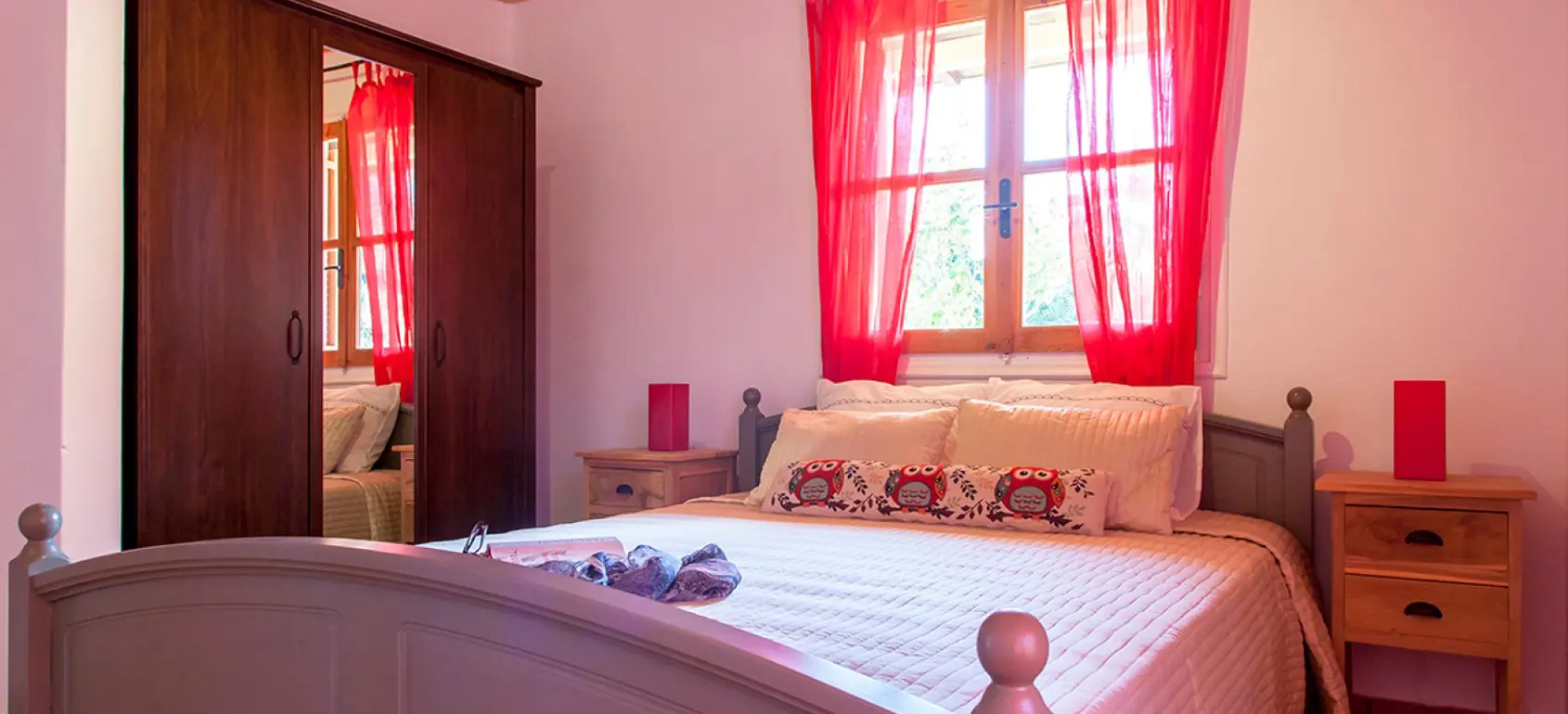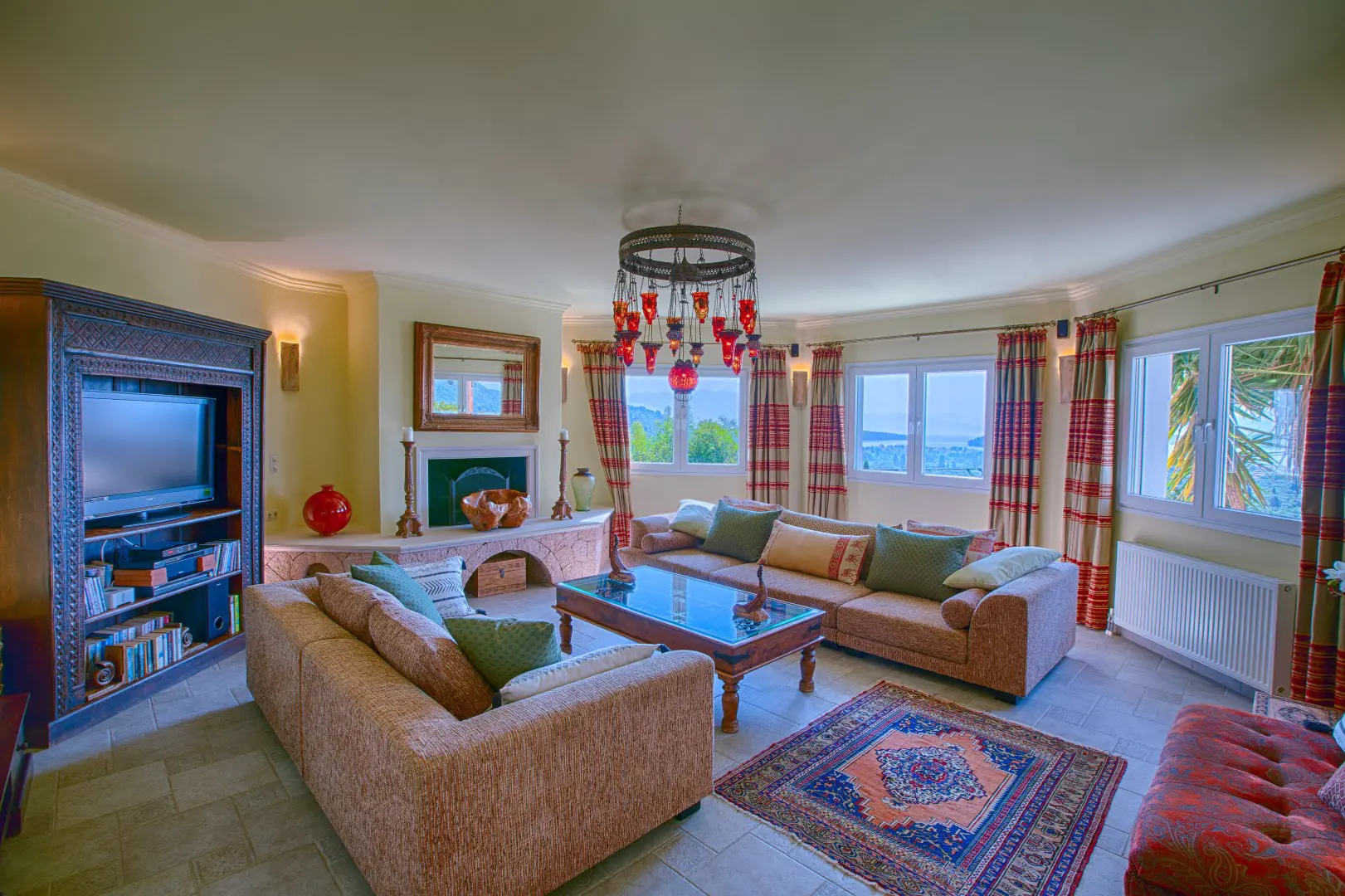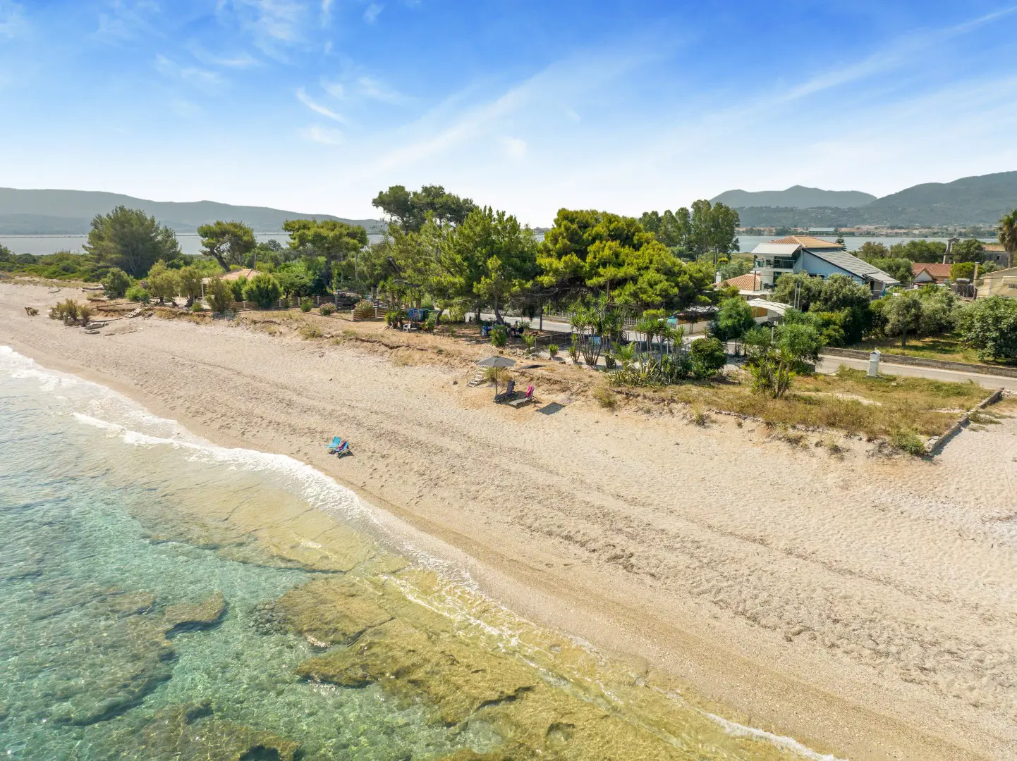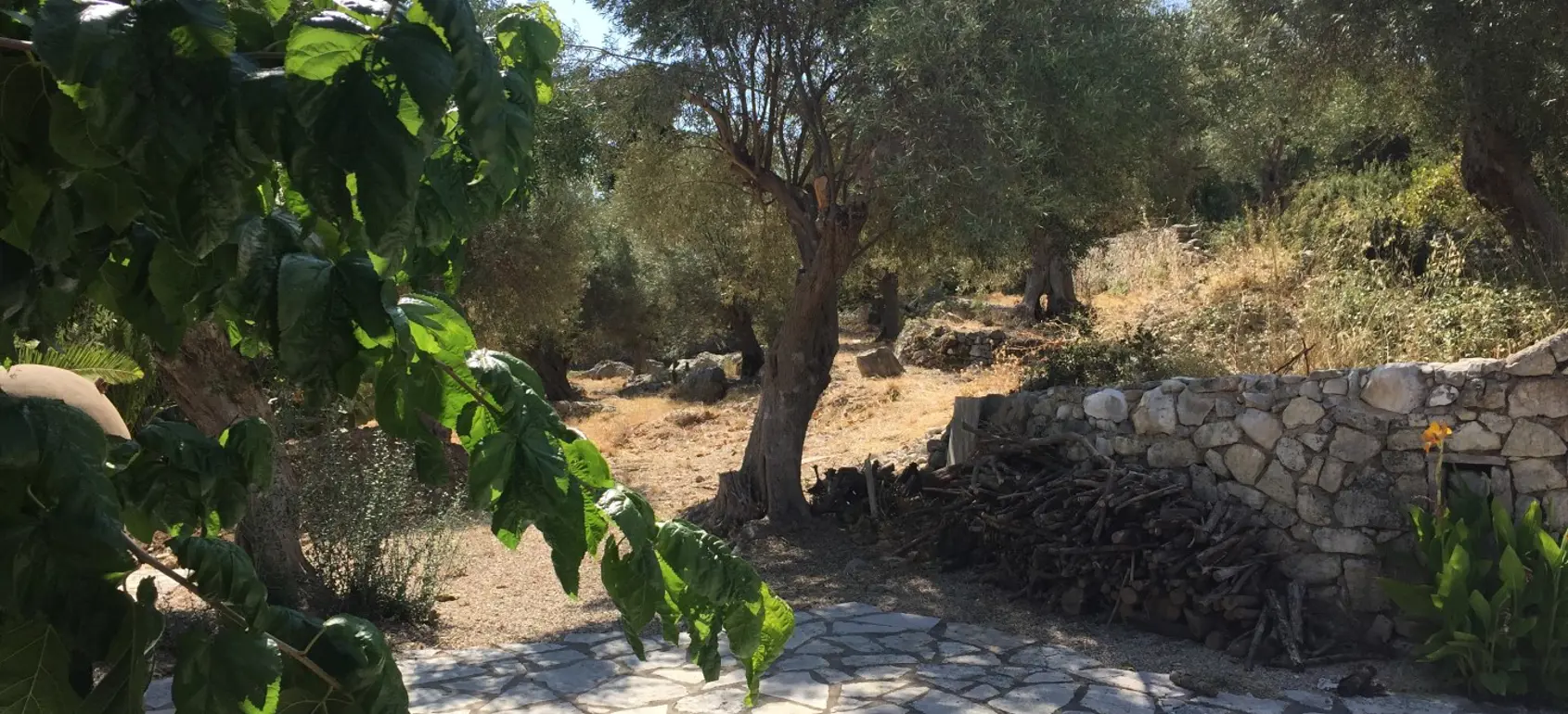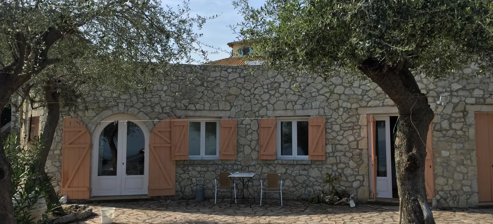 Last summer UK-celebrity LES DENNIS rented the villa for his family and friends. He told us "This is a unique property and the pool is amazing!" It offers complete privacy.... there is only one (invisible) top-exclusive villa next to you. A tropical style gallery is integrated to the main house and keeps the house cool in the summer and dry in the winter. The main house has four bedrooms, two bathrooms and a fully equipped kitchen. The master bedroom at the first floor has it's own bathroom and a working space with desk. The guesthouse has curved walls and is built from natural stones. It has it's own large terrace with olive trees for shadow. It has two big rooms, an open plan kitchen and bathroom and was used by the (Dutch) owner mainly for his creative work. The guesthouse sleeps four persons. The guesthouse is invisible from the main house. The pool is hundred square meter with a depth from 1.5 meter to 2,6 meter and is seen as the largest private pool of Lefkada. The maximum depth guarantees save diving from the diving board (which almost all pools don't offer). The pool is surrounded by large terraces and is only visible from the main house. The property has a wrought iron double swing gate giving entrance to the drive way to the buildings and the garage. The garage gives space to three cars and has a large storage loft. In total the property has 400 square meter natural stone terraces and at the entrance of the olive yard stands the original woodstove pizza oven with big barbeque. The property has an extra building capacity of 402 square meter. Lefkada is an island connected by a pontoon-bridge to the mainland. This means easy traveling to the nearby airport or visits to the many interesting historical and touristic places.