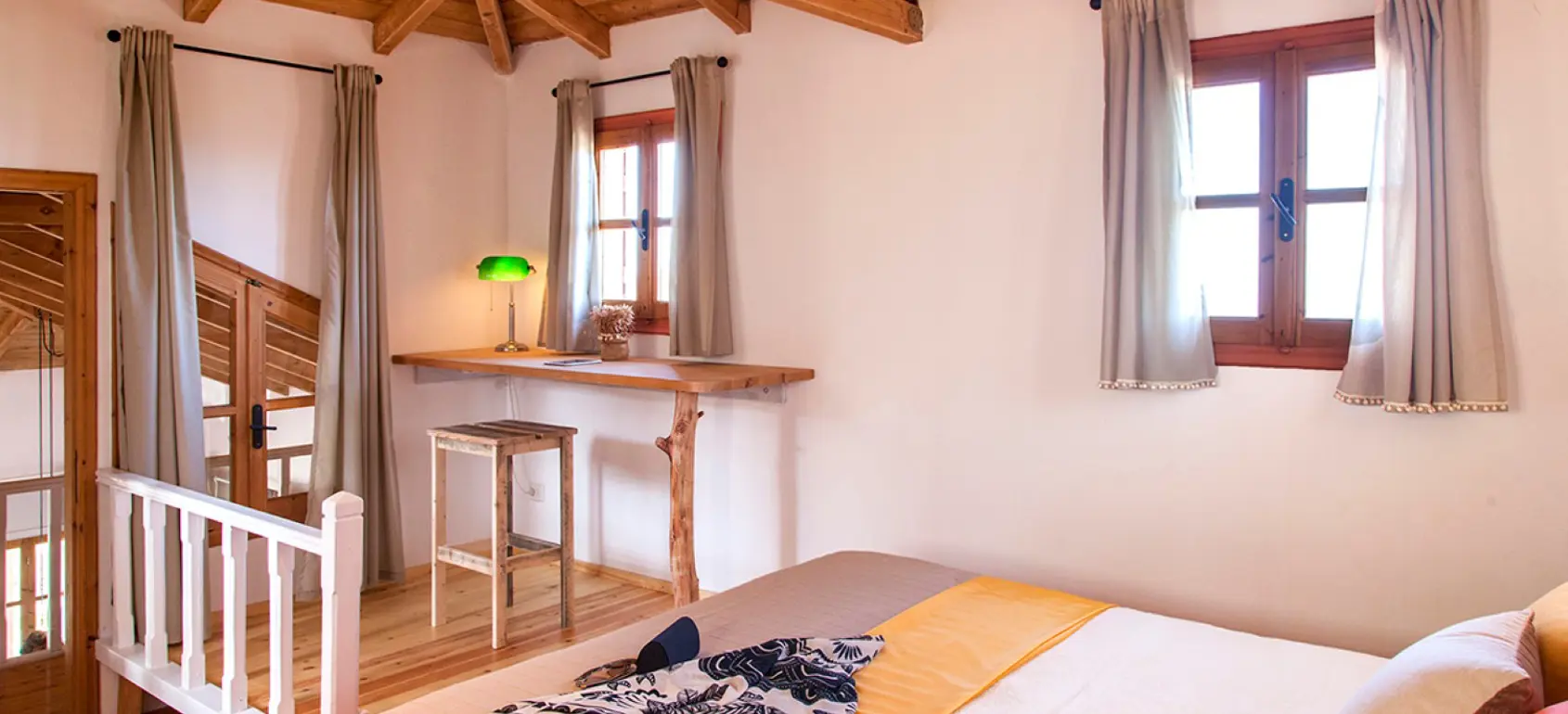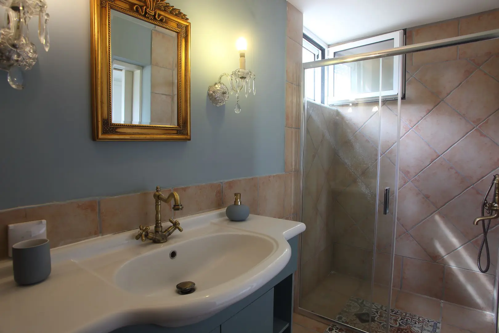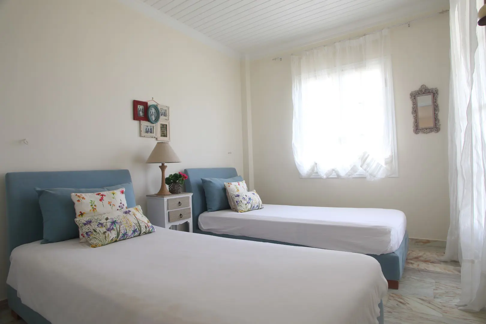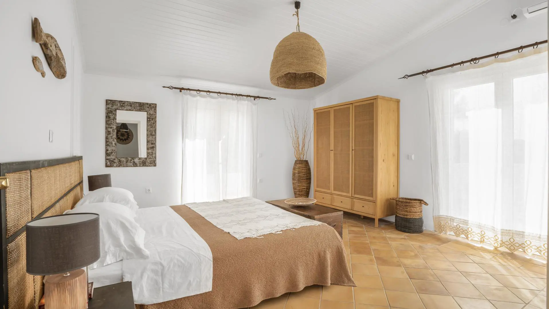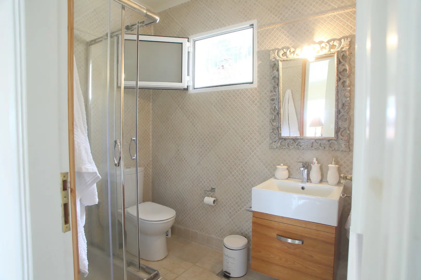 Last summer UK-celebrity LES DENNIS rented the villa for his family and friends. He told us "This is a unique property and the pool is amazing!" It offers complete privacy.... there is only one (invisible) top-exclusive villa next to you. A tropical style gallery is integrated to the main house and keeps the house cool in the summer and dry in the winter. The main house has four bedrooms, two bathrooms and a fully equipped kitchen. The master bedroom at the first floor has it's own bathroom and a working space with desk. The guesthouse has curved walls and is built from natural stones. It has it's own large terrace with olive trees for shadow. It has two big rooms, an open plan kitchen and bathroom and was used by the (Dutch) owner mainly for his creative work. The guesthouse sleeps four persons. The guesthouse is invisible from the main house. The pool is hundred square meter with a depth from 1.5 meter to 2,6 meter and is seen as the largest private pool of Lefkada. The maximum depth guarantees save diving from the diving board (which almost all pools don't offer). The pool is surrounded by large terraces and is only visible from the main house. The property has a wrought iron double swing gate giving entrance to the drive way to the buildings and the garage. The garage gives space to three cars and has a large storage loft. In total the property has 400 square meter natural stone terraces and at the entrance of the olive yard stands the original woodstove pizza oven with big barbeque. The property has an extra building capacity of 402 square meter. Lefkada is an island connected by a pontoon-bridge to the mainland. This means easy traveling to the nearby airport or visits to the many interesting historical and touristic places.