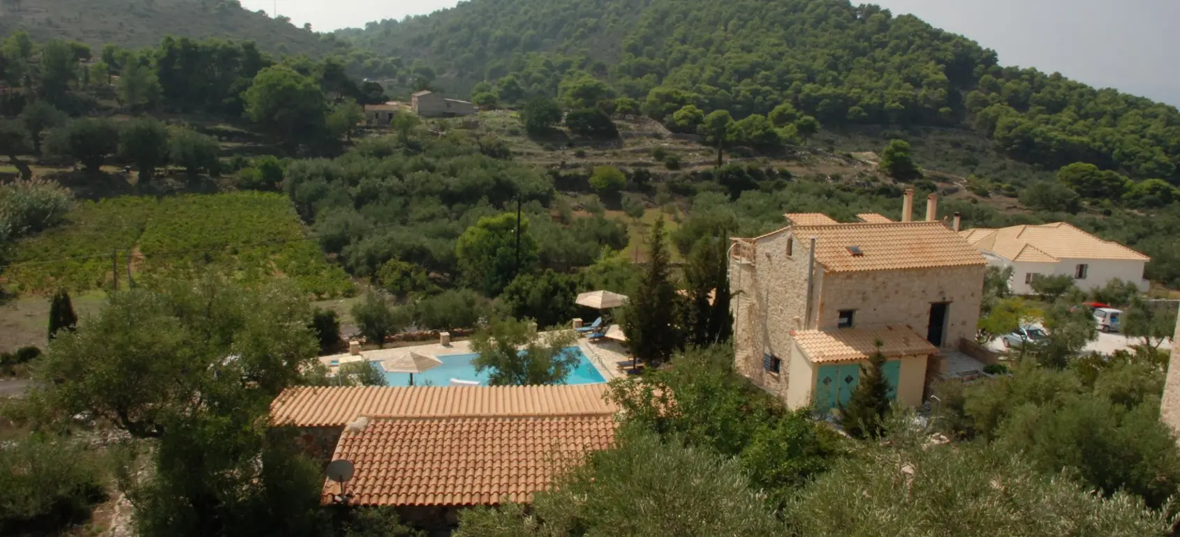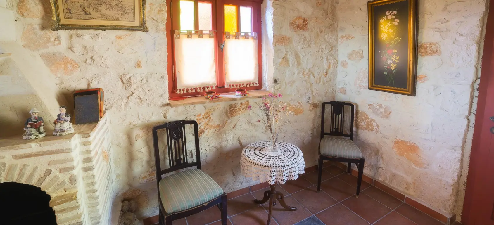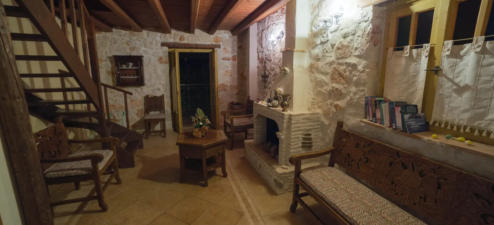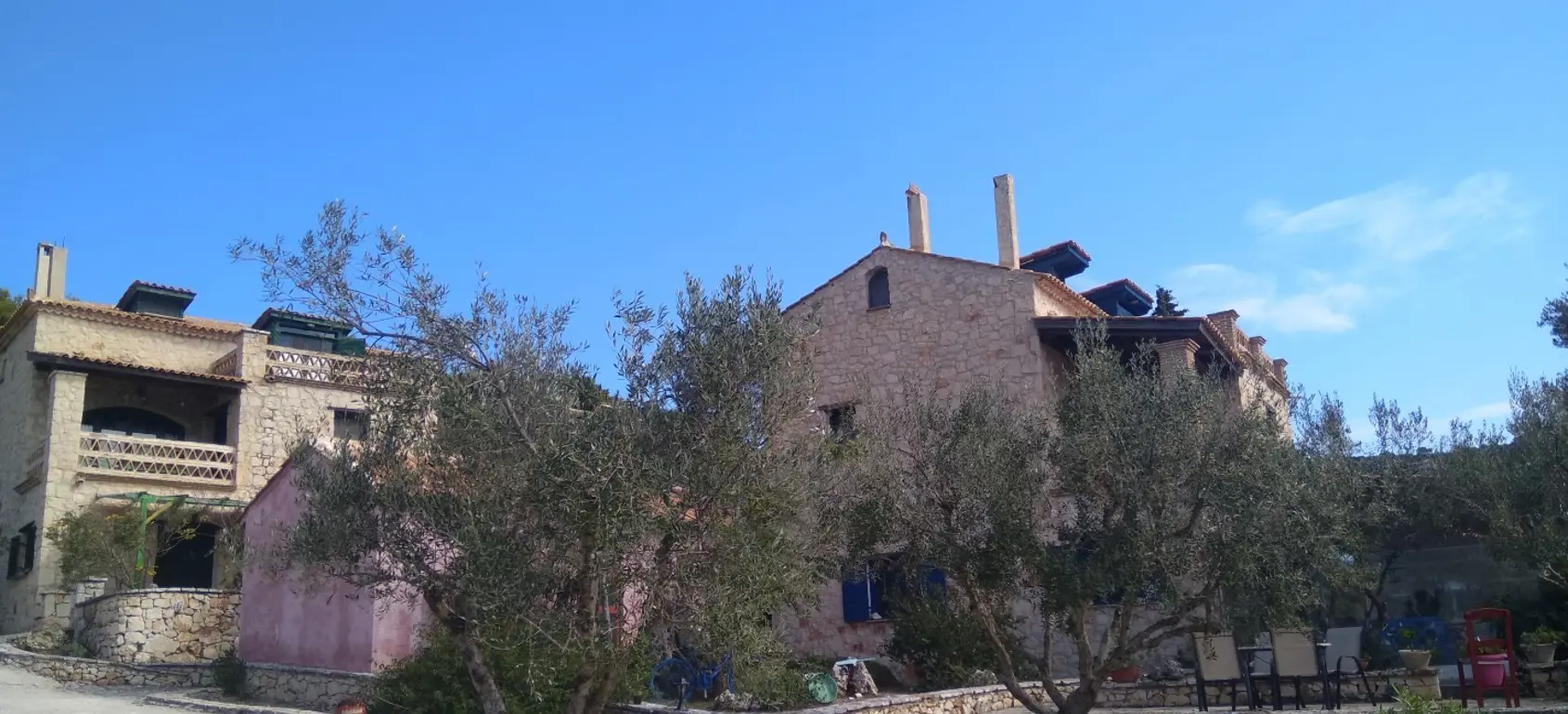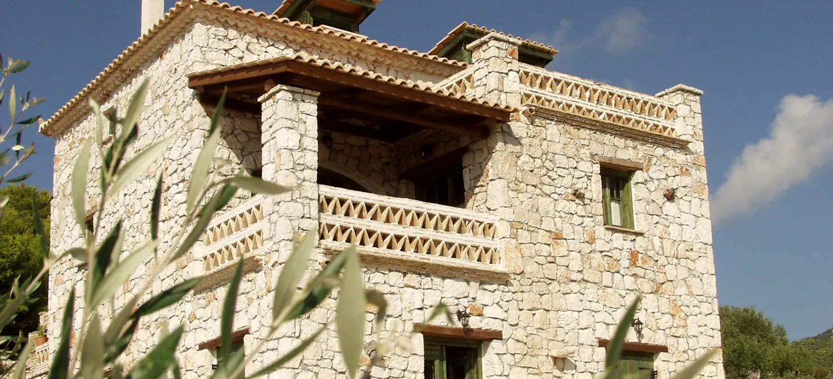 They had used local stone from Kiliomeno village and the type of the stone is very hard and well known all the past years. The walls are double face stone (in-out) and between steel and concrete and that why keep the heating away. The woods that we used are coming from the mainland of Greece and the Venetian roof tiles style is coming from a local small factory.