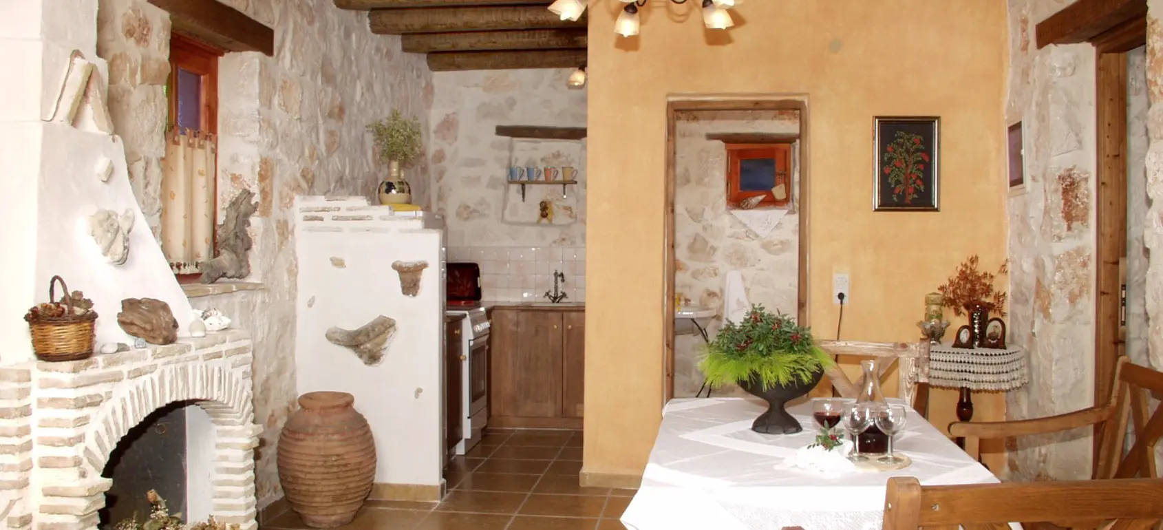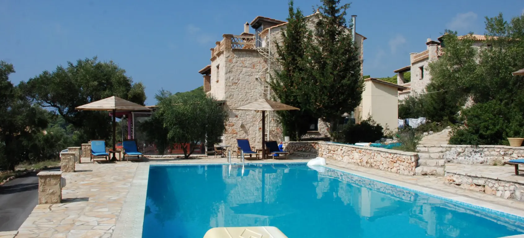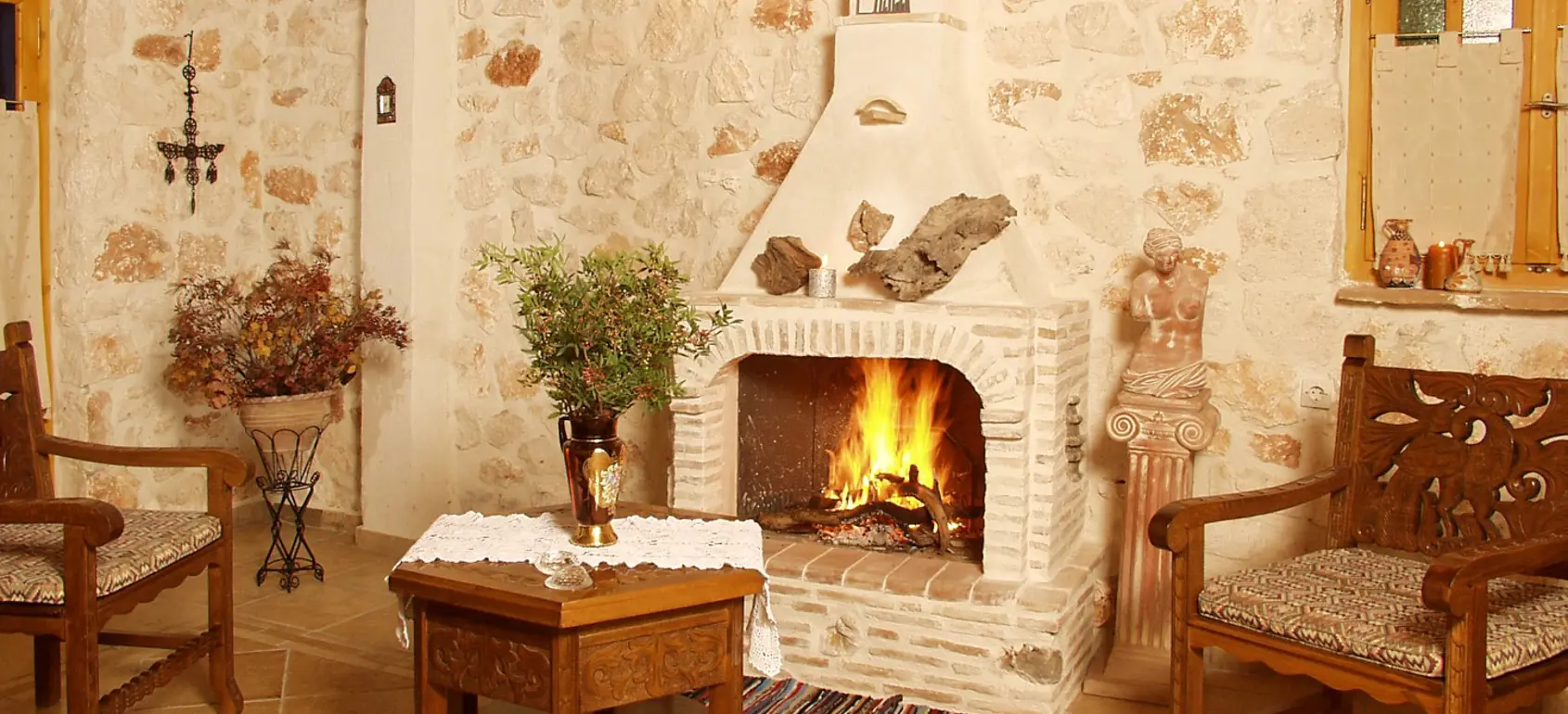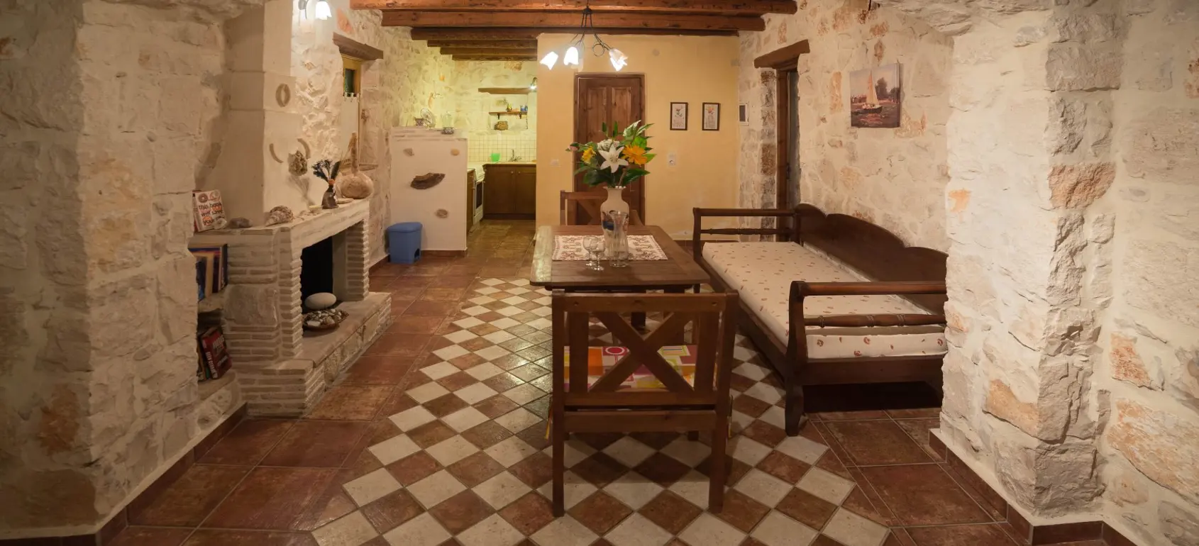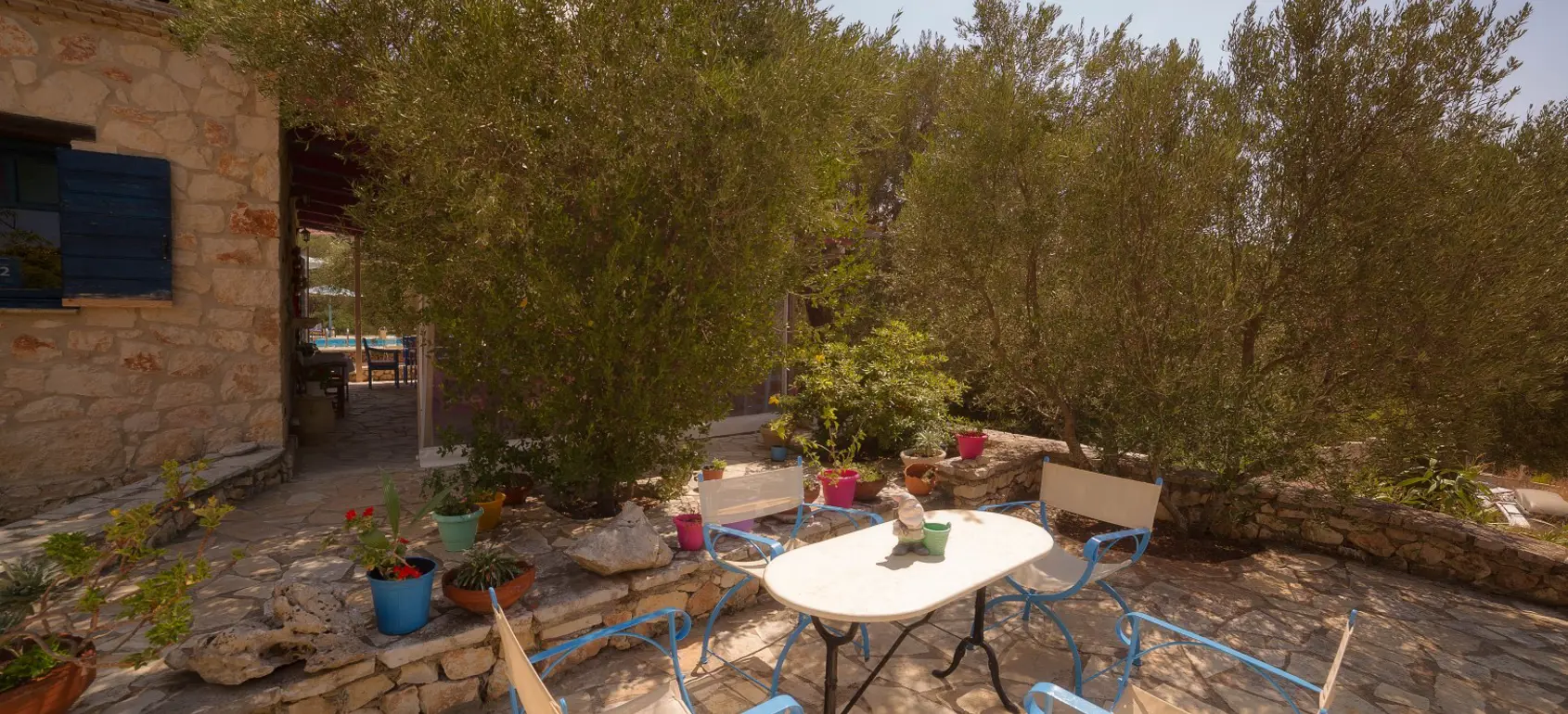 They had used local stone from Kiliomeno village and the type of the stone is very hard and well known all the past years. The walls are double face stone (in-out) and between steel and concrete and that why keep the heating away. The woods that we used are coming from the mainland of Greece and the Venetian roof tiles style is coming from a local small factory.