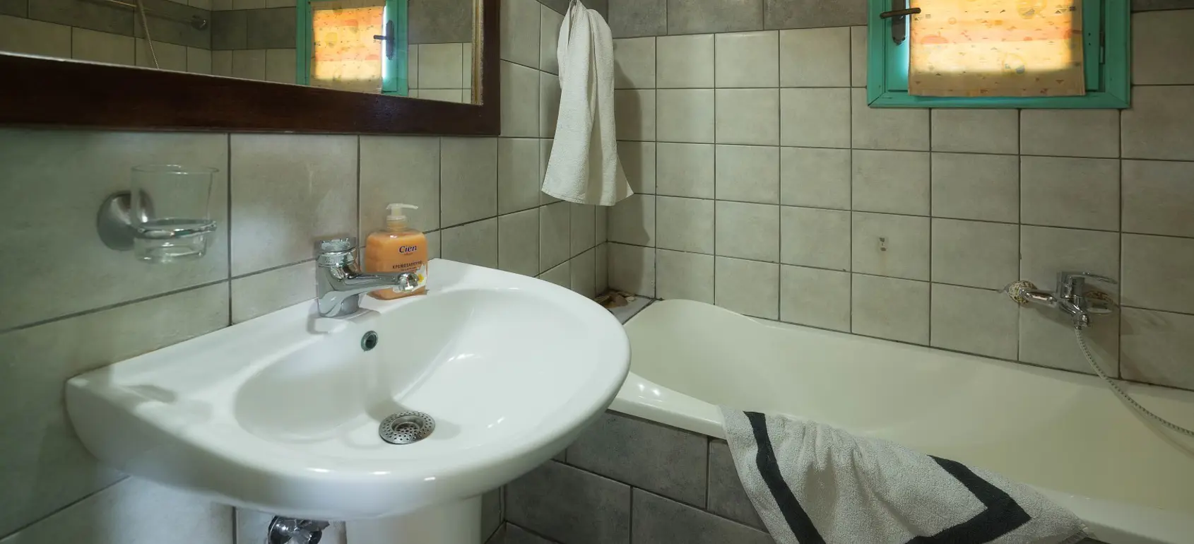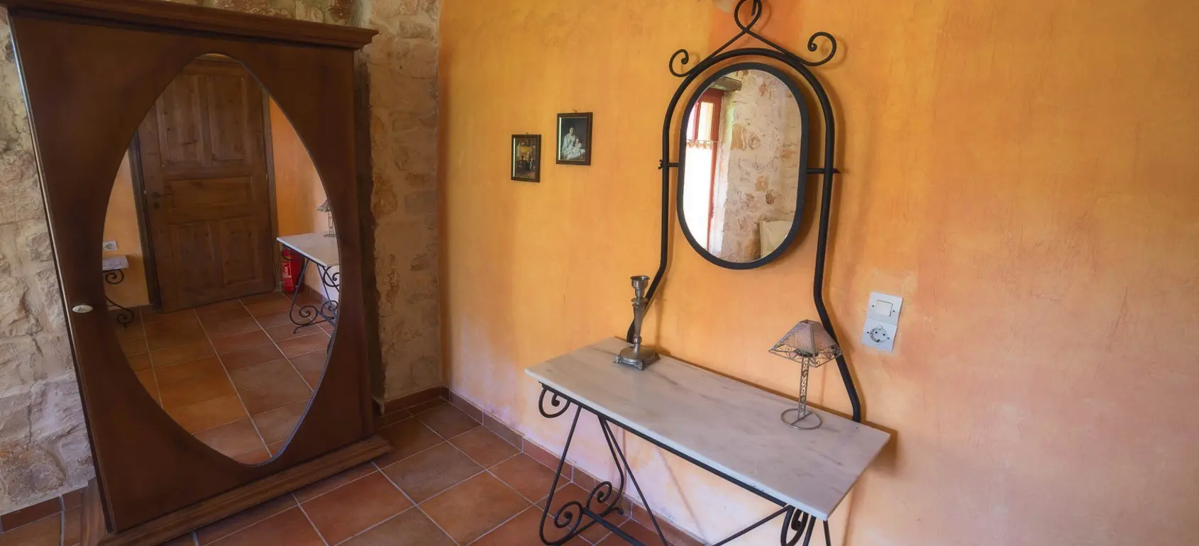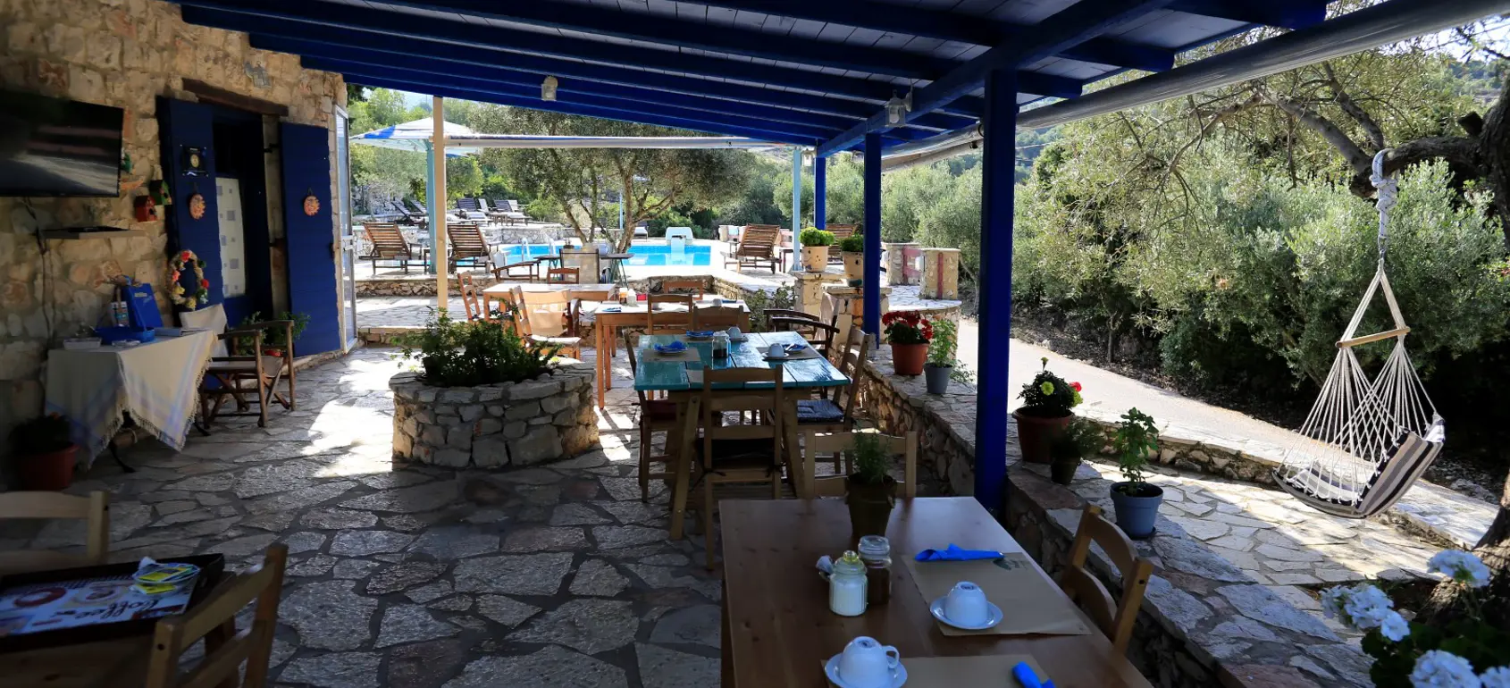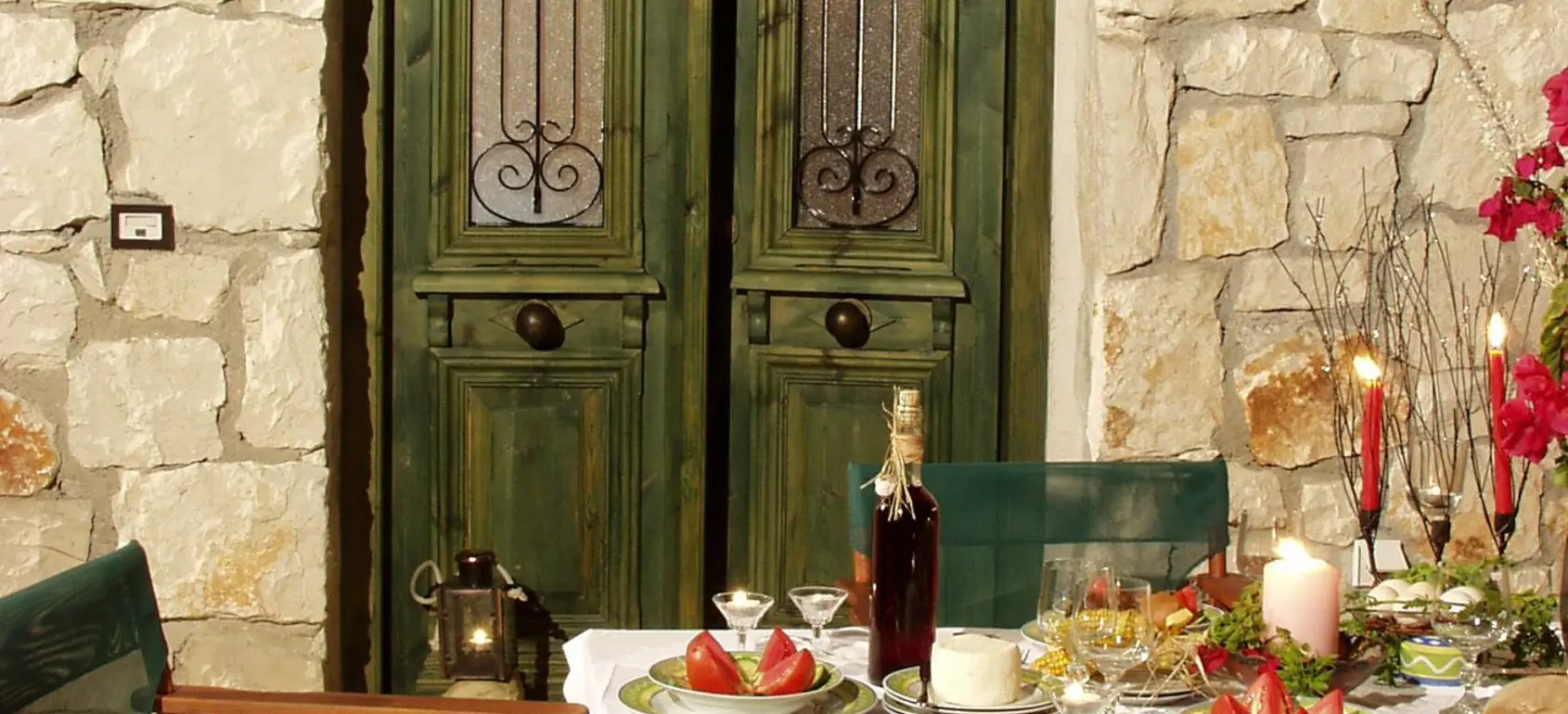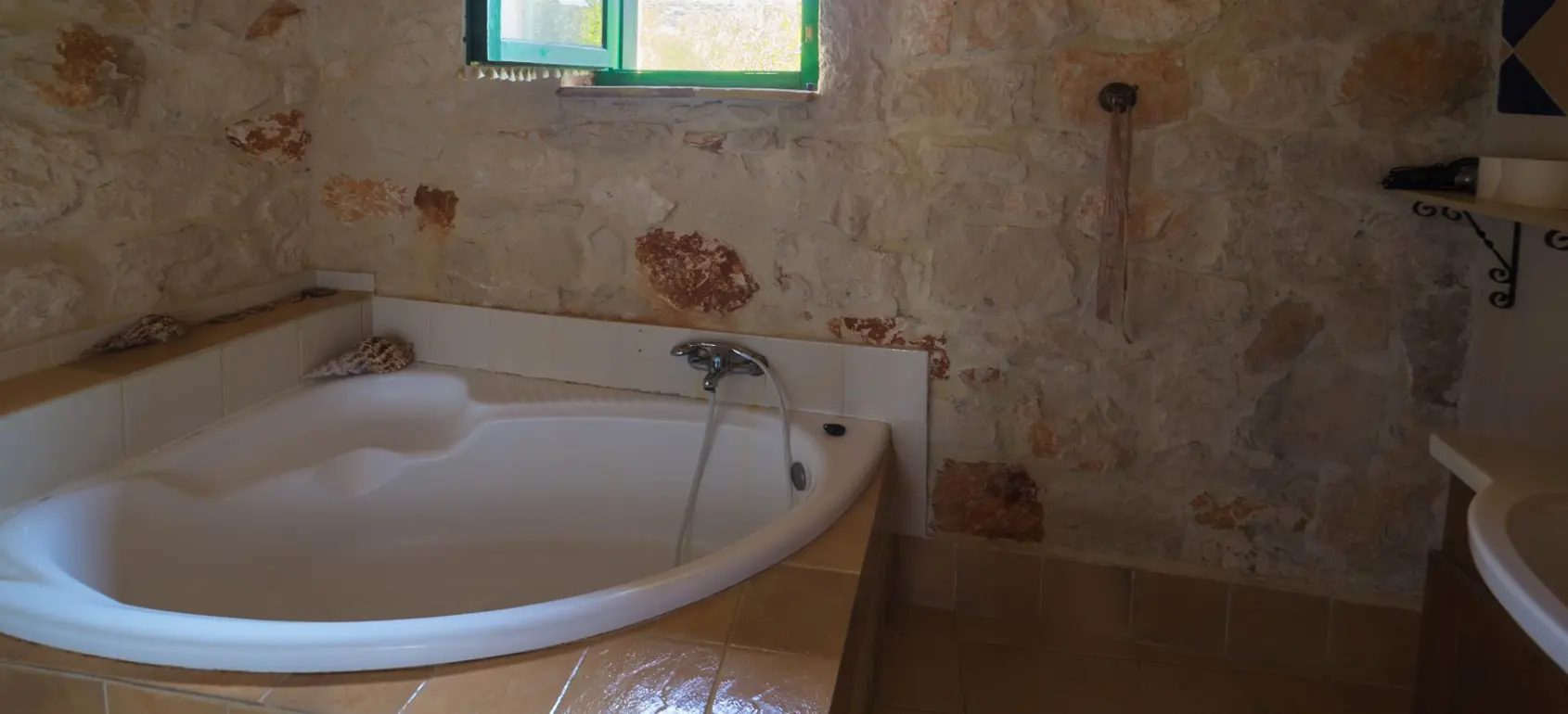 They had used local stone from Kiliomeno village and the type of the stone is very hard and well known all the past years. The walls are double face stone (in-out) and between steel and concrete and that why keep the heating away. The woods that we used are coming from the mainland of Greece and the Venetian roof tiles style is coming from a local small factory.