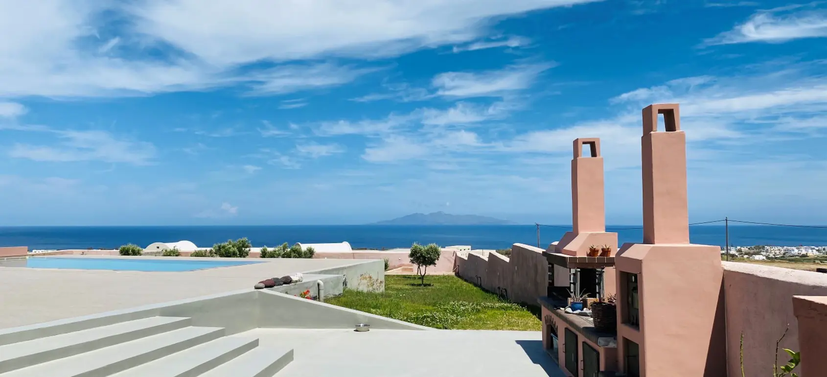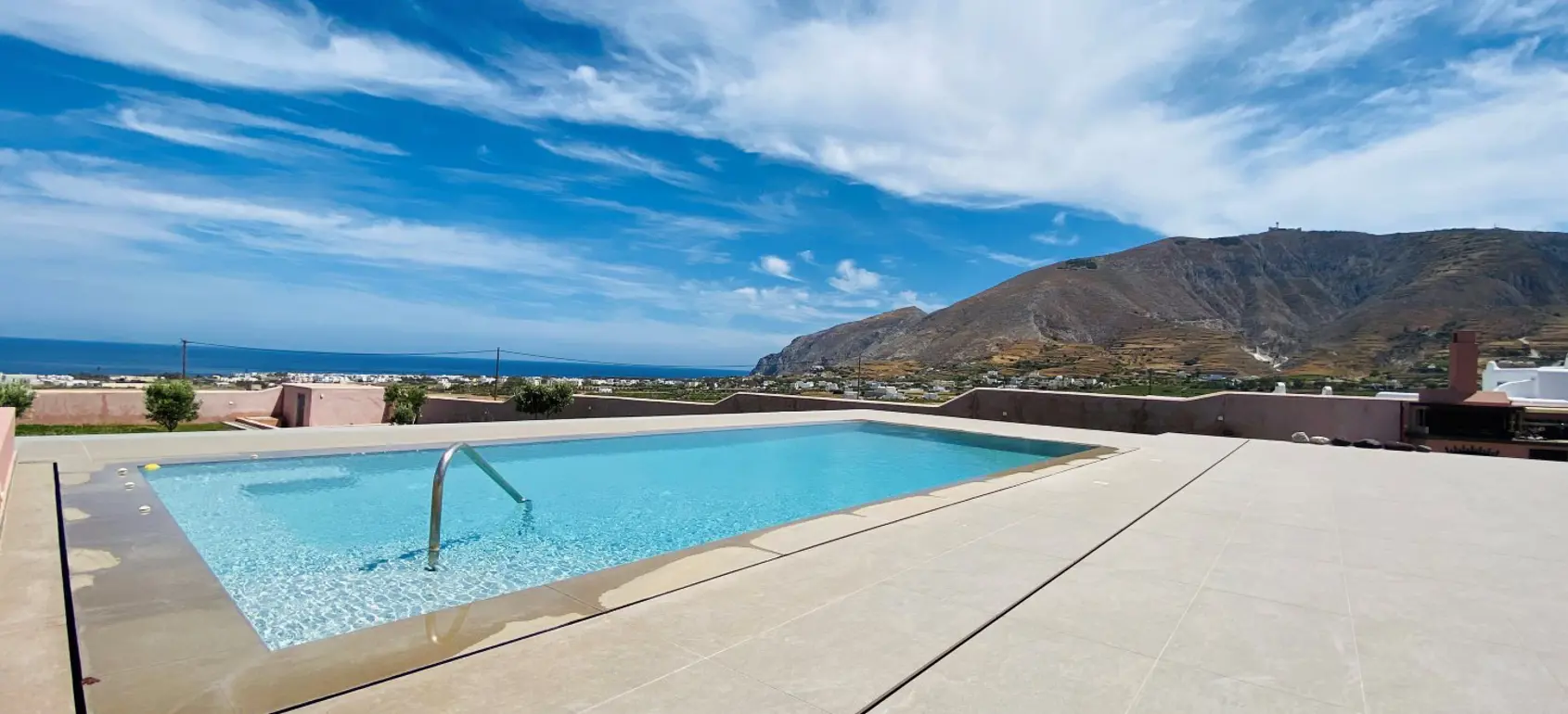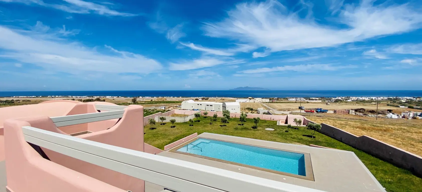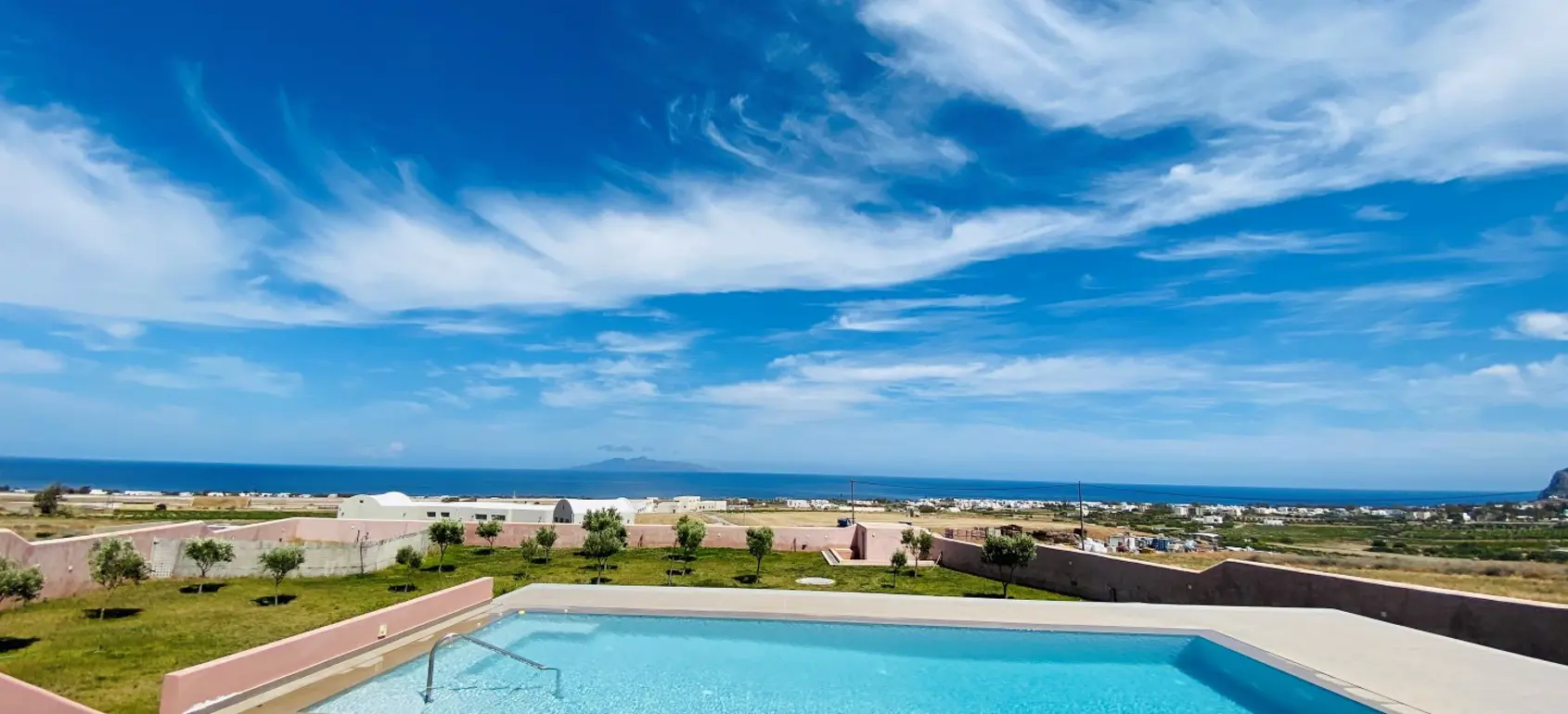 Panoramic views properties of the azure Aegean Sea and the world-famous Santorini sunset