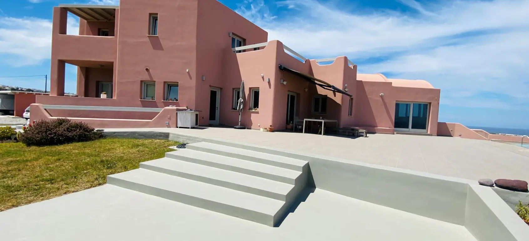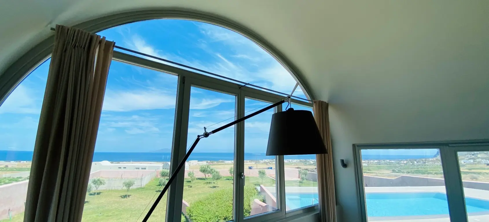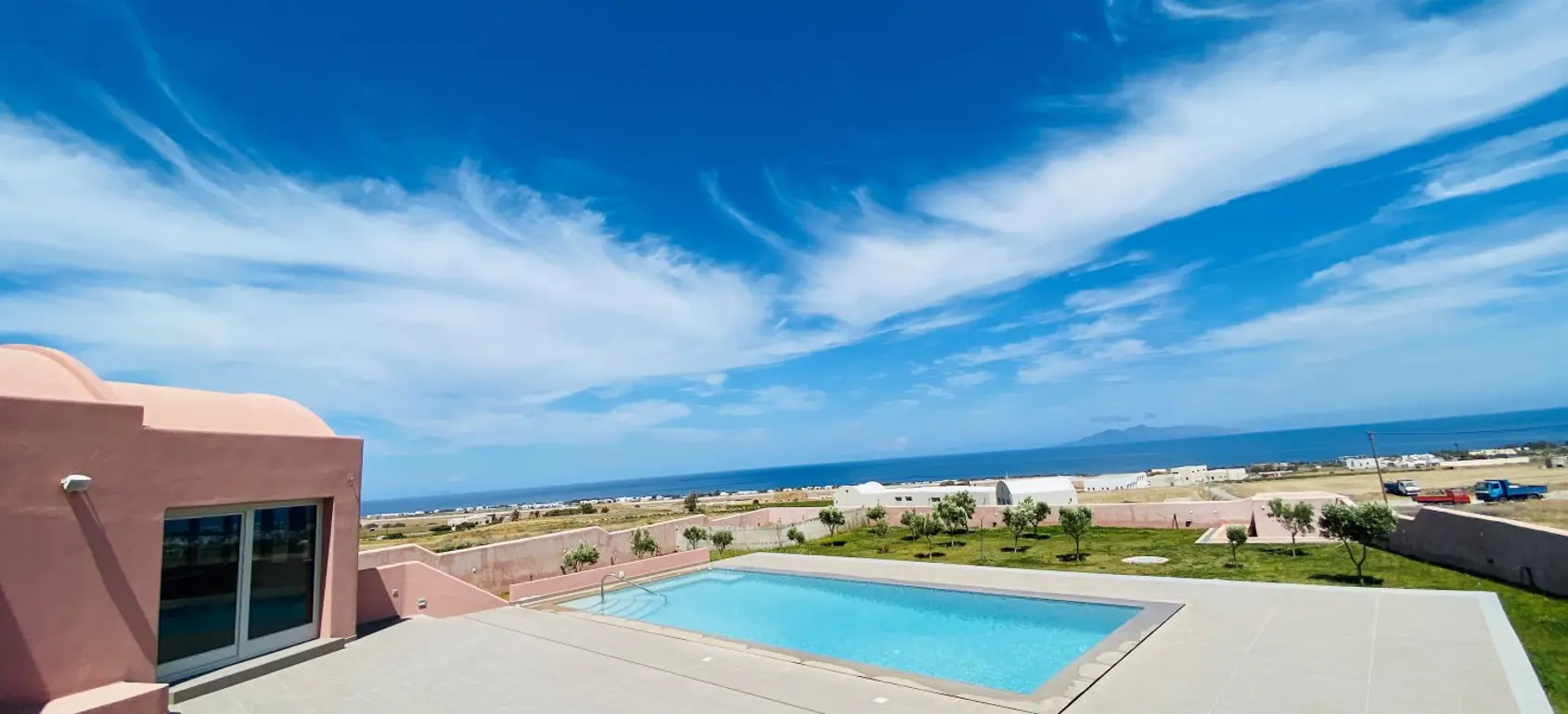 Panoramic views properties of the azure Aegean Sea and the world-famous Santorini sunset