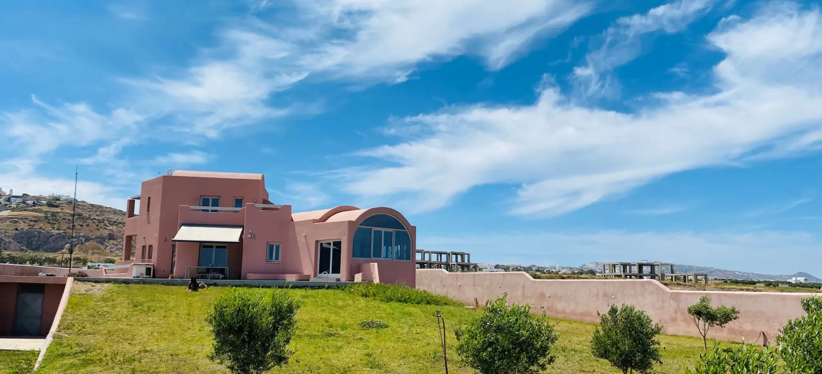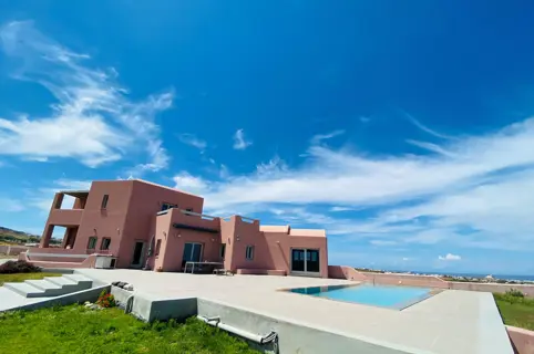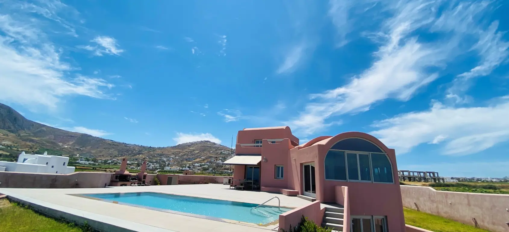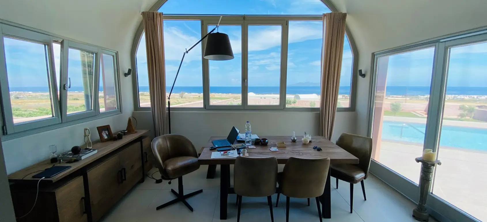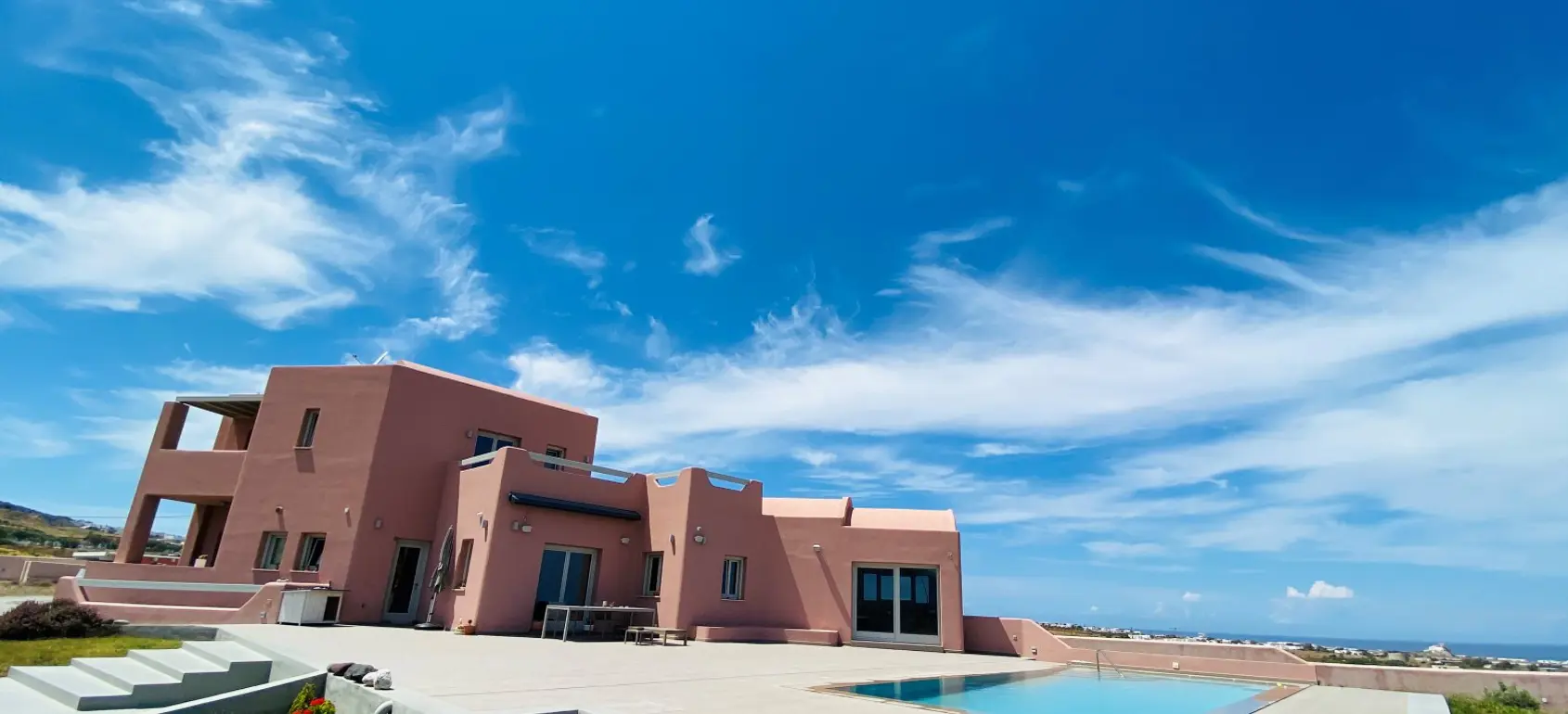 Panoramic views properties of the azure Aegean Sea and the world-famous Santorini sunset