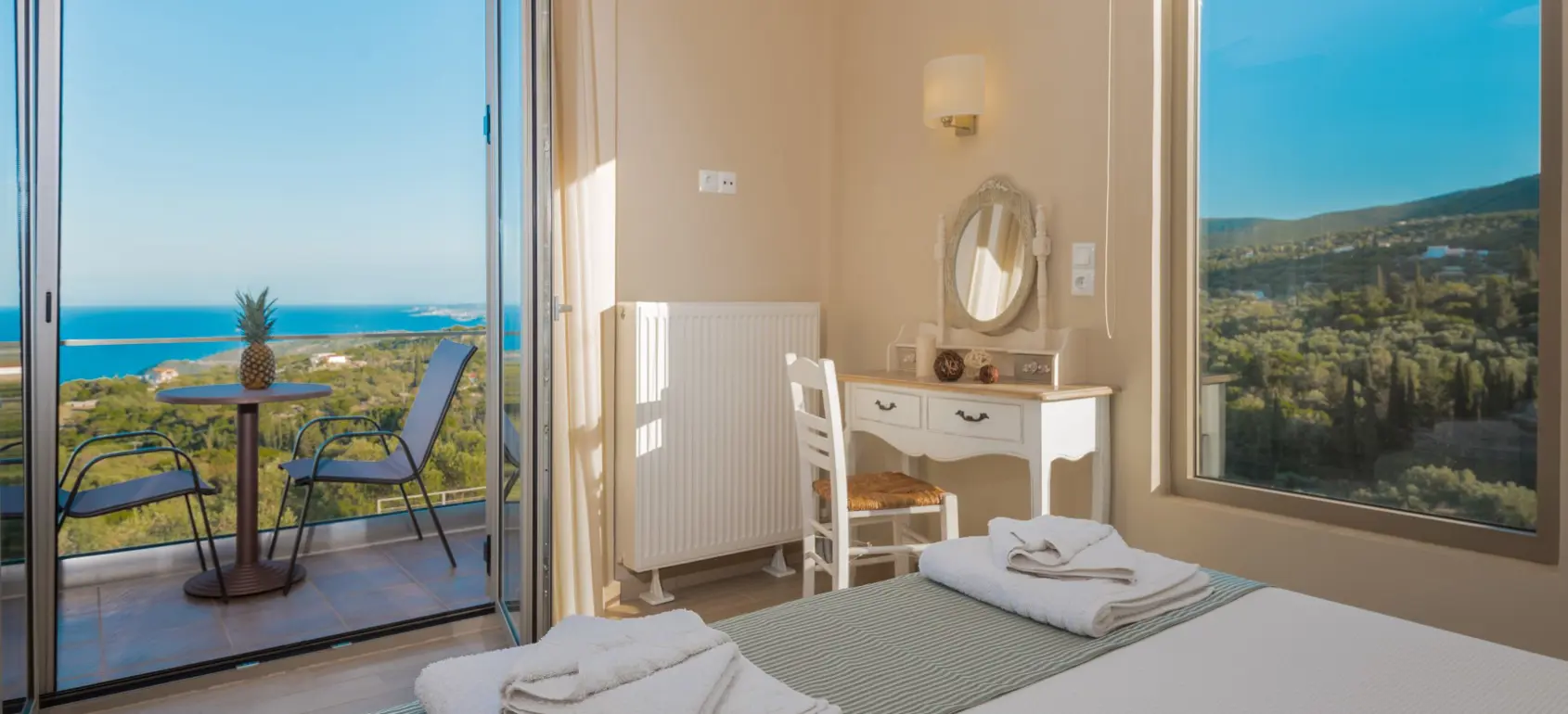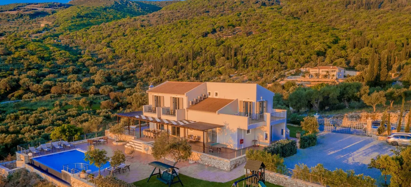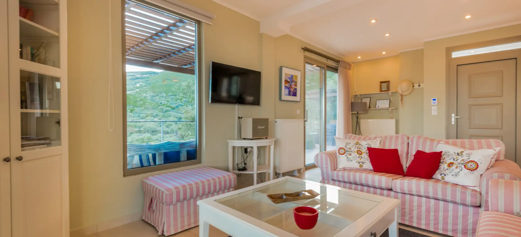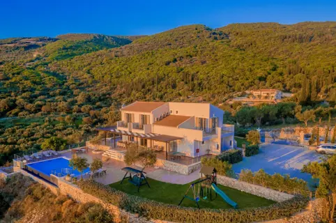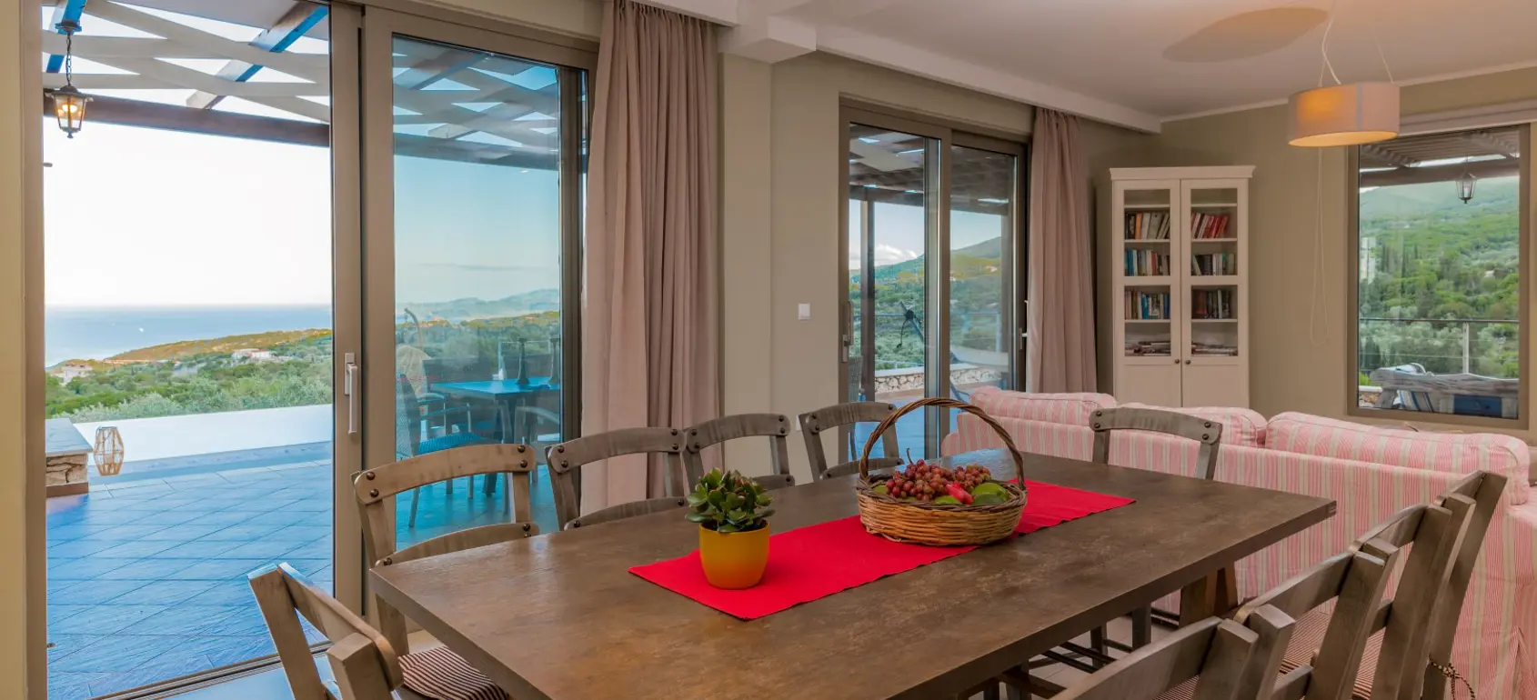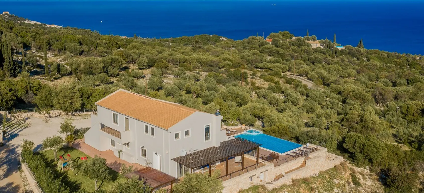 The villa has five bedrooms, all en-suite. There is also a separate family/guests bathroom on the ground floor, equipped with a shower.it is a two story house. The villa is approach by it’s own private road, there is private parking for five cars. From the hall you enter to the spacious living and dining room, with wonderful views across the unspoiled mountainside and east to the Ionian Sea.