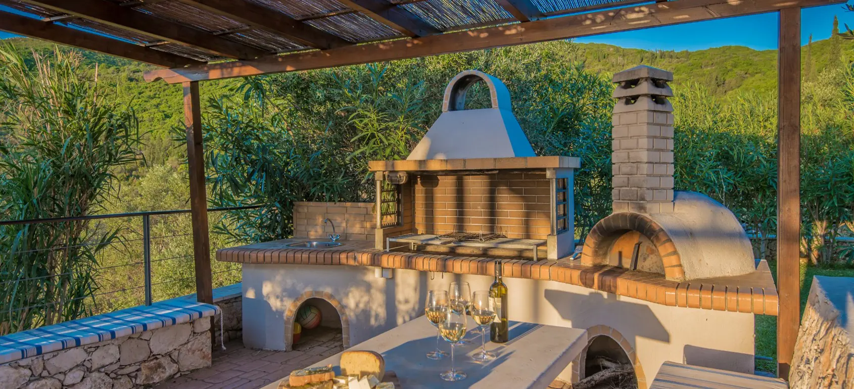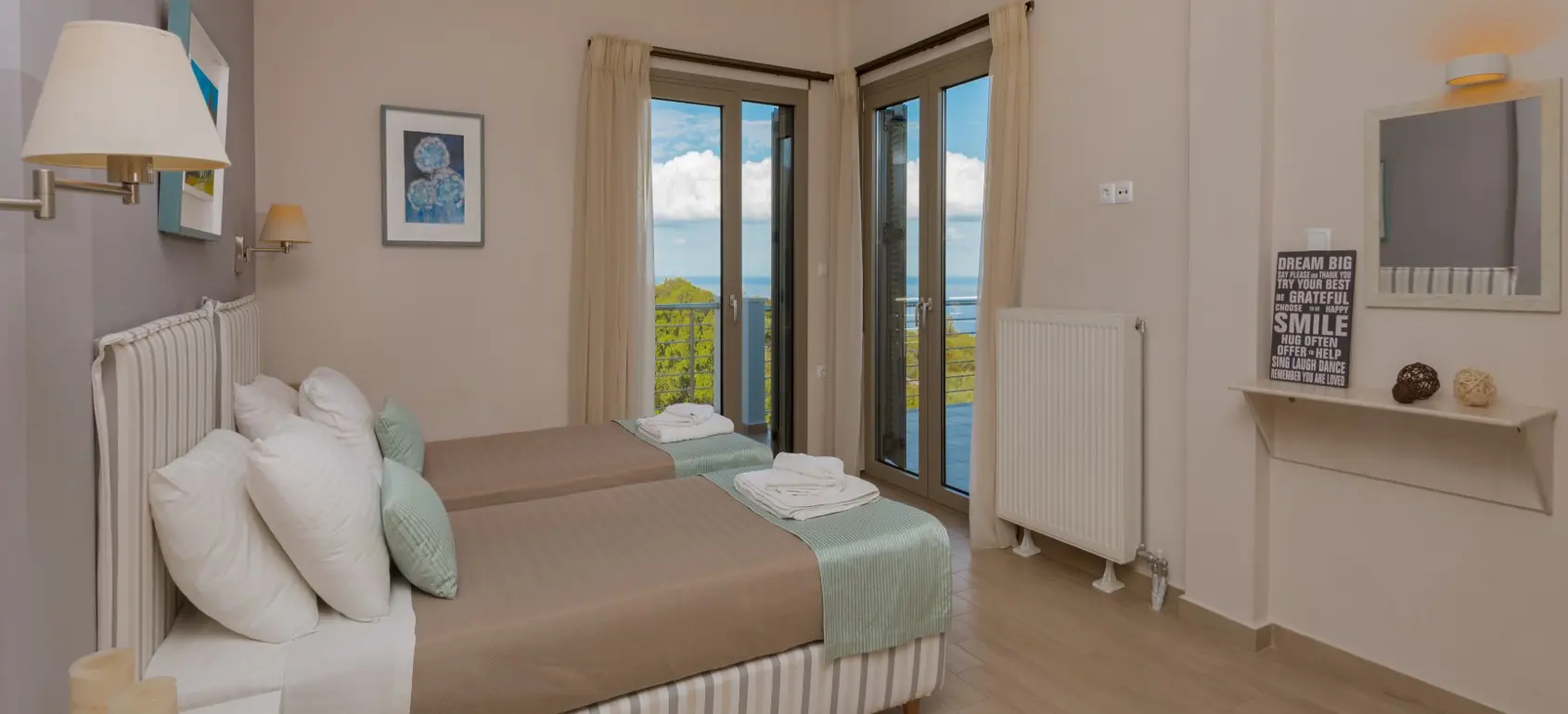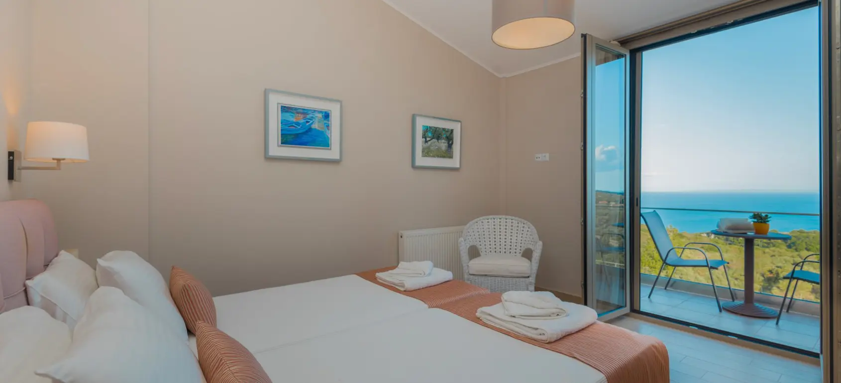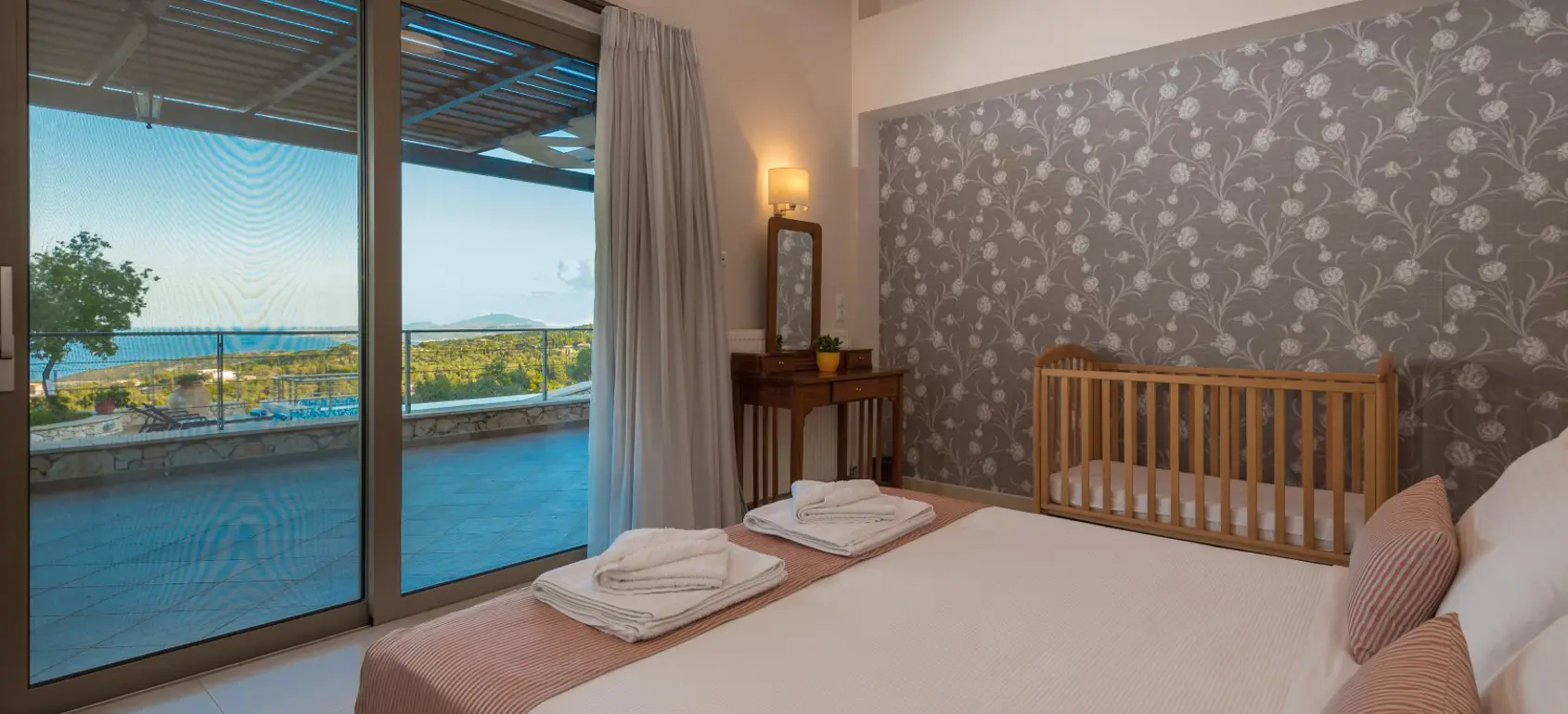 The villa has five bedrooms, all en-suite. There is also a separate family/guests bathroom on the ground floor, equipped with a shower.it is a two story house. The villa is approach by it’s own private road, there is private parking for five cars. From the hall you enter to the spacious living and dining room, with wonderful views across the unspoiled mountainside and east to the Ionian Sea.