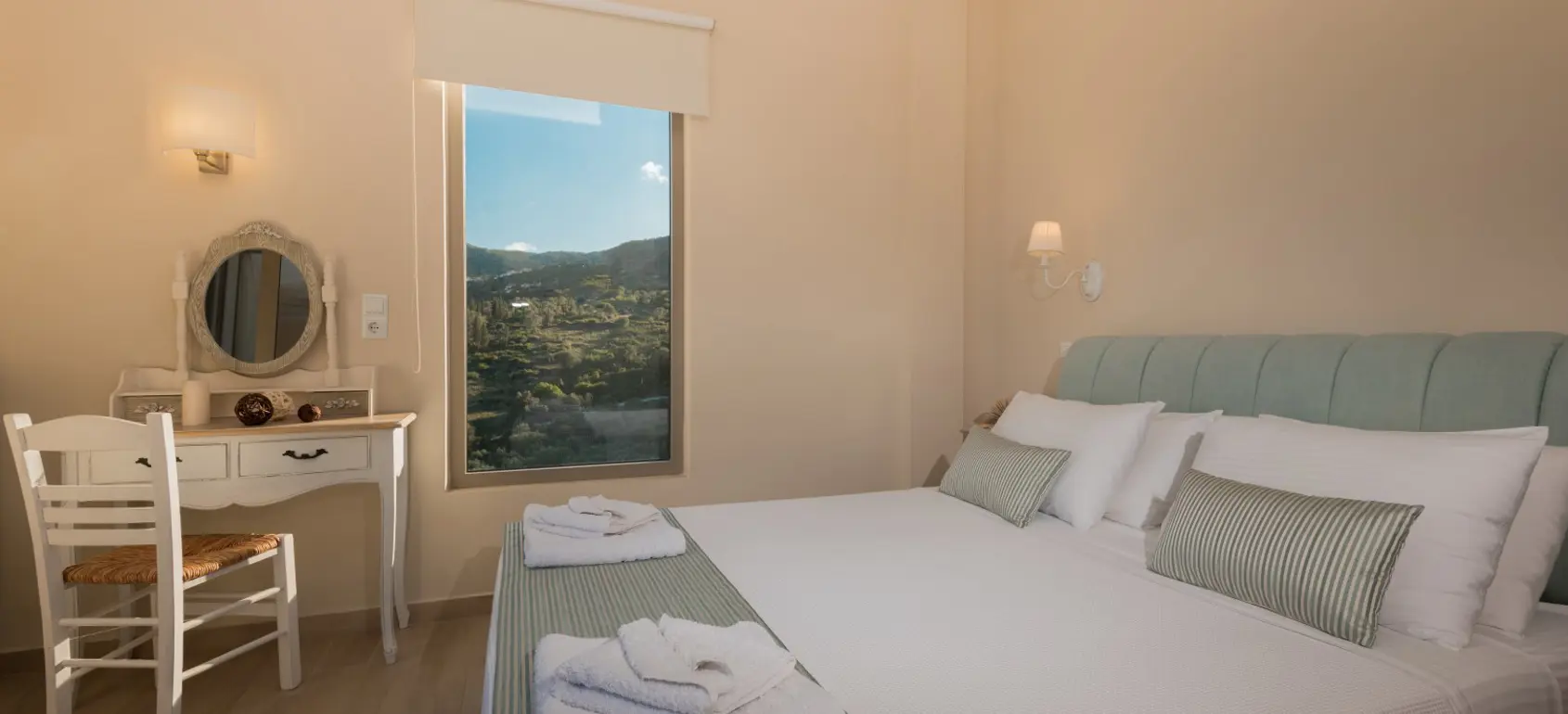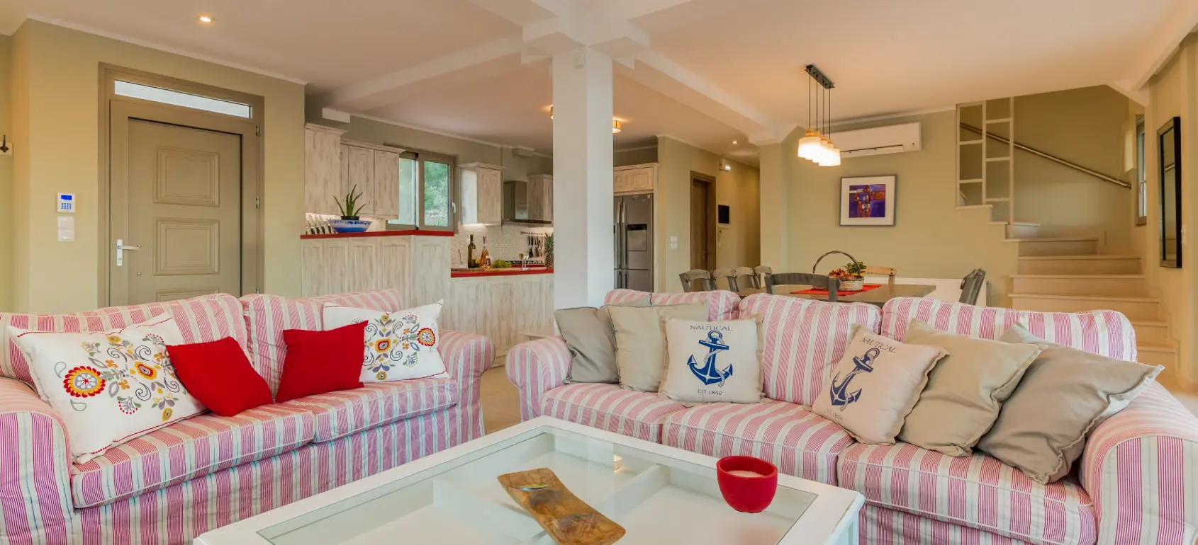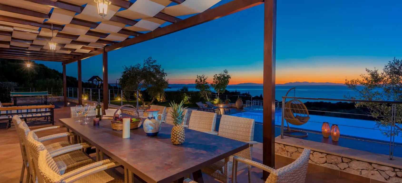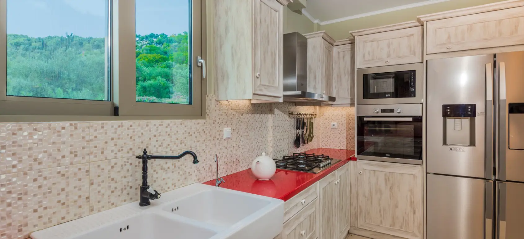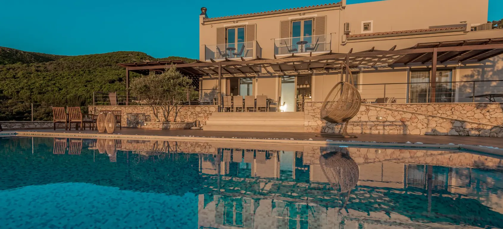 The villa has five bedrooms, all en-suite. There is also a separate family/guests bathroom on the ground floor, equipped with a shower.it is a two story house. The villa is approach by it’s own private road, there is private parking for five cars. From the hall you enter to the spacious living and dining room, with wonderful views across the unspoiled mountainside and east to the Ionian Sea.