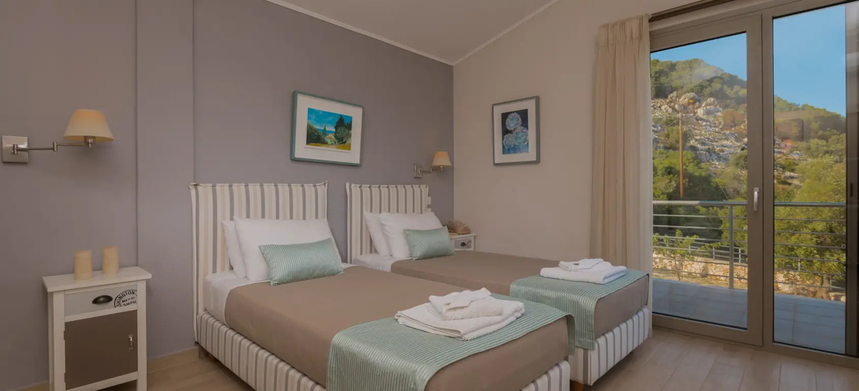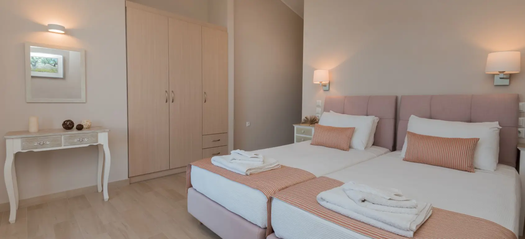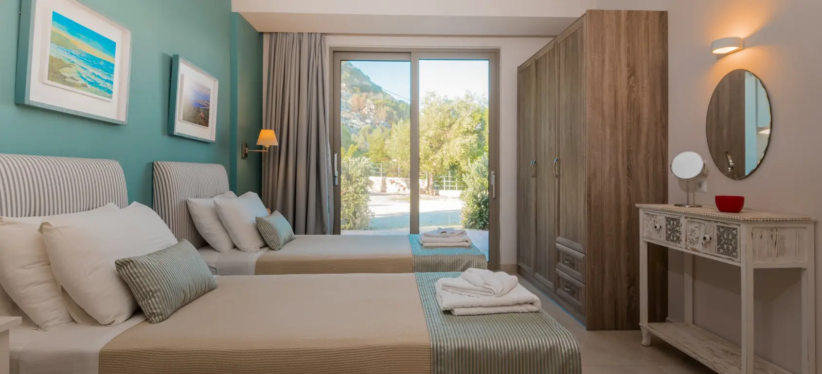 The surrounding area is filled with beautiful beaches (mainly pebble) and a handful of great restaurants and bars. The picturesque little fishing port of Agios Nikolaos is 2 km away which offers a small selection of local amenities and trips to the famous Shipwreck Cove and Blue Caves.