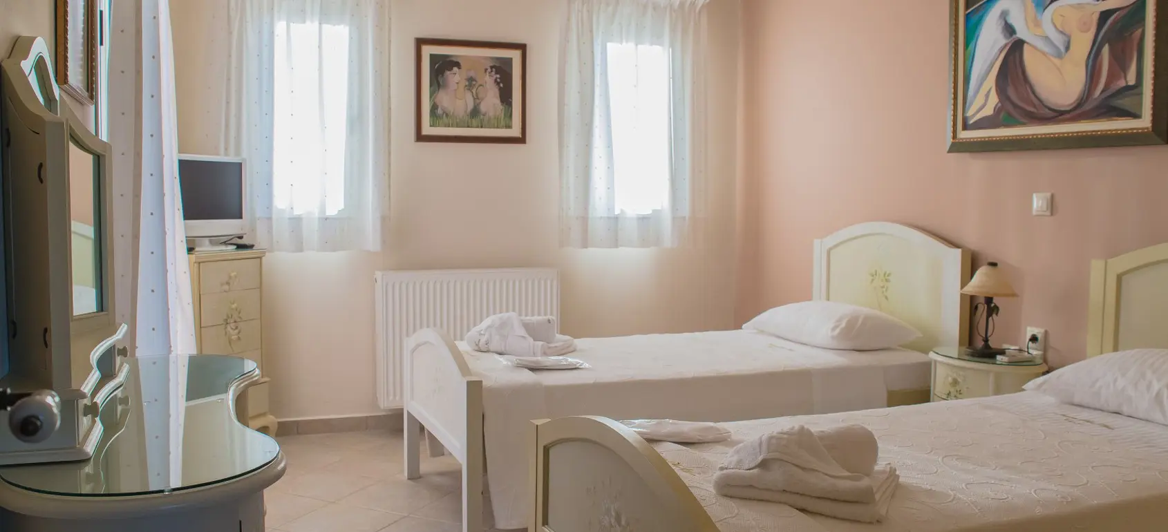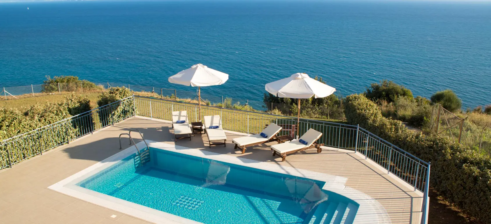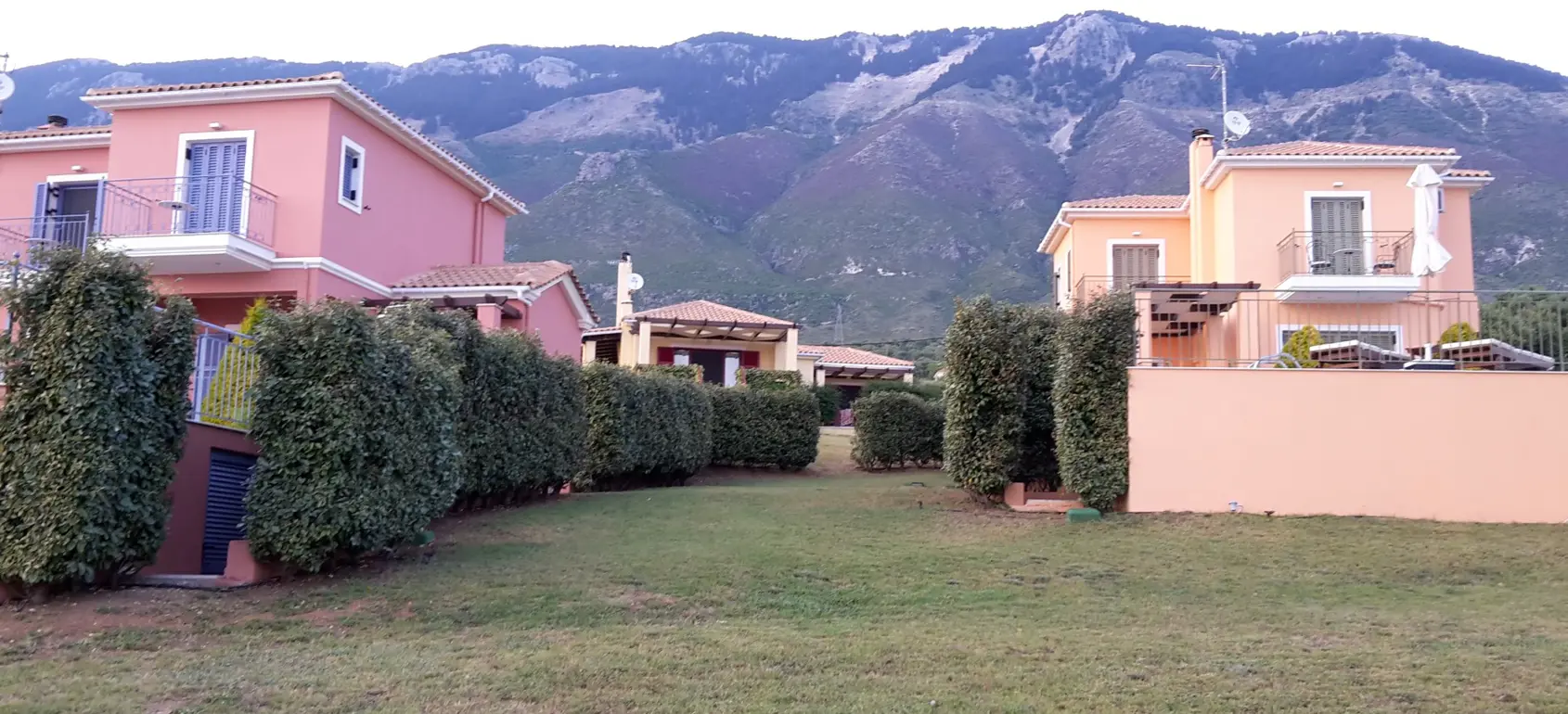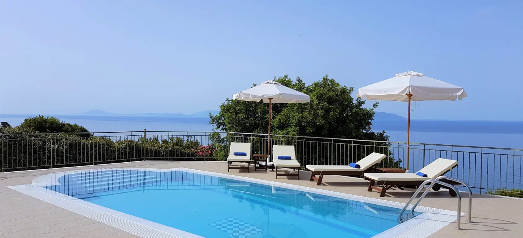 Description of the two 100 sqm villas: The ground floors include the living room and in front of the fireplace there are sofas, as well as a traditionally decorated kitchen and dining room. Moreover, there is a WC and a laundry space. The veranda with the trellis provides a table and seats and the pool area, umbrellas and deck chairs for sunbathing. At the upper floor there are two bedrooms, two bathrooms and a desk space. The bedroom with the twin size steel bed and the fly net has an internal bathroom which includes a hydro massage shower. The other bedroom, with the single beds provides a bathroom with a hydro massage bathtub. The view towards the Ionian sea, from every aspect of the villas is breath-taking during both day and night.