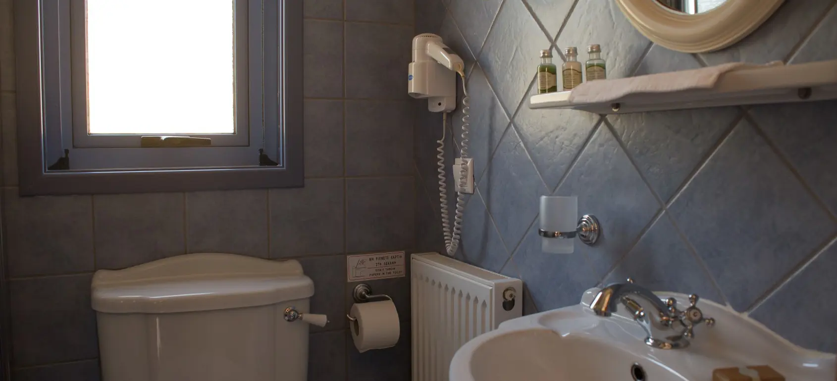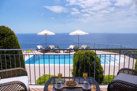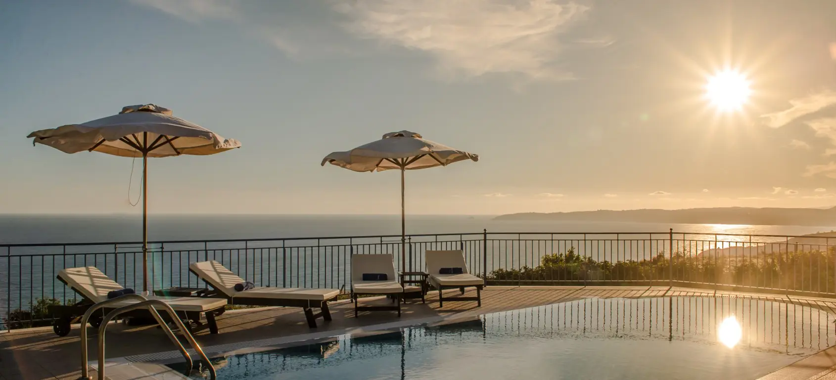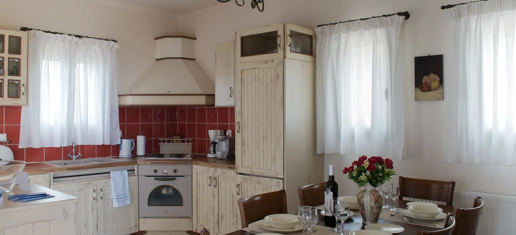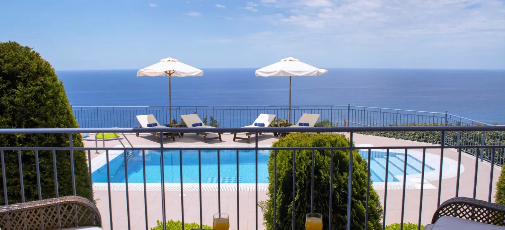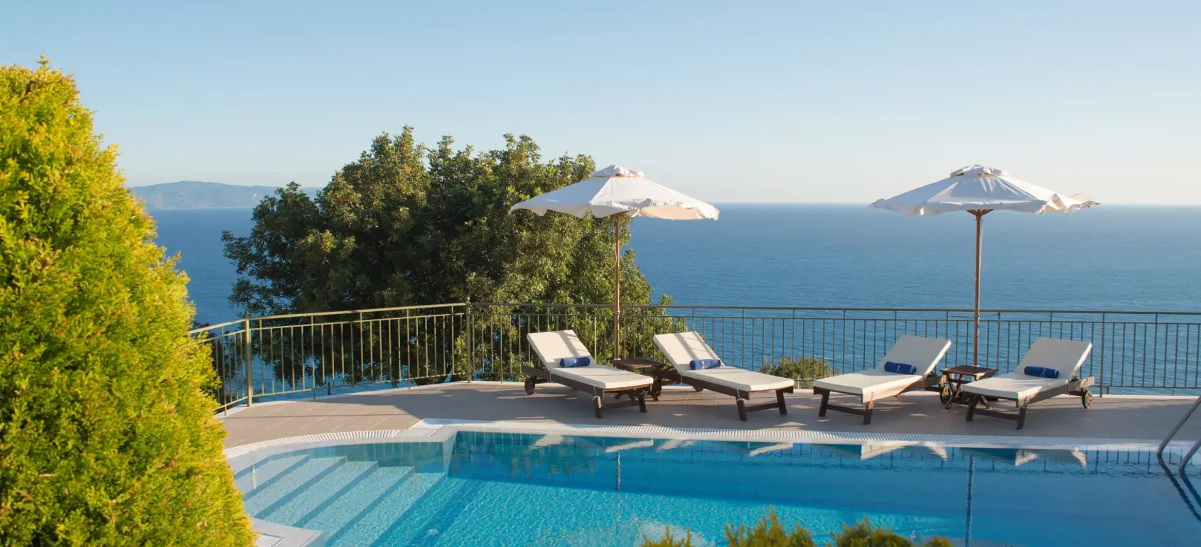 Description of the two 100 sqm villas: The ground floors include the living room and in front of the fireplace there are sofas, as well as a traditionally decorated kitchen and dining room. Moreover, there is a WC and a laundry space. The veranda with the trellis provides a table and seats and the pool area, umbrellas and deck chairs for sunbathing. At the upper floor there are two bedrooms, two bathrooms and a desk space. The bedroom with the twin size steel bed and the fly net has an internal bathroom which includes a hydro massage shower. The other bedroom, with the single beds provides a bathroom with a hydro massage bathtub. The view towards the Ionian sea, from every aspect of the villas is breath-taking during both day and night.