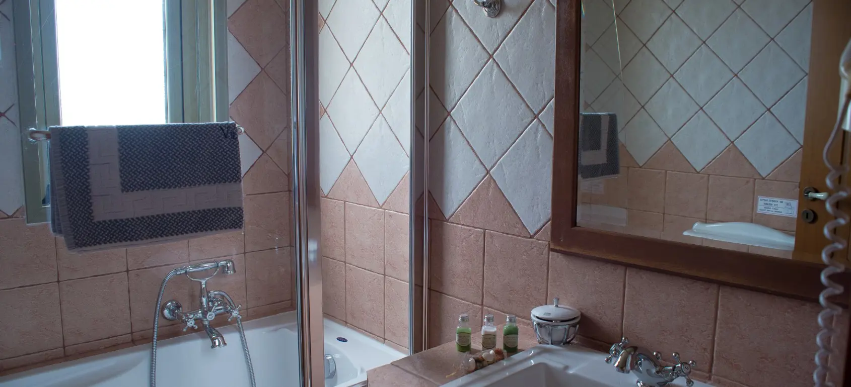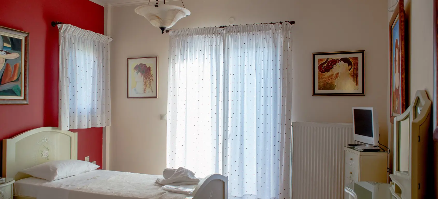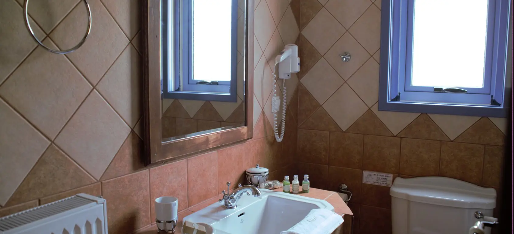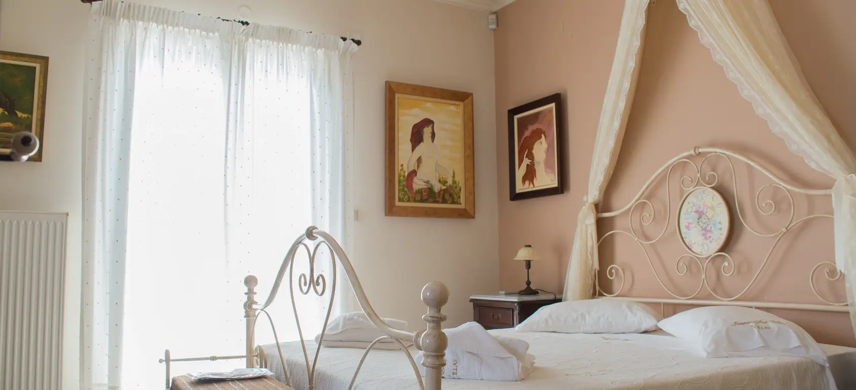 Description of the two 100 sqm villas: The ground floors include the living room and in front of the fireplace there are sofas, as well as a traditionally decorated kitchen and dining room. Moreover, there is a WC and a laundry space. The veranda with the trellis provides a table and seats and the pool area, umbrellas and deck chairs for sunbathing. At the upper floor there are two bedrooms, two bathrooms and a desk space. The bedroom with the twin size steel bed and the fly net has an internal bathroom which includes a hydro massage shower. The other bedroom, with the single beds provides a bathroom with a hydro massage bathtub. The view towards the Ionian sea, from every aspect of the villas is breath-taking during both day and night.