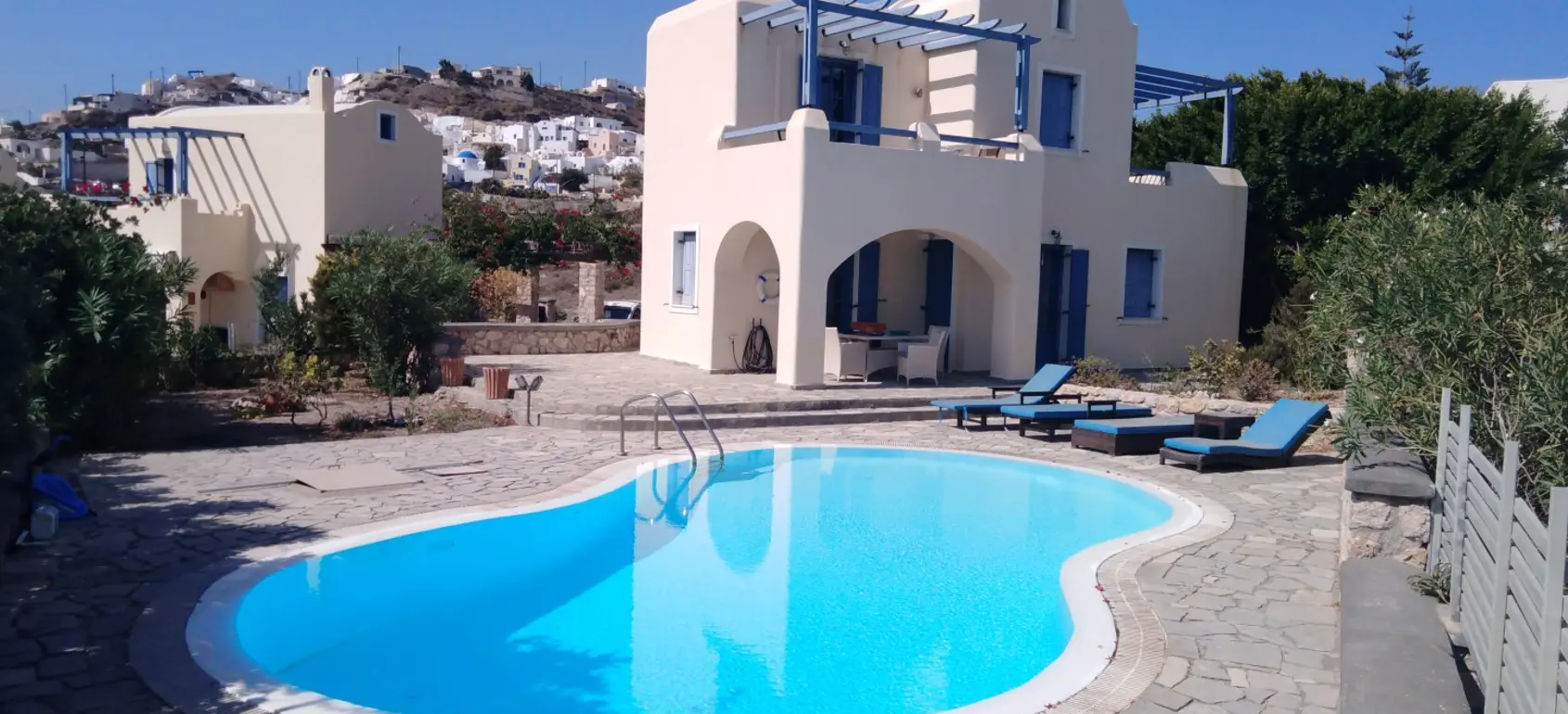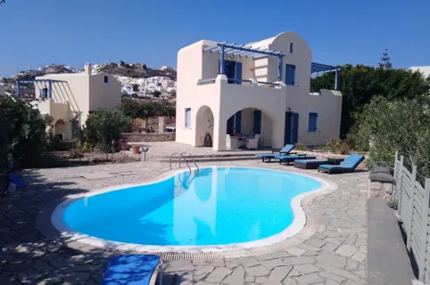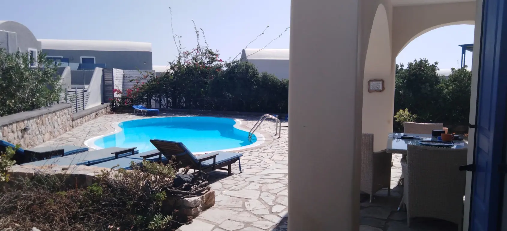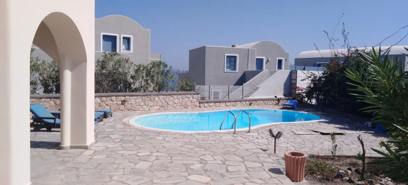Situated in a complex of houses, but remain very private with its own entrance a parking space and an outdoor swimming pool. The villa consists of two levels. On the ground floor there is an open plan full equipped kitchen, the living area, a bedroom and a bathroom. From that level you had direct access to the pool area, the garden and the bbq. On the first floor there are two more bedrooms and a bathroom. From the balcony you could relax and enjoy the caldera views.