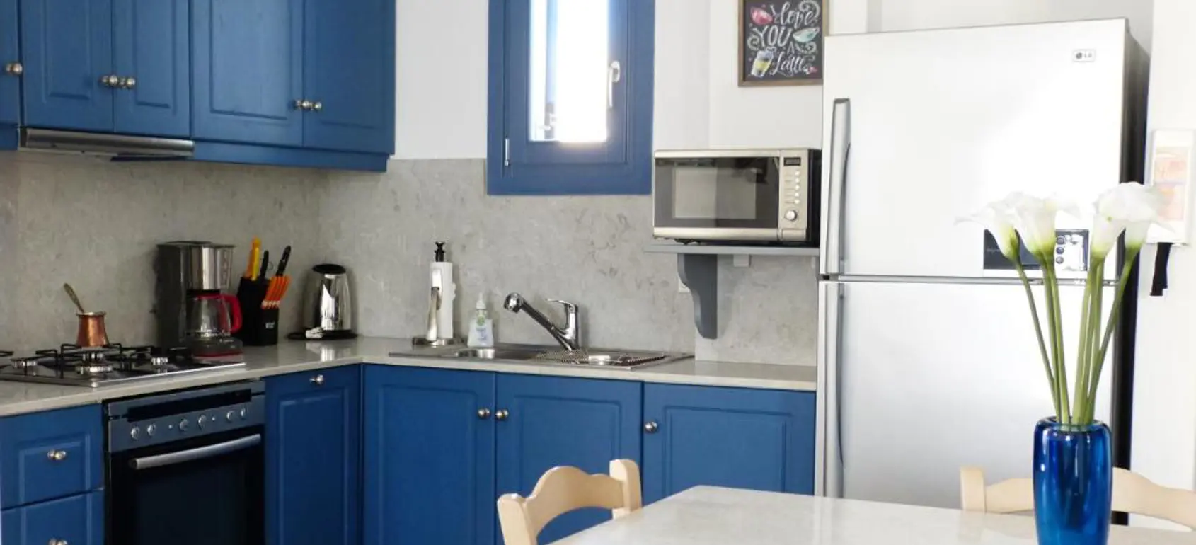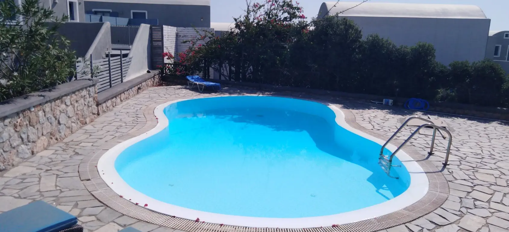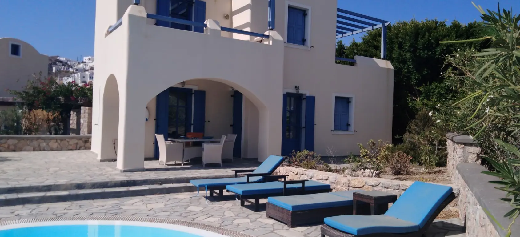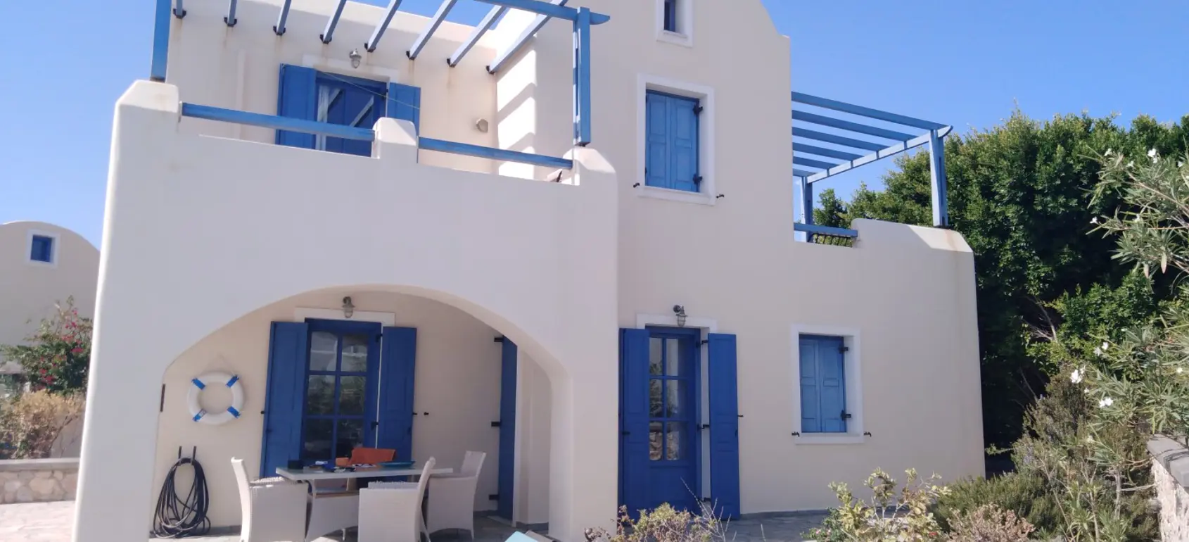 Situated in a complex of houses, but remain very private with its own entrance a parking space and an outdoor swimming pool. The villa consists of two levels. On the ground floor there is an open plan full equipped kitchen, the living area, a bedroom and a bathroom. From that level you had direct access to the pool area, the garden and the bbq. On the first floor there are two more bedrooms and a bathroom. From the balcony you could relax and enjoy the caldera views.