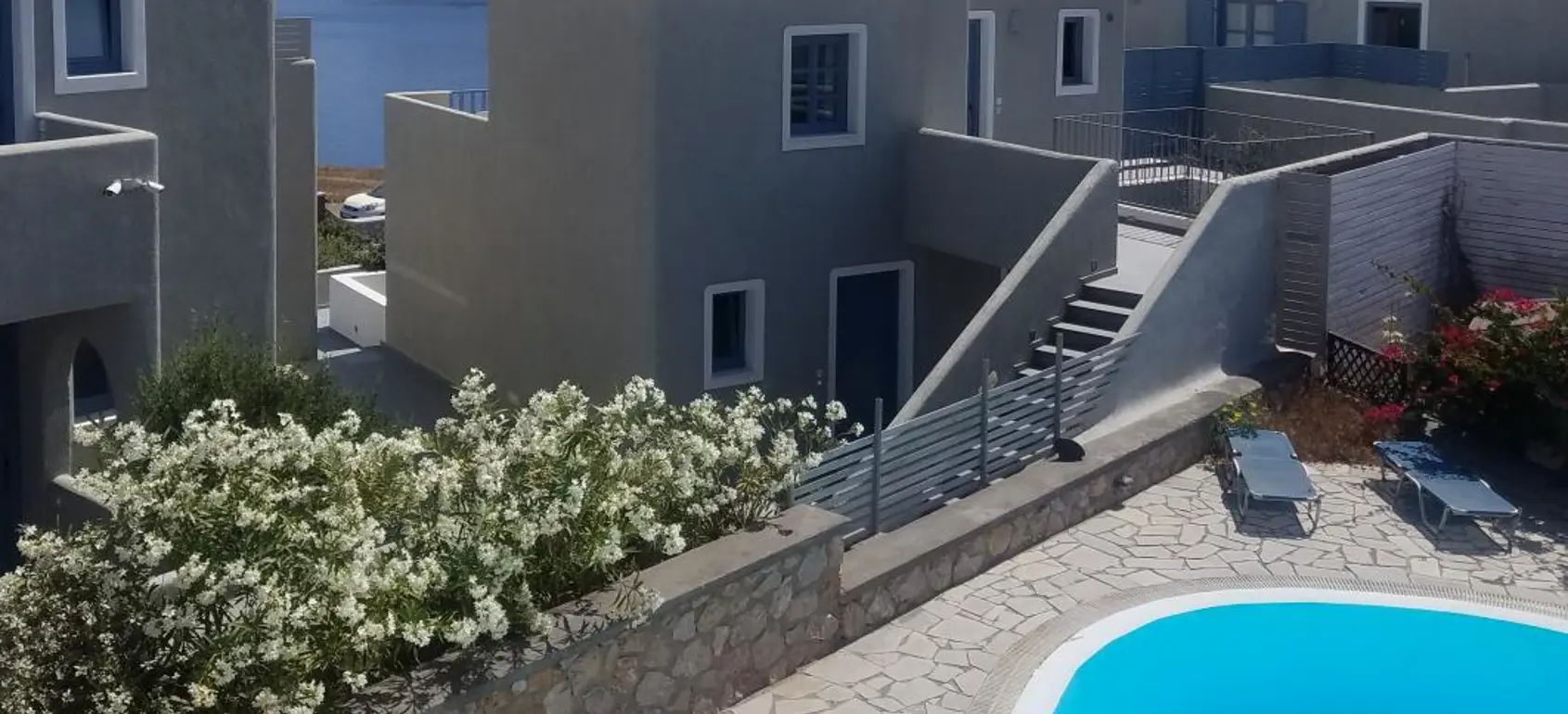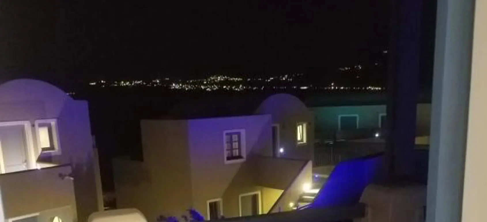 Panoramic views properties of the azure Aegean Sea and the world-famous Santorini sunset