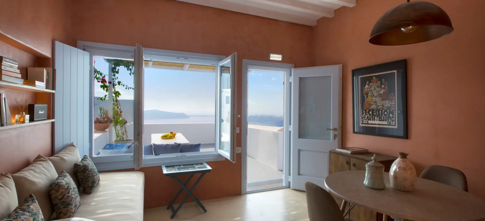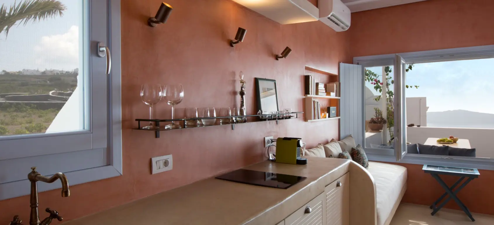 Santorini always was and still remains one of the foremost tourist attractions of the Aegean Sea. The famous Santorinian sunset, considered by many as one of the most beautiful in the world, keeps tourists flocking down to the castle, waiting for the moment when the sun slips down on the calm sea of the caldera. Located in one of the most central location of Santorini, these suites overlooks the volcano and everything in this suite feels as if it is made by a gifted hand, aiming to transfer the sense of Santorini's supernatural to every guest.
