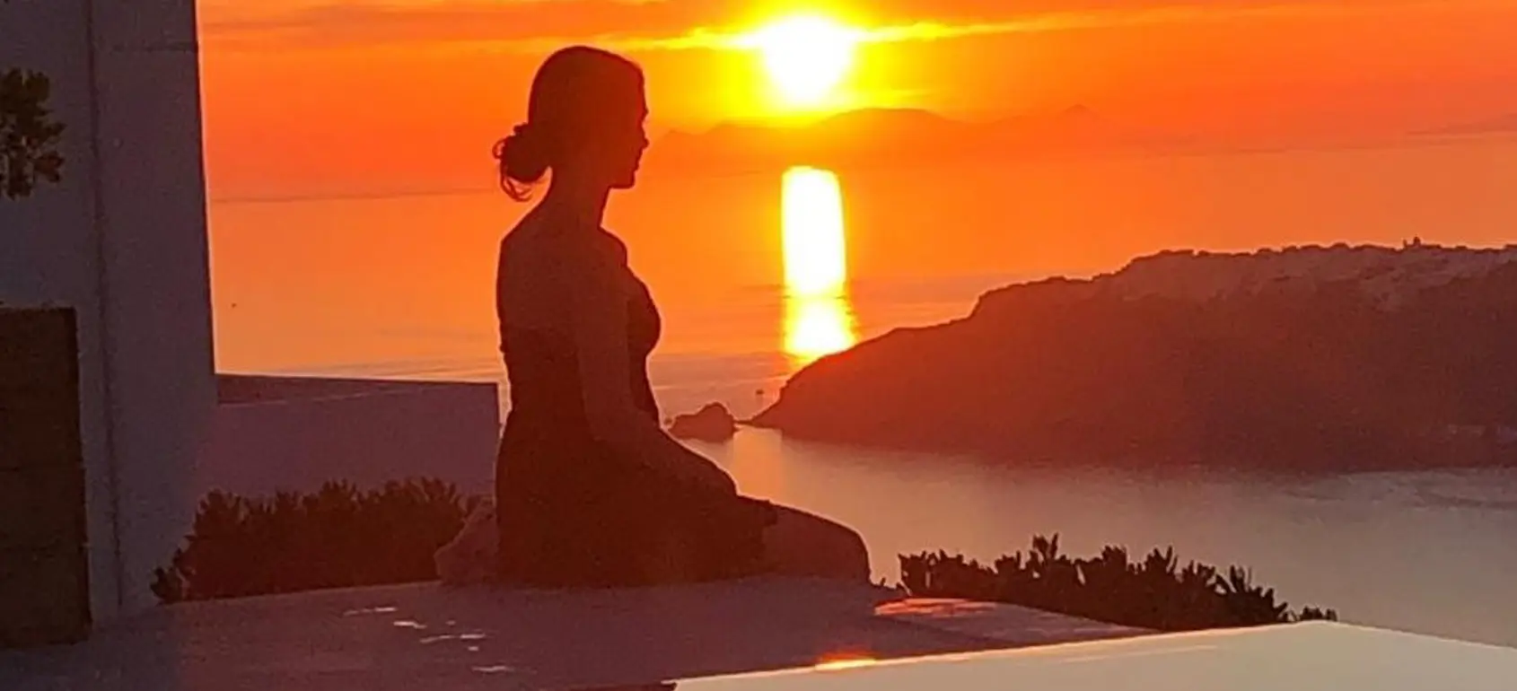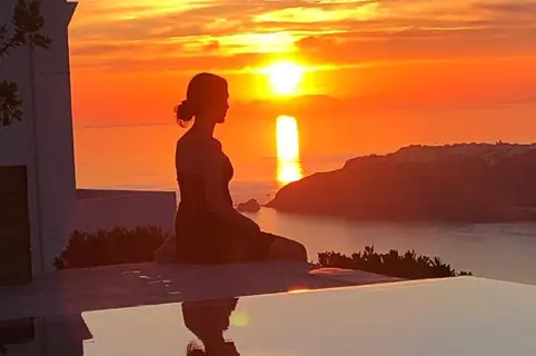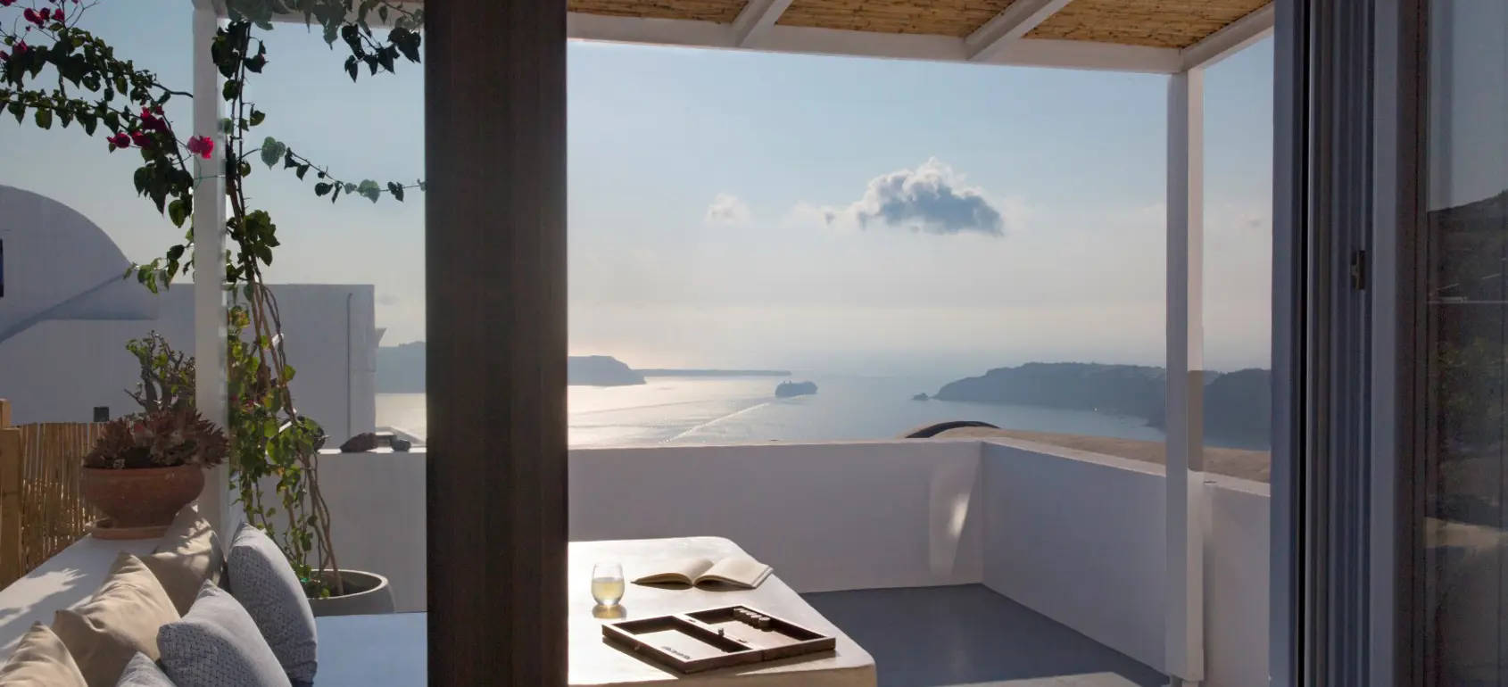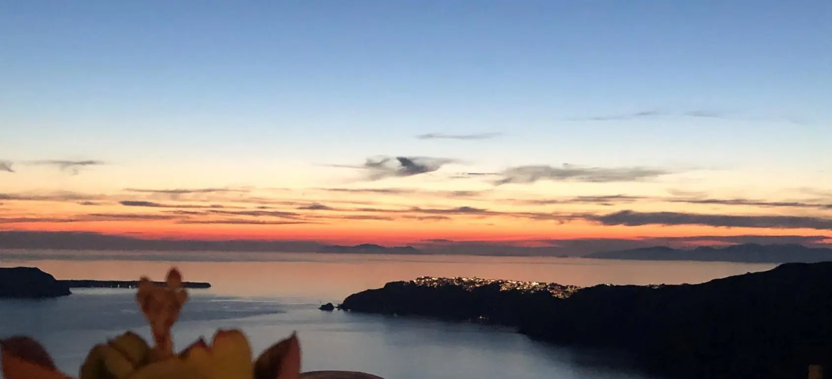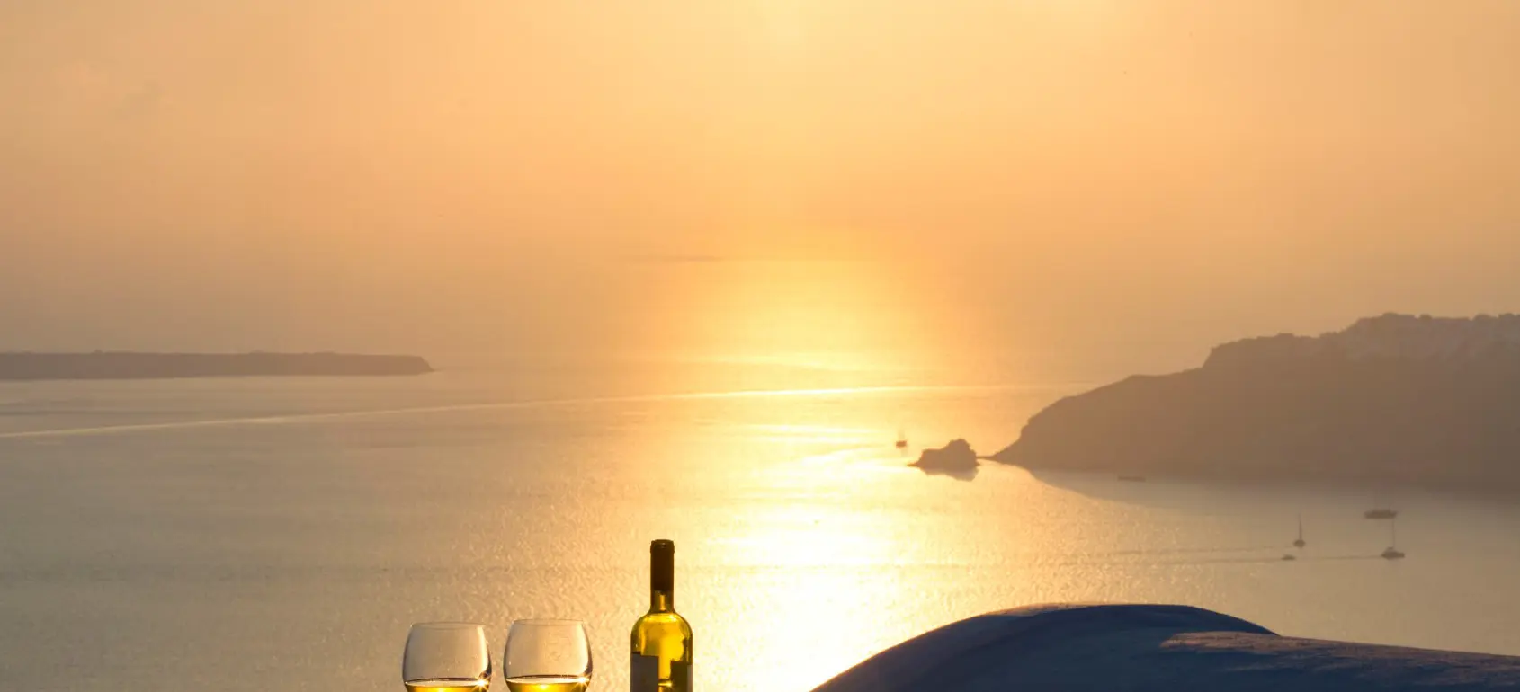 Panoramic views properties of the azure Aegean Sea and the world-famous Santorini sunset