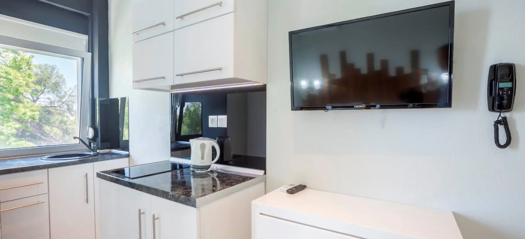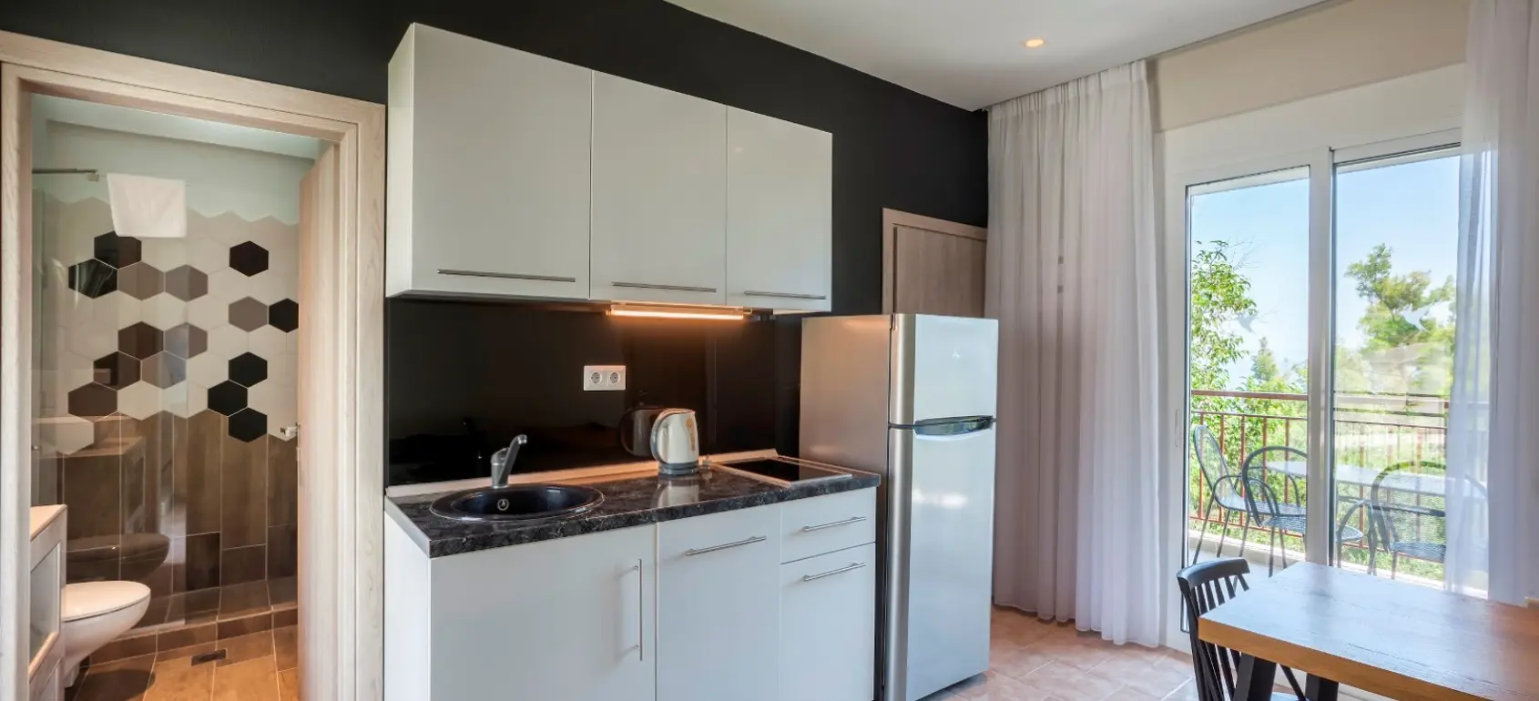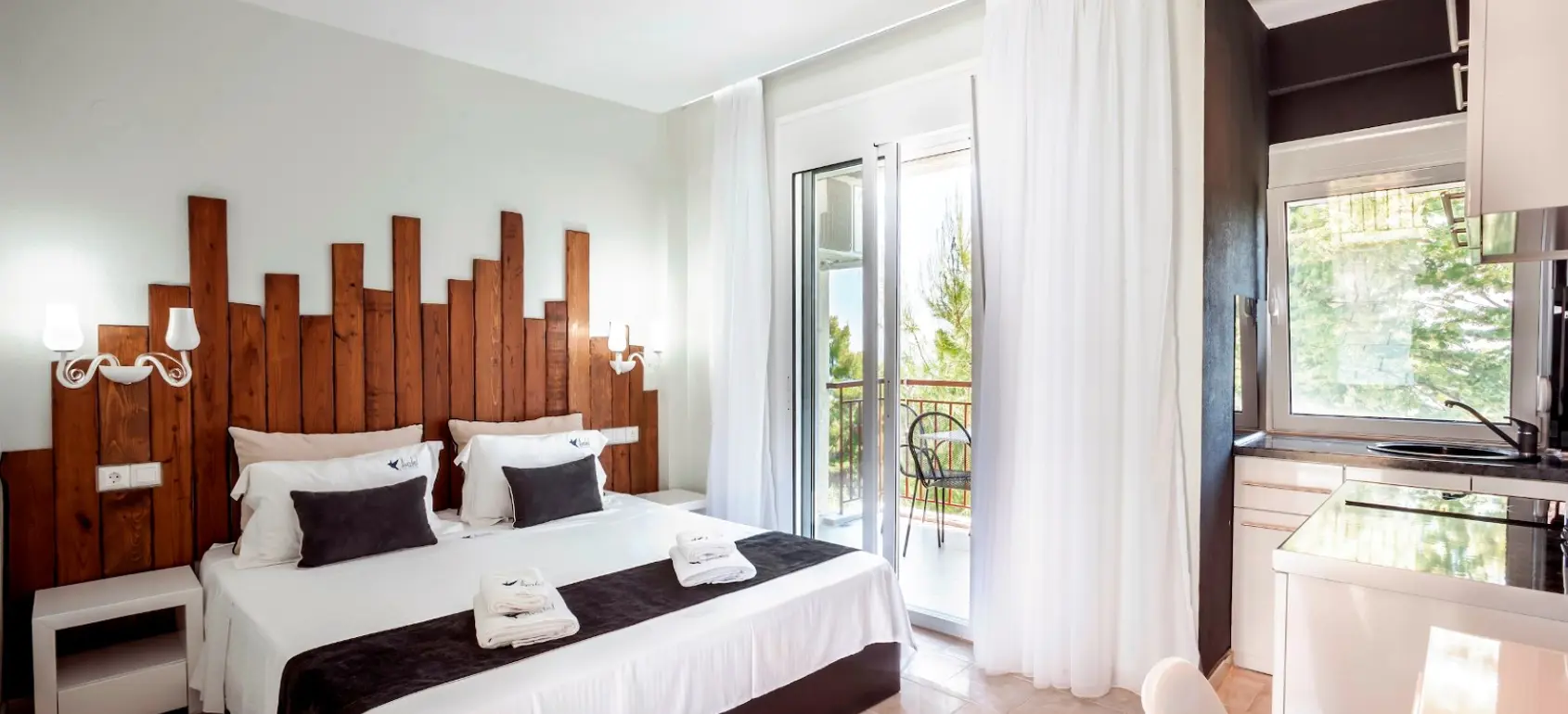 29 rooms can accommodate up to 104 guests – 4 Deluxe Suites with 2 bedrooms, 14 Family Deluxe and 11 Double Deluxe. The interior of the hotel's rooms, unique eco-style, perfectly complements with up-to-date equipment that has become an integral part of our everyday life. All rooms are equipped with modern furniture and appliances, shower units and necessary accessories, and have access to a terrace/balcony, which offers a wonderful view of the sea (most of the rooms), fairy-tale forest or the picturesque territory of the hotel with garden and pool. Each room has WiFi internet access and a kitchenette with stove, sink, fridge and an individual set of dishes.