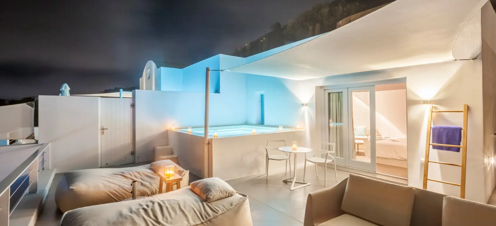 Panoramic views properties of the azure Aegean Sea and the world-famous Santorini sunset