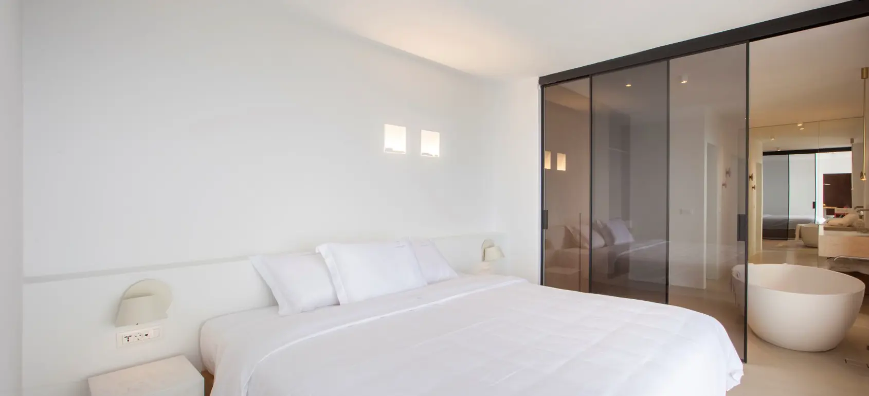 The main (315 sq.m) residence consisting of 3 bedrooms, two of them with private plunge heated pool with jets, 5 bathrooms, kitchen-dining room, cellar, living room, laundry, staff room, heated infinity swimming pool, BBQ area, gardens, vineyard, ample parking space, etc. The upper residence (100 sq.m) is a totally autonomous and exclusive with large sliding window type doors of 17m long openings and spectacular bird eye uninterrupted views. It includes a large living room-kitchen-dining room, two bathrooms, 2 WC, a large bedroom, its own infinity heated pool, external verandas and its own chambermaid-staff room and parking space.