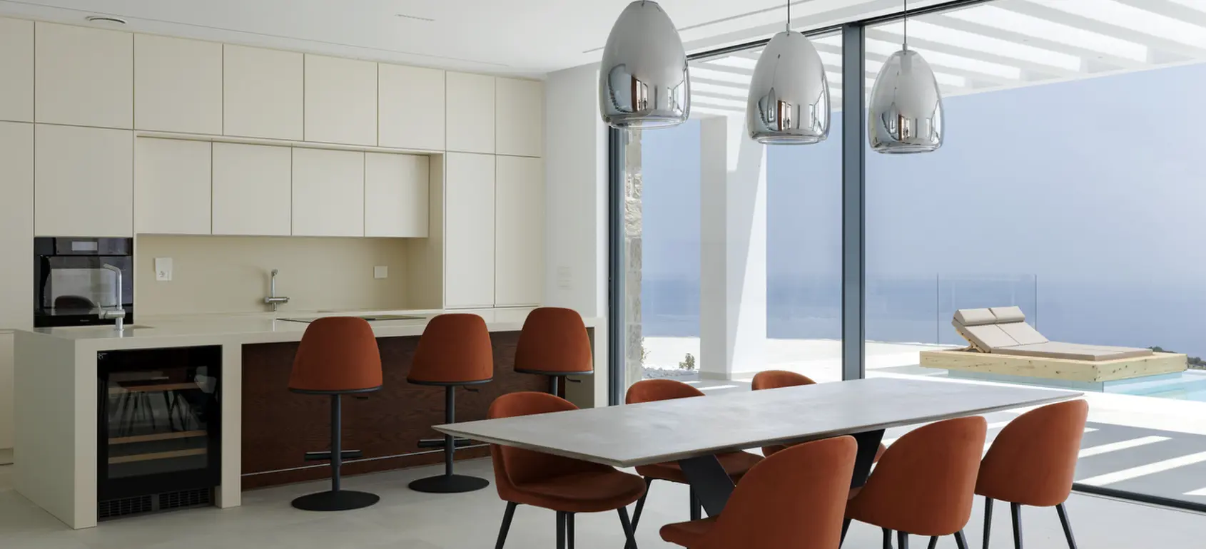 The house is delivered with built-in electrical appliances (Miele: 2 refrigerators, 1 oven, 1 induction hob with built-in extractor hood & Liebherr: 2 refrigerators), wardrobes and kitchen furniture, beds & mattresses (Media Strom: Optimum Platinum & Prime Discover Premium), luxury Italian furniture (dining table with chairs, bar chairs and chairs for the bedroom desks) but without furniture of the living room shown in the photorealistic designs.
