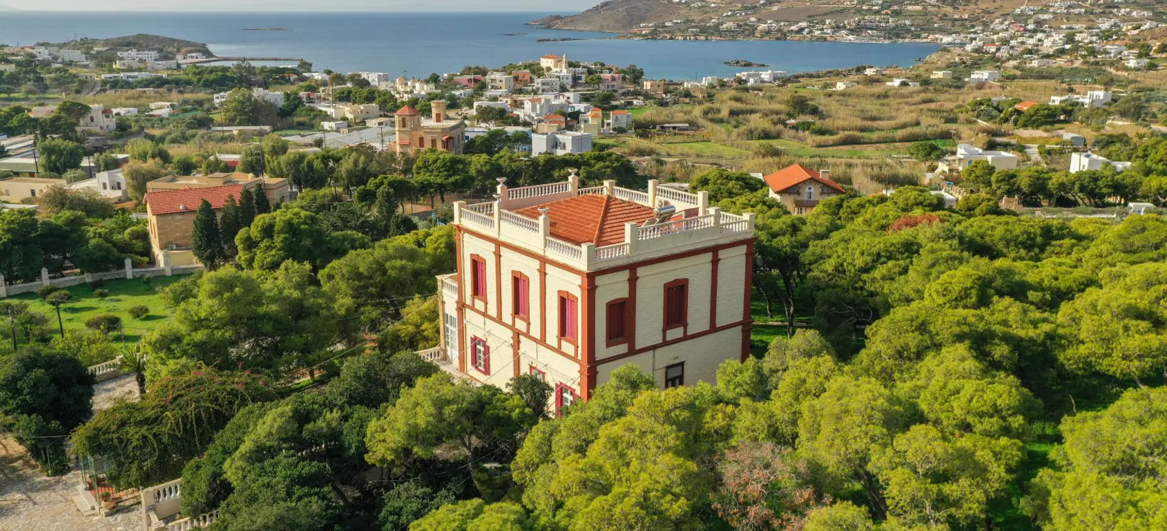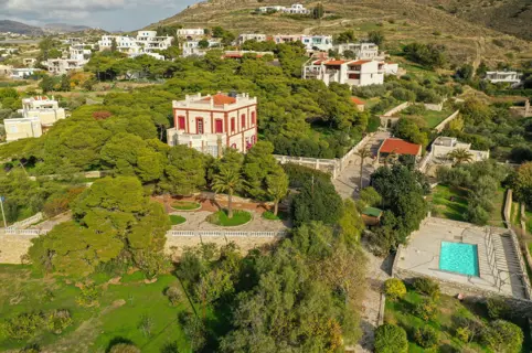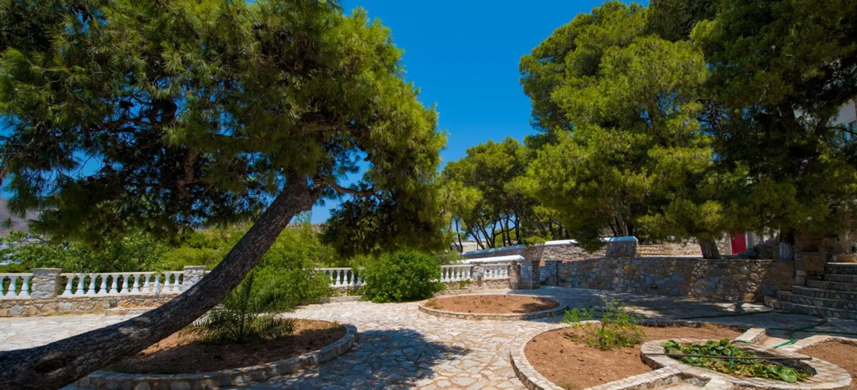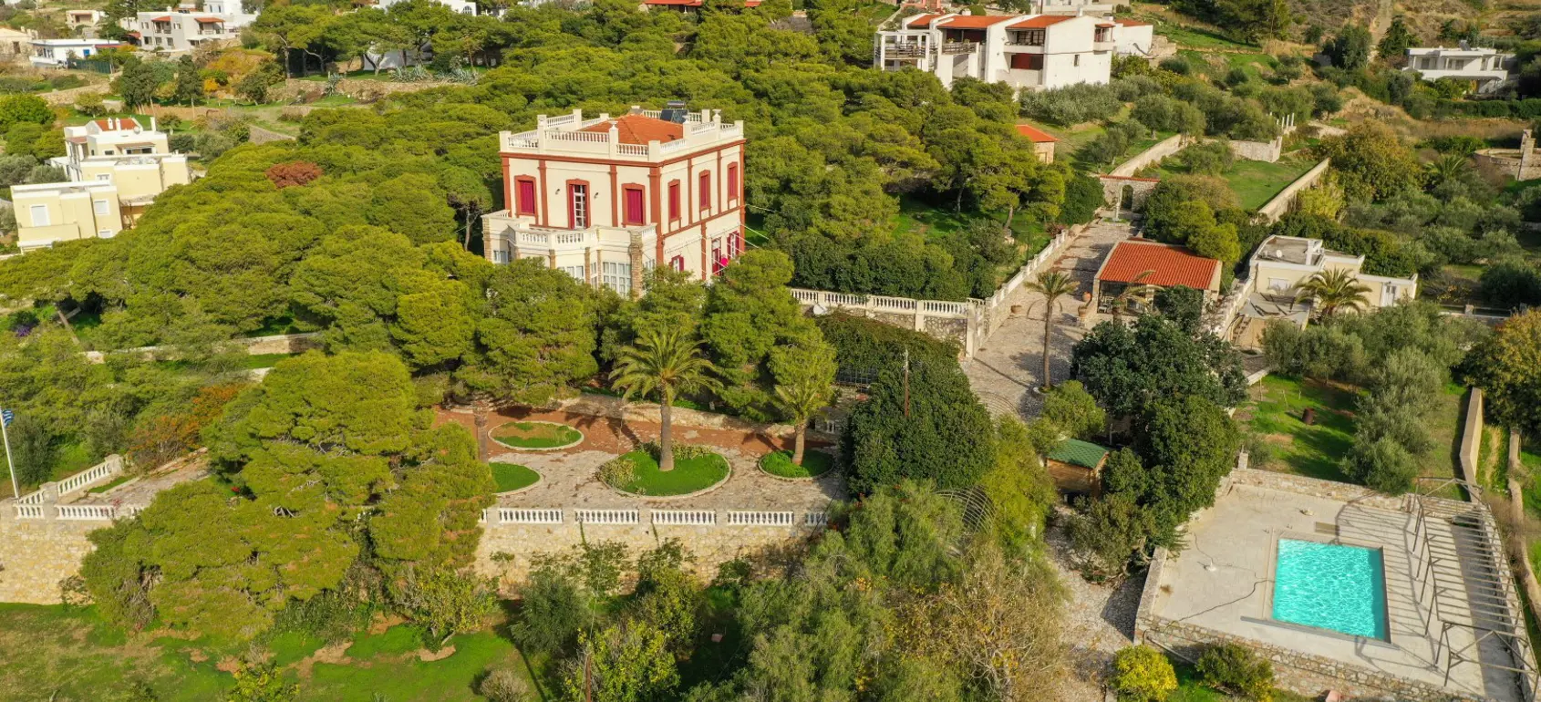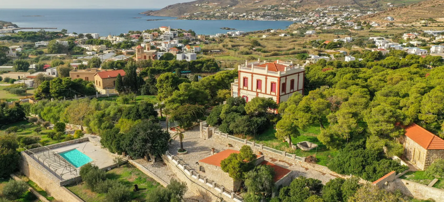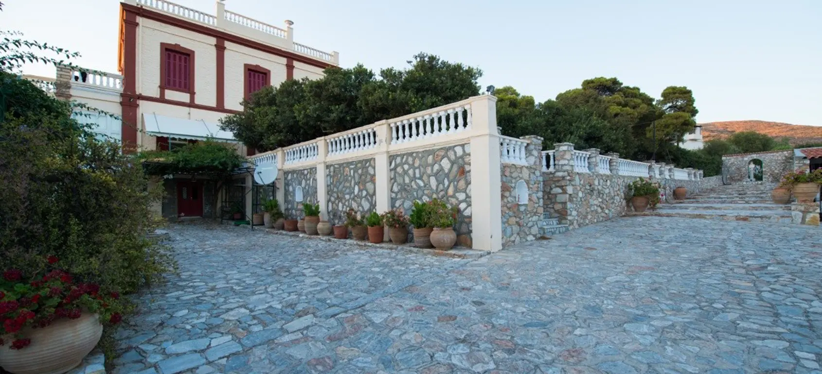 Built in 1835 in the village of Poseidonia by one of the leading and most respected families of the island and used as a summer house, it has been constantly lived in since then by direct descendants of the family. The house, set in beautiful and secluded gardens with many trees, is in the centre of this much sought after and charming village on the south west coast of the island, and is well known for its historical houses owned by ship owners, industrialists and politicians; its tranquillity and excellent beaches.