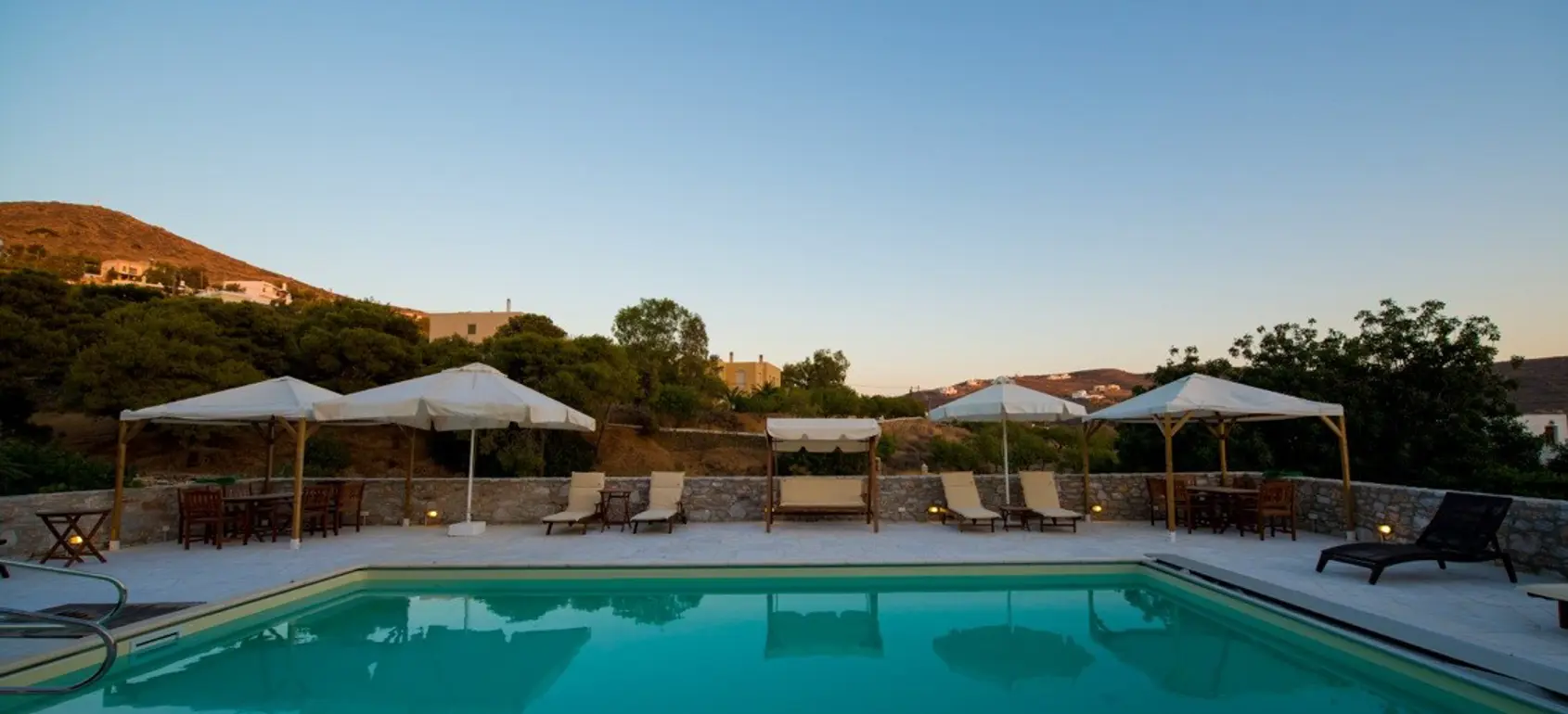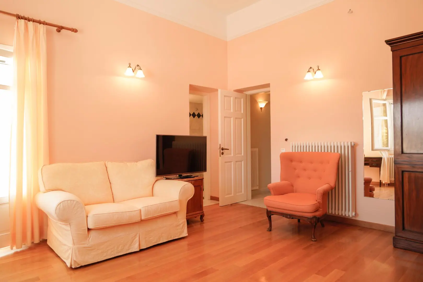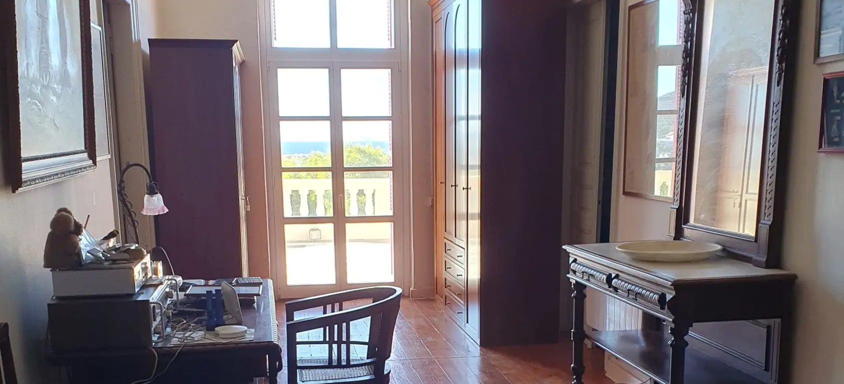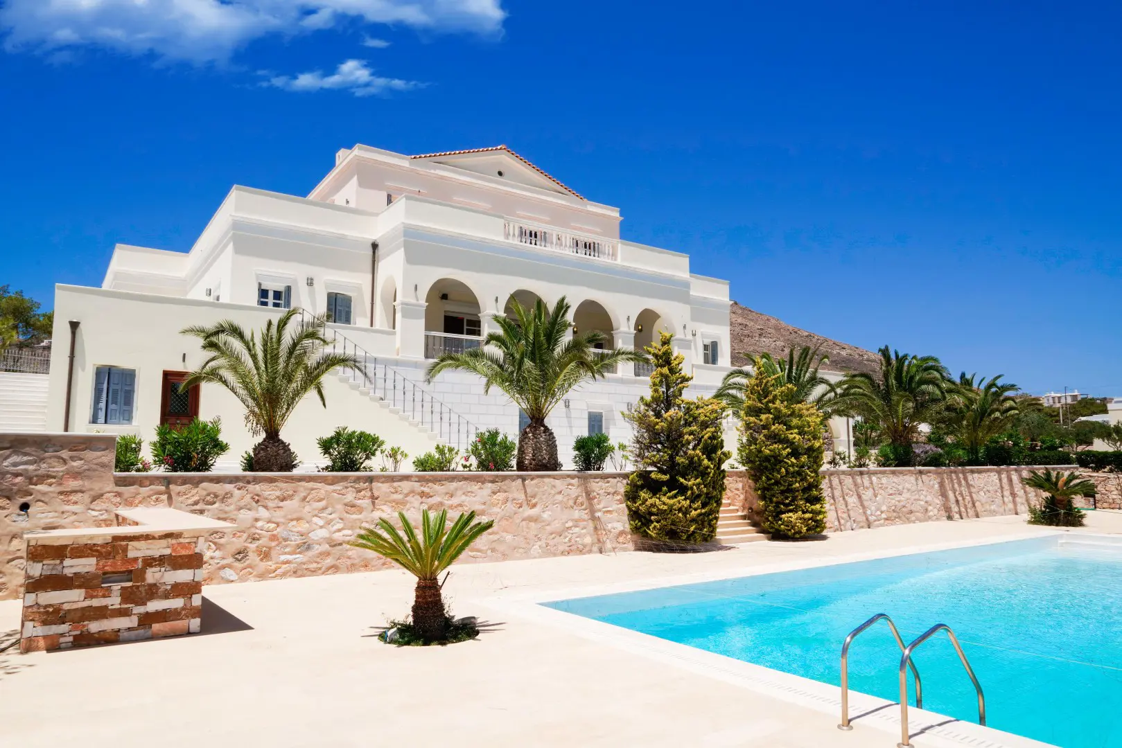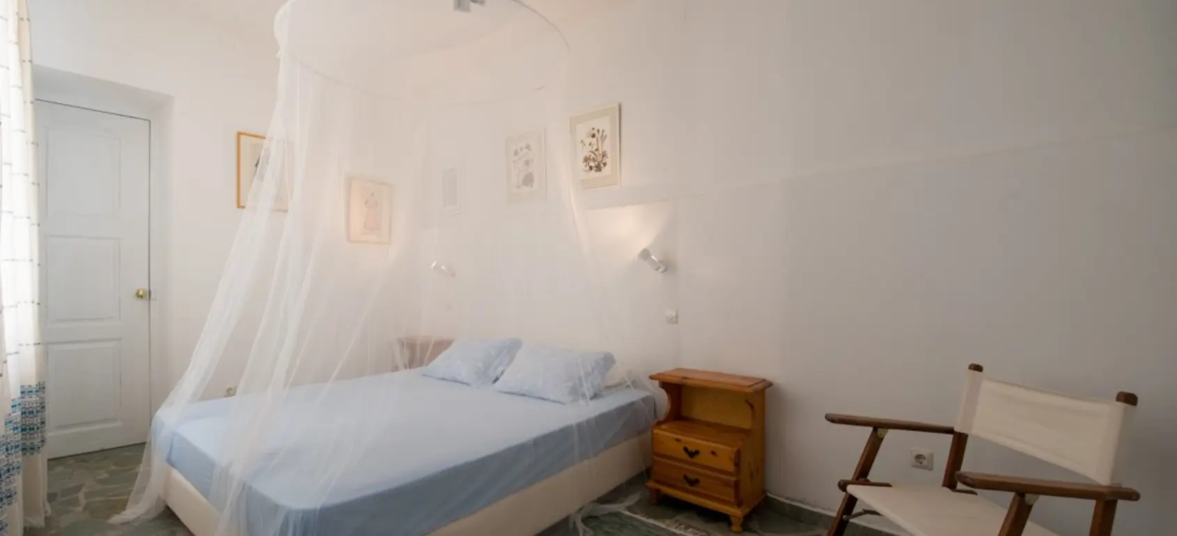 Built in 1835 in the village of Poseidonia by one of the leading and most respected families of the island and used as a summer house, it has been constantly lived in since then by direct descendants of the family. The house, set in beautiful and secluded gardens with many trees, is in the centre of this much sought after and charming village on the south west coast of the island, and is well known for its historical houses owned by ship owners, industrialists and politicians; its tranquillity and excellent beaches.