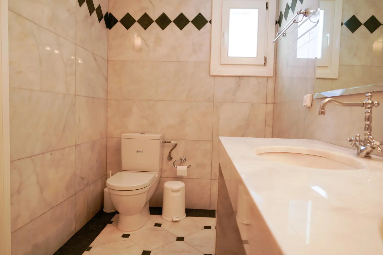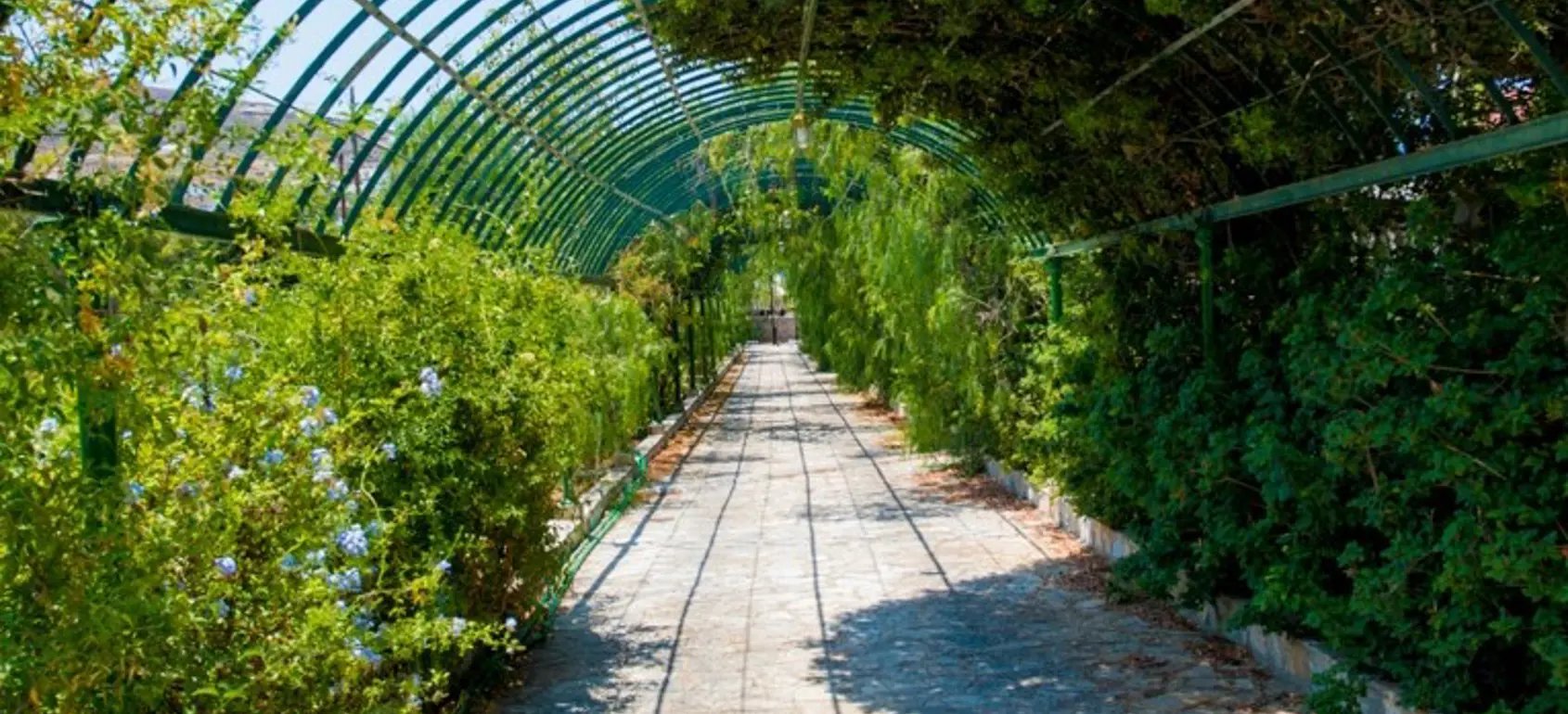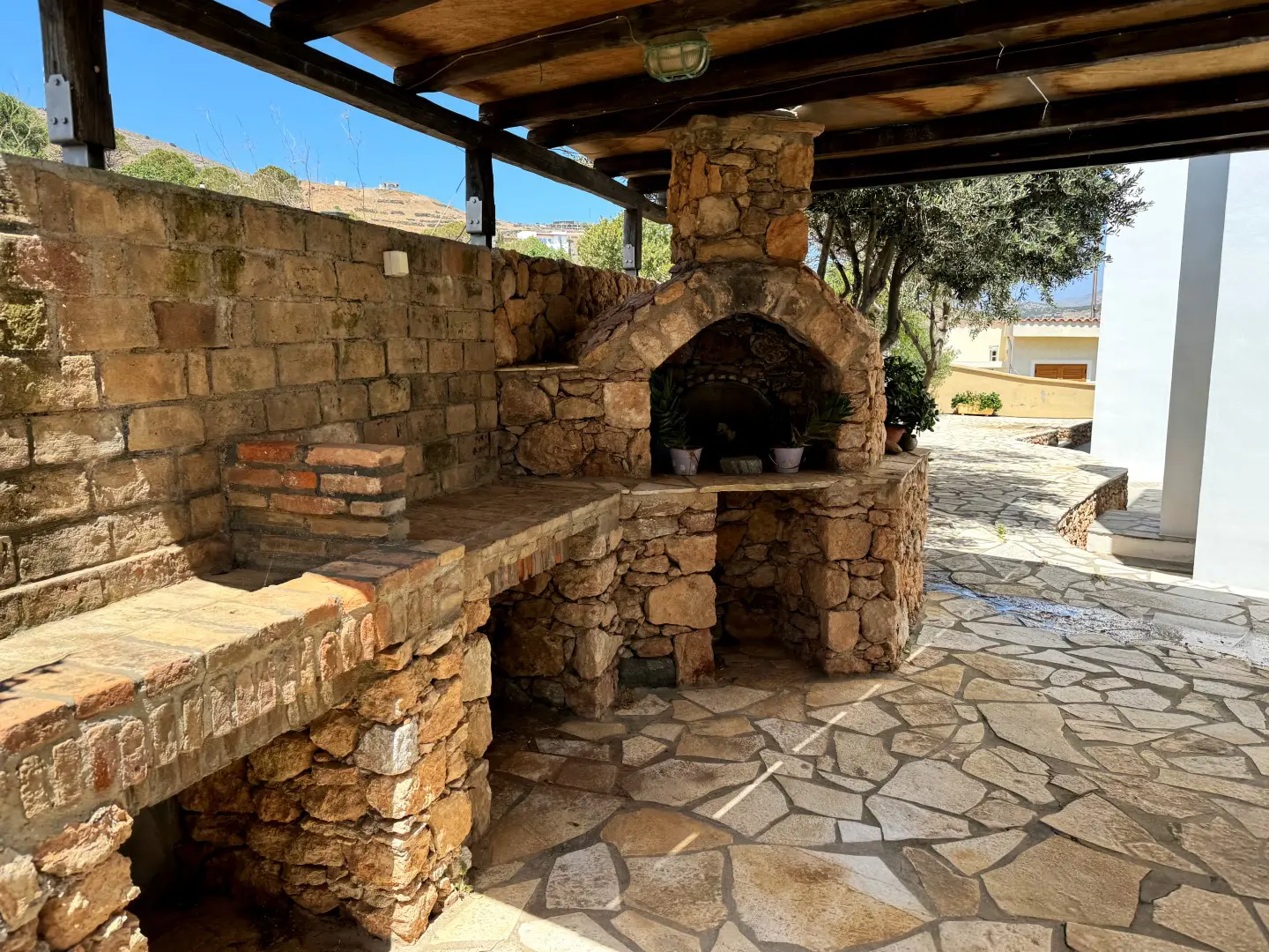 The house is set in 12,000 sq.m (3 acres) with many pine, olive, orange, mandarin, lemon, fig, pomegranate, pistachio and kidonia trees. Magnificent paved terrace with flower beds and palm trees. All driveways and paths are paved. Original wrought iron entrance gates, driveway pergola and arbour. 2 car garage with wrought iron gates. Fully renovated basement for storing equipment and large kitchenette with cloakroom (wc and basin).