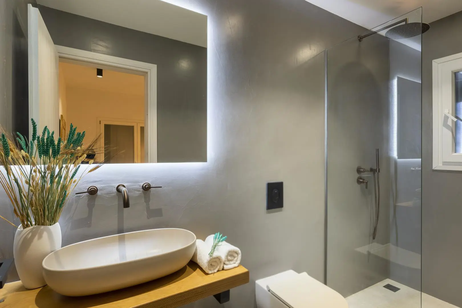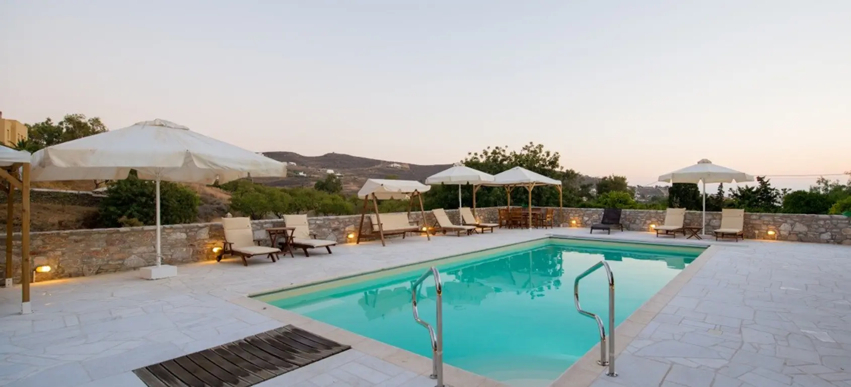 Swimming pool: pool 10m x 5m with a spa in one corner and electric cover. Large fully paved terraces around the pool (Naxos marble), with many awnings for shade and pool furniture. Small wooden hut for swimming pool electrical equipment with fridge and storage cupboard. Equipment has been installed for heating pool, not connected. There are external lights for the driveways, paths and main terrace and 4 floodlights for the house.