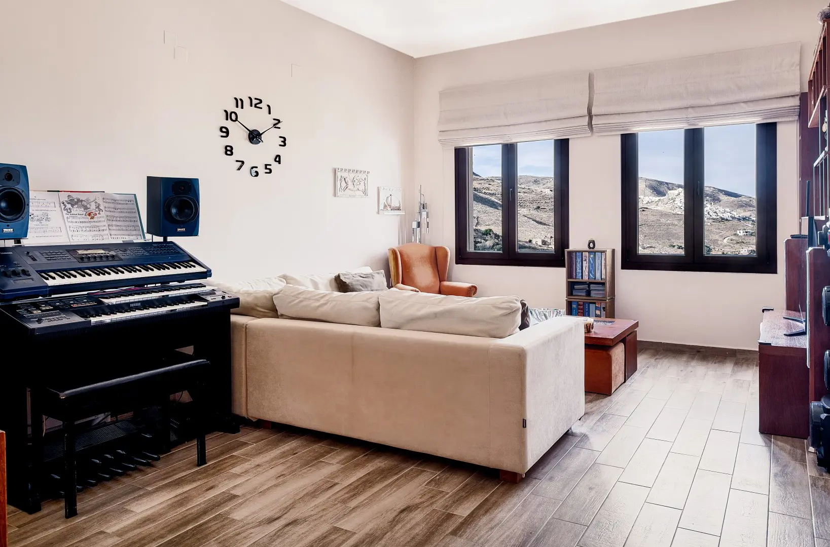 The house has been fully renovated and all original features retained. It has been completely rewired with 3 phase and night saving electricity. Solar heating for water and thermostatically controlled electric wall panels for heating. Mains water and large sterna under the conservatory, main well, 18m depth with pump for watering. All windows, shutters and external doors renewed with security glass and mosquito blinds. Full security system with 6 cameras and alarm, electronic main gates.