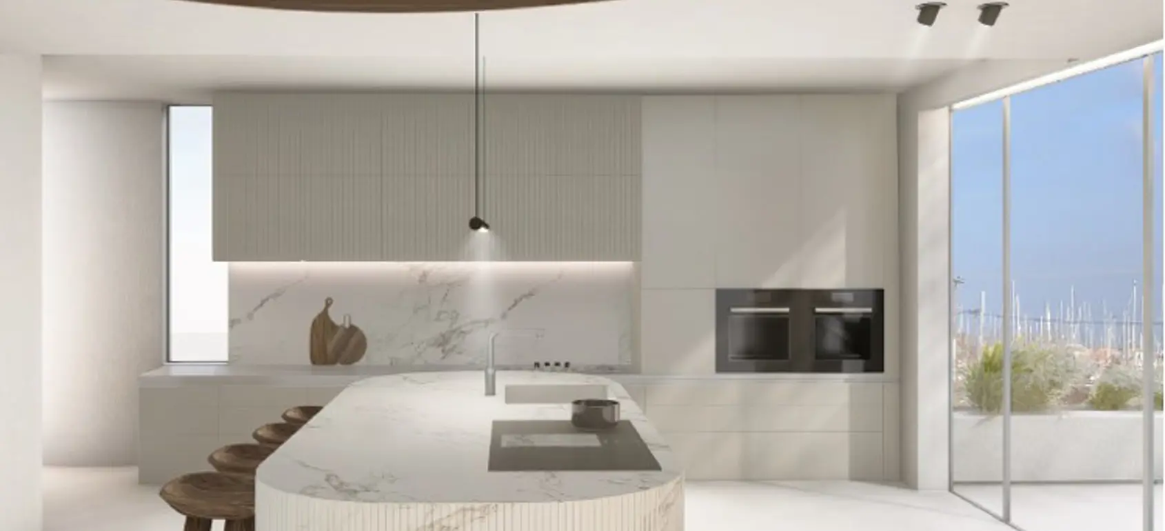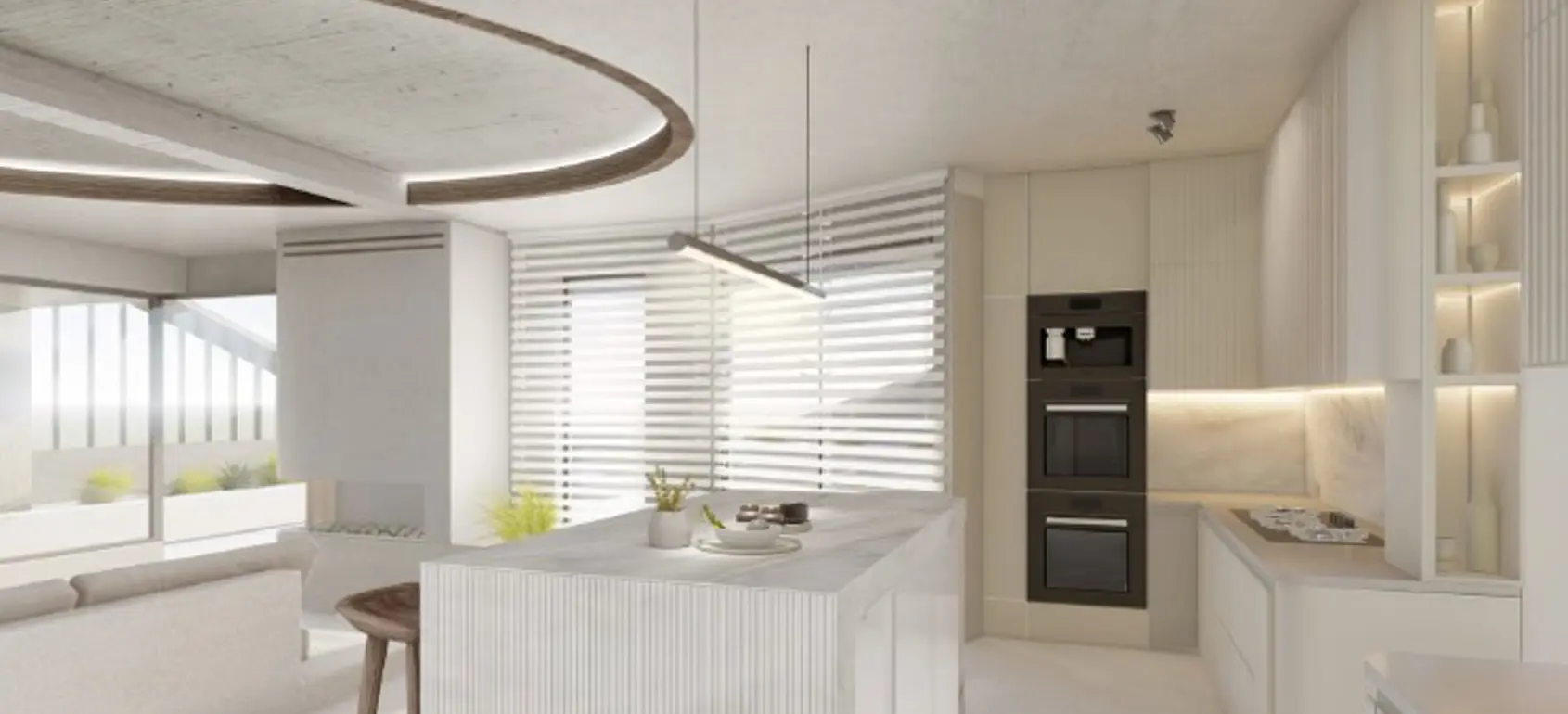 Kitchen and dining area. - Massive kitchen island from white Marble - Tractor stools- BASSAMFELLOWS -Flat-panel light gray cabinets - Openings of the upper cabin elements are partically made from Cement fibre boards - Nickel Tap - Wall behind kitchen cabinets is covered with Macael White Marble. - Elipse slice element divided with the concrete beam on the ceiling with the Led light on the edges.